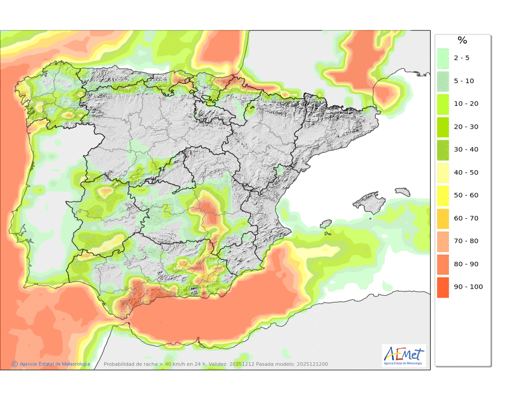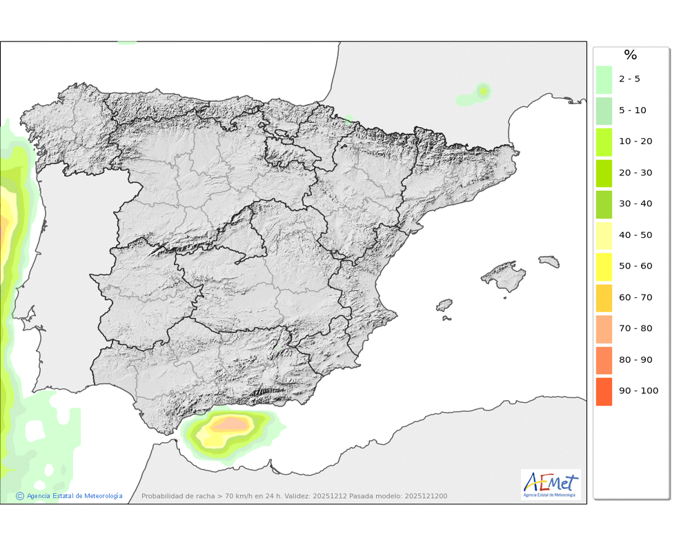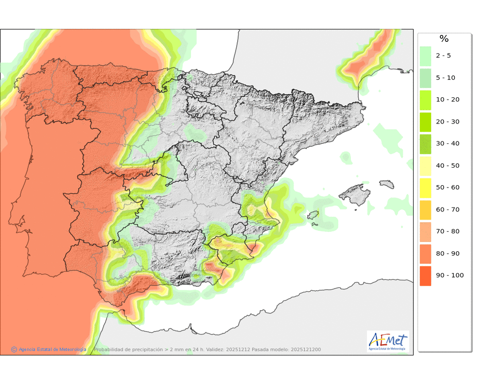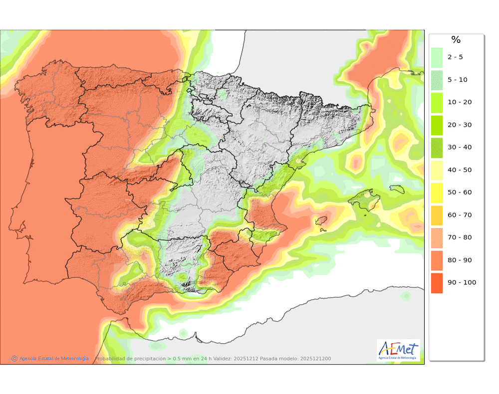 Probabilidad de precipitaciones débiles de carácter disperso y ocasional. Cota de nieve: 1700-1900 metros.