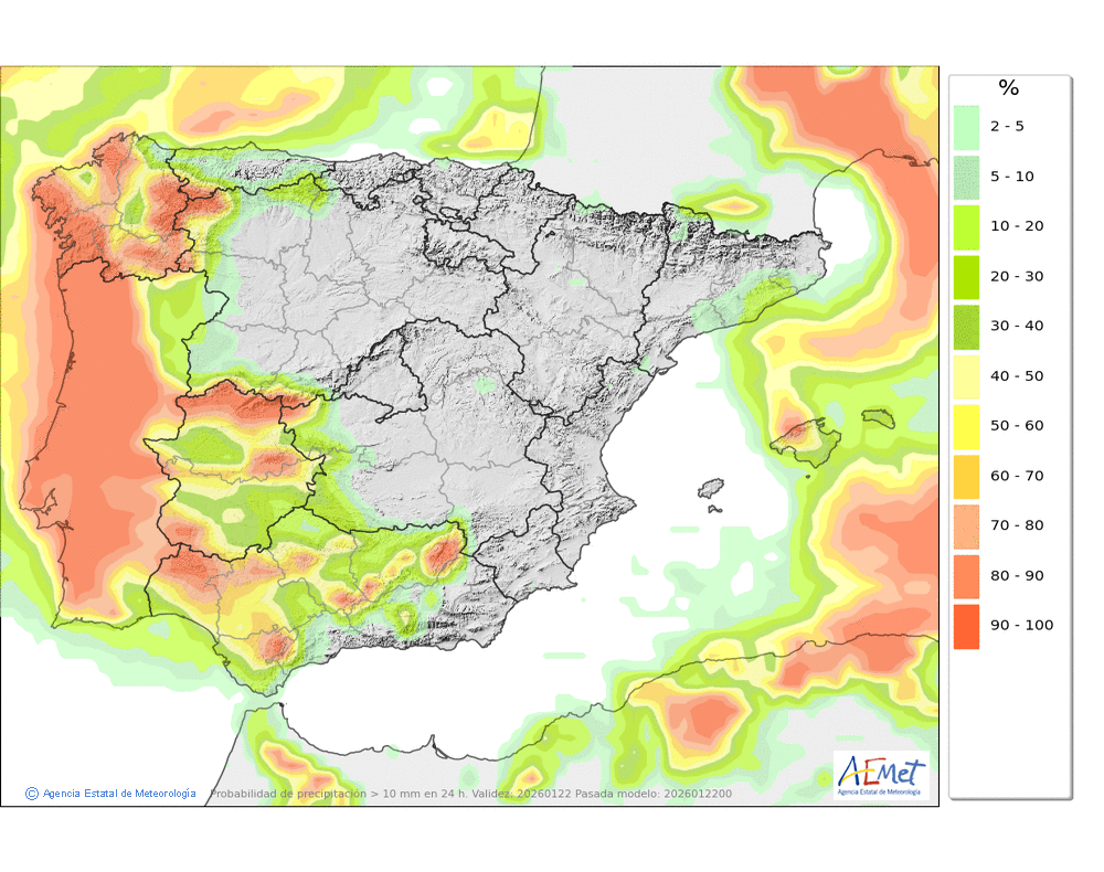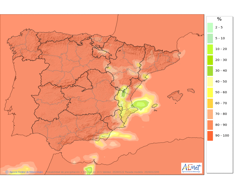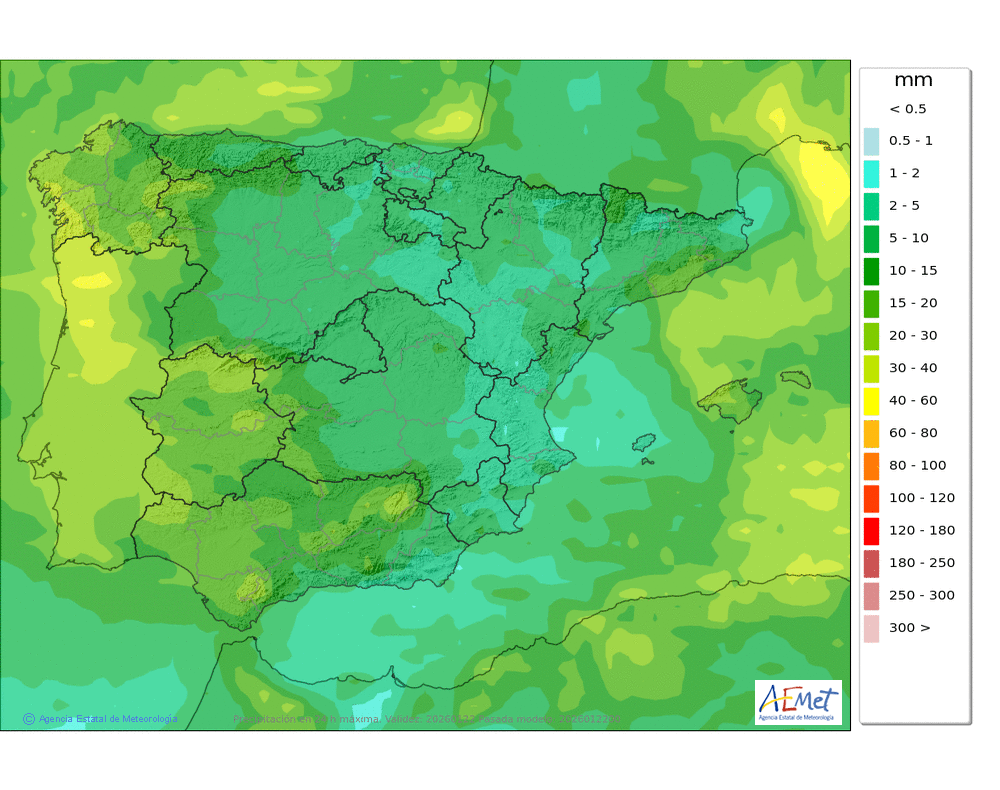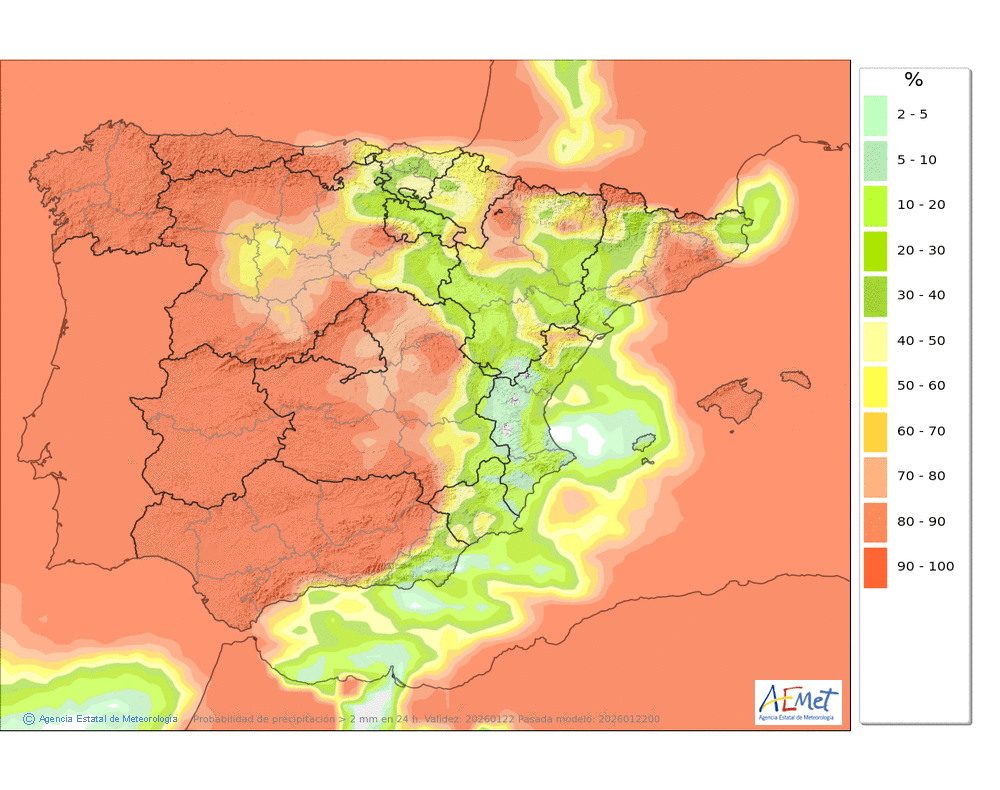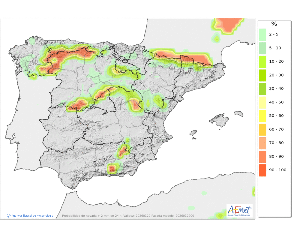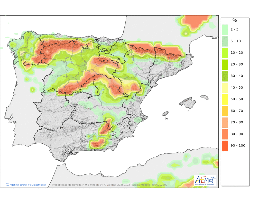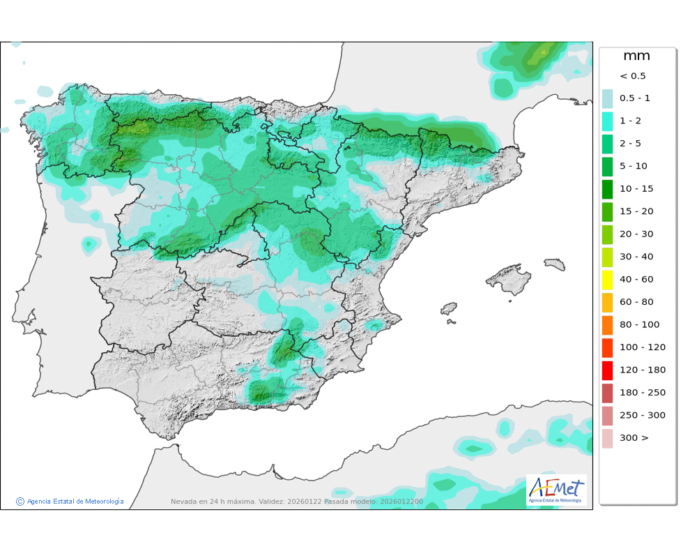 Probables débiles o localmente moderadas a primeras y últimas horas. Cota de nieve: en torno a 1000-1200 metros, subiendo al final del día a 1400-1600 metros.