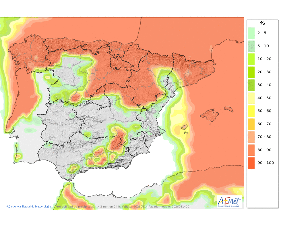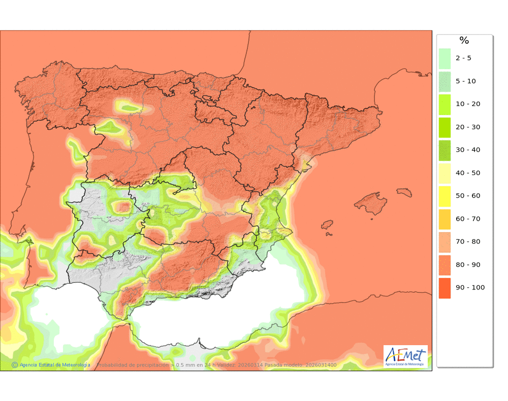 Se esperan precipitaciones débiles o localmente moderadas, en ocasiones en forma de chubascos, que serán más frecuentes en Tierra de Cameros y sierra de la Demanda y más intensas en la primera mitad del día. Cota de nieve: bajando de 1800 a 1000-1200 metros en horas centrales.