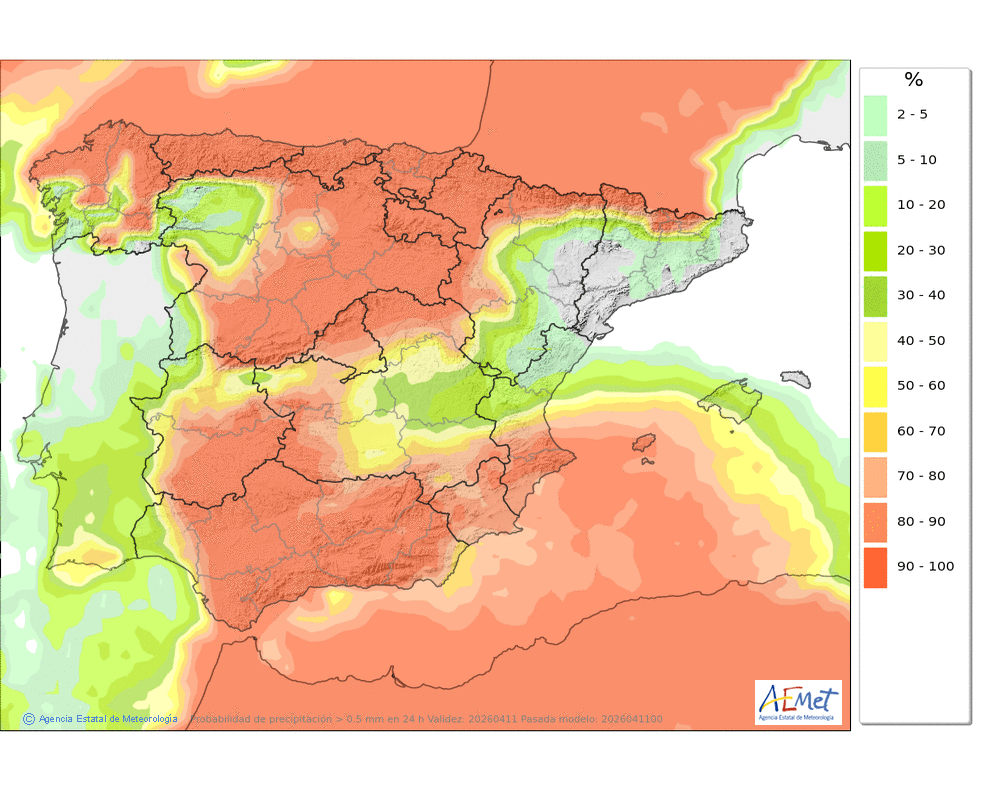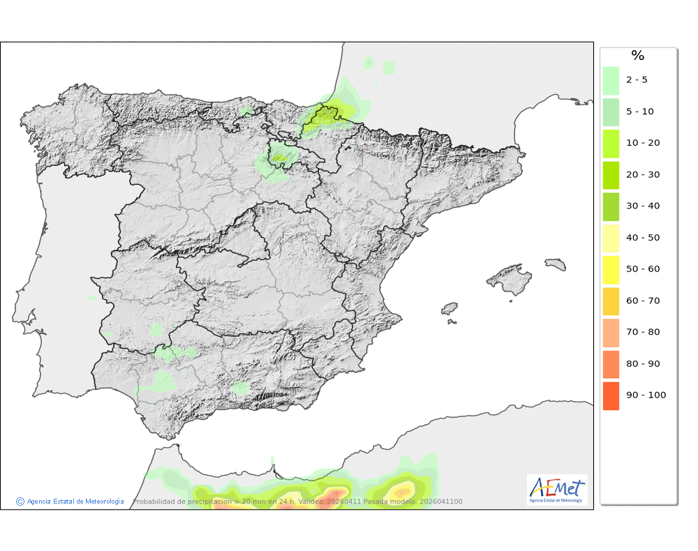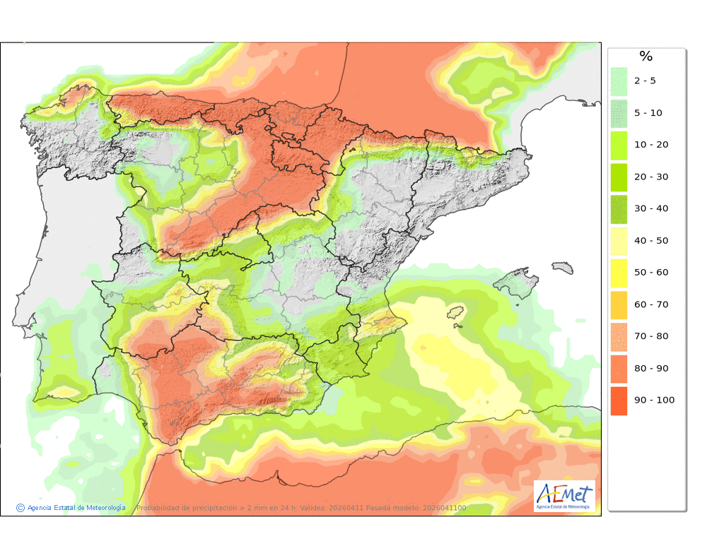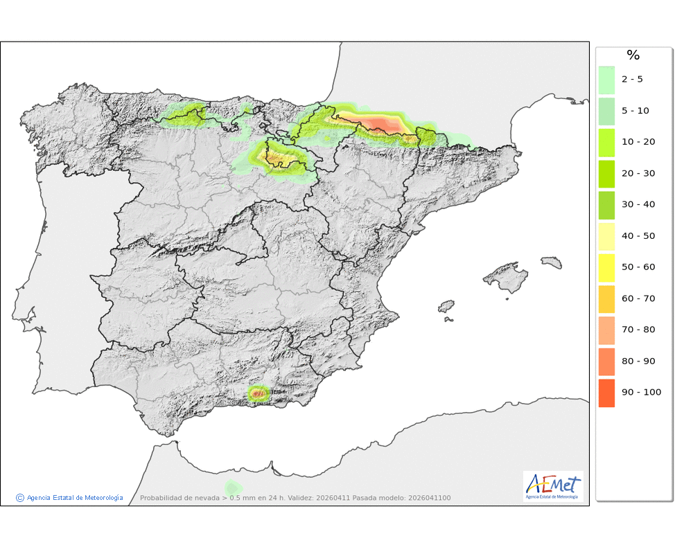 Se esperan precipitaciones débiles o moderadas durante la segunda mitad del día, que podrán ir acompañadas de barro. Cota de nieve: tenderá a ir bajando de oeste a este al final del día, probablemente hasta unos 2.000 metros, pudiendo descender abruptamente en caso de precipitación intensa.