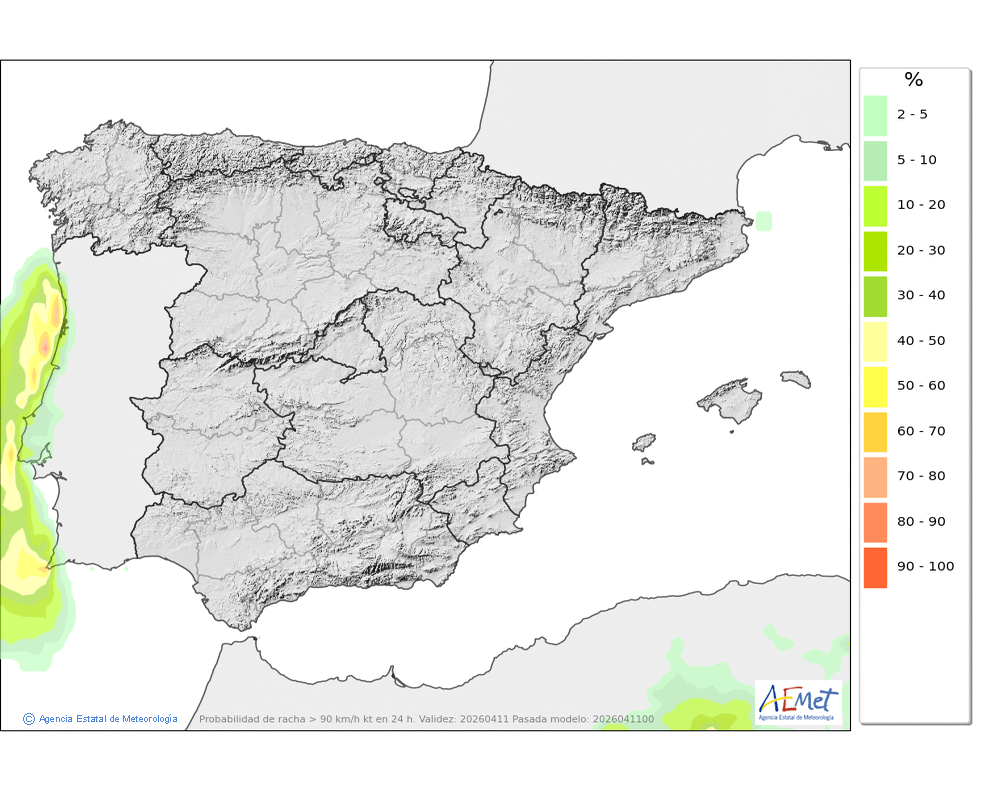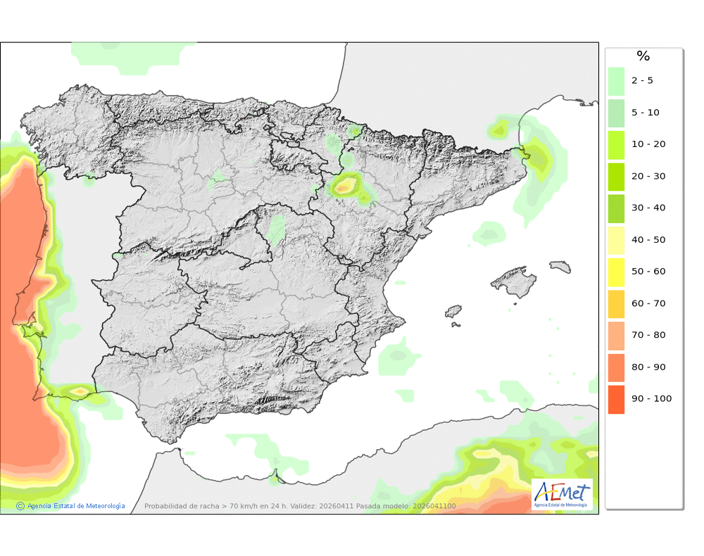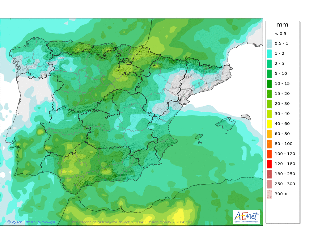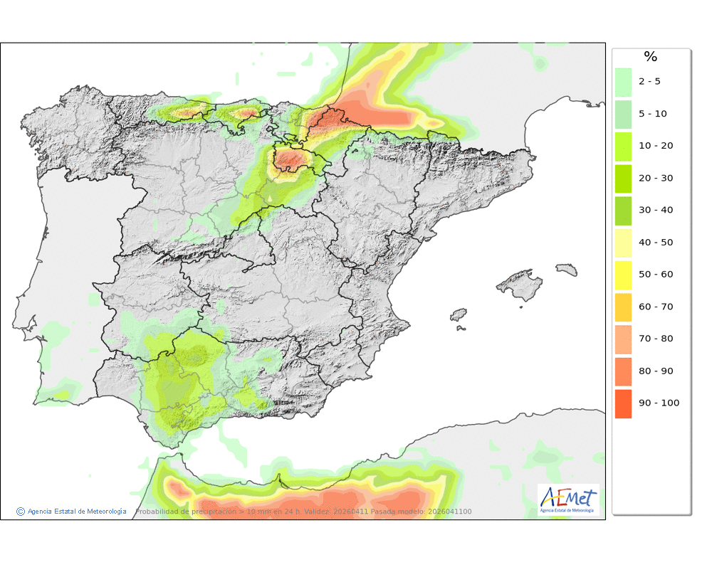 Se esperan precipitaciones débiles o moderadas durante la segunda mitad del día, que podrán ir acompañadas de barro. Cota de nieve: tenderá a ir bajando de oeste a este al final del día, probablemente hasta unos 2.000 metros, pudiendo descender abruptamente en caso de precipitación intensa.
