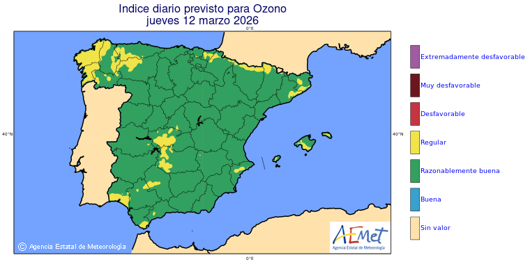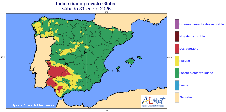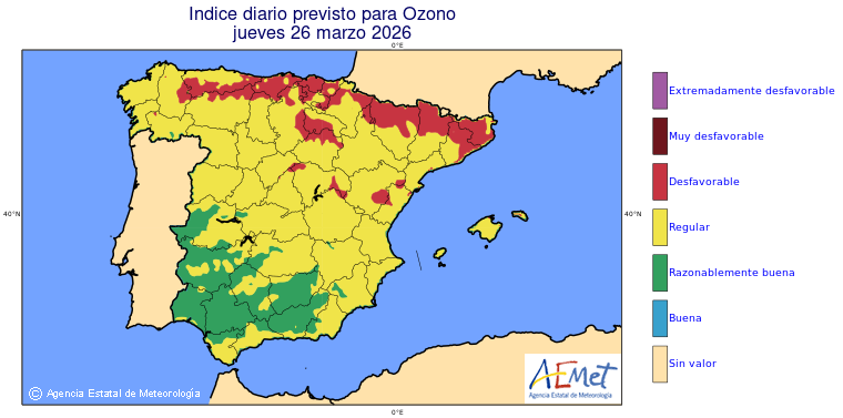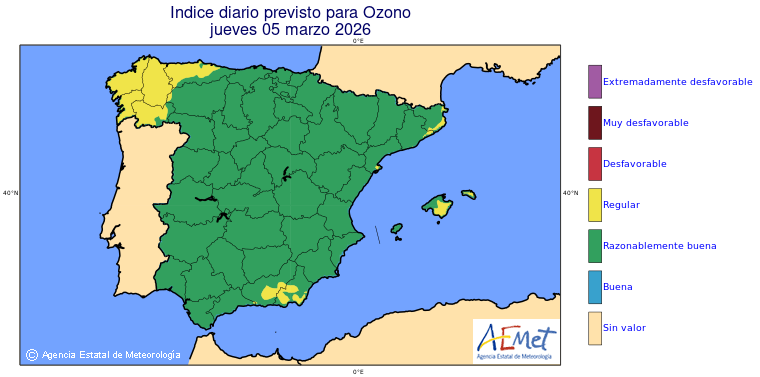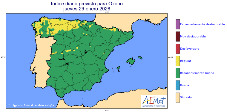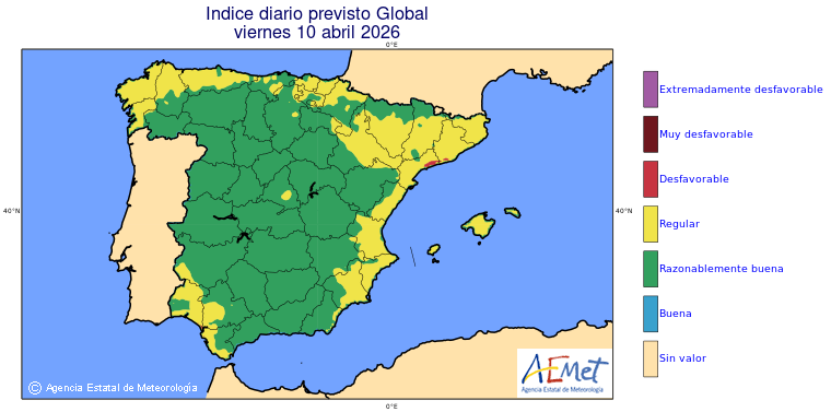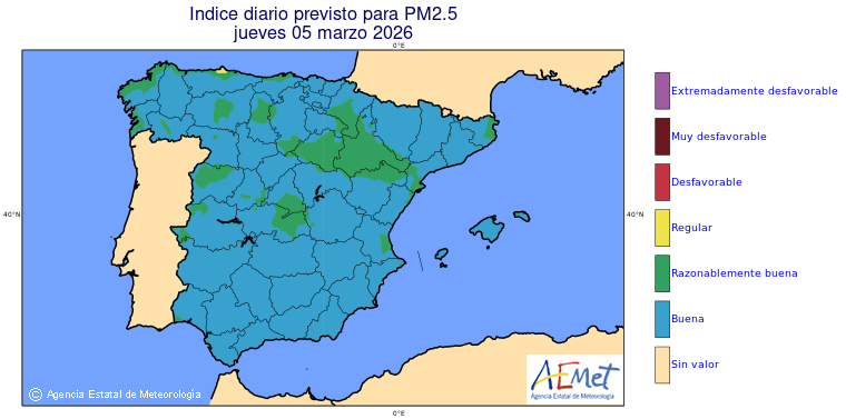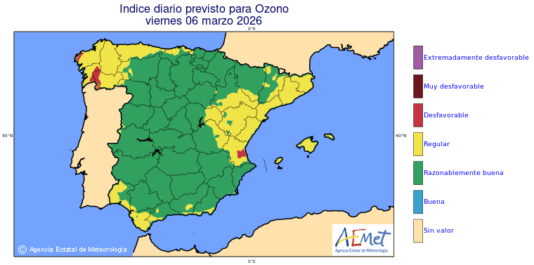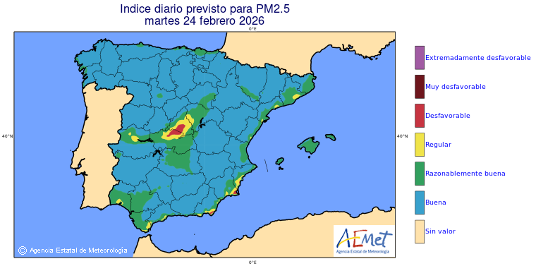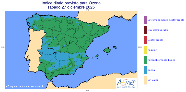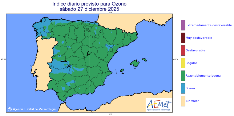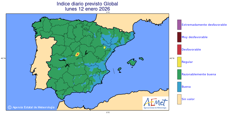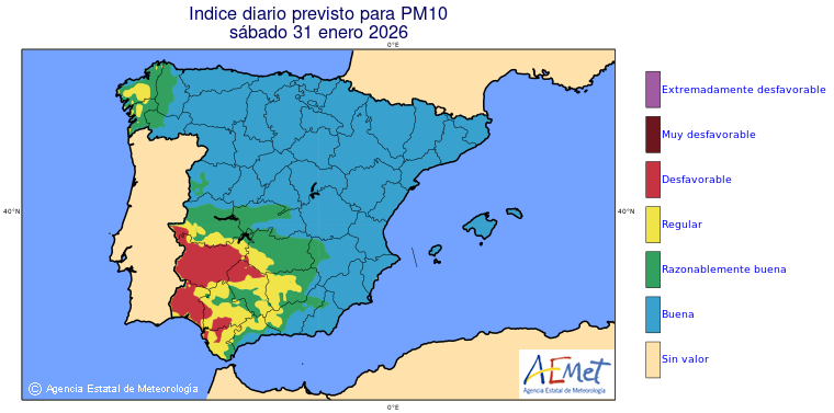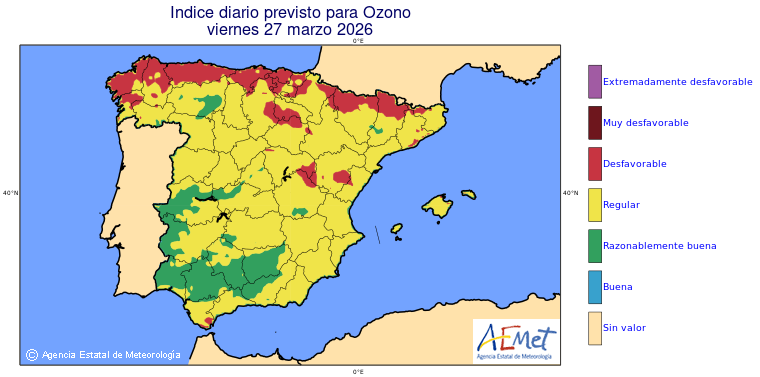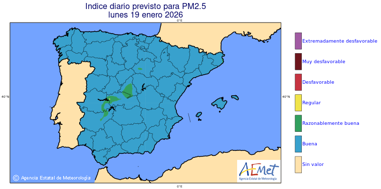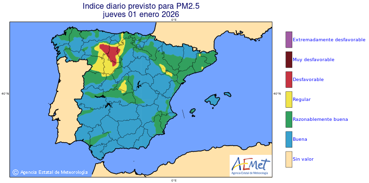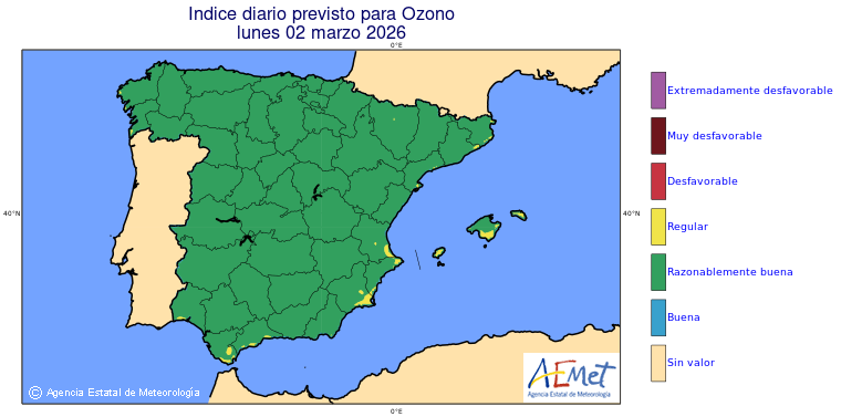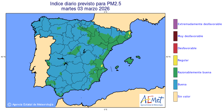 Mapas previstos del modelo de transporte químico MOCAGE. Contaminantes expresadas en microgramos por metro cúbico (µg/m³) con un alcance temporal de 48 horas. Estas predicciones son el resultado de la modelización numérica realizada con el modelo de transporte químico MOCAGE a una resolución de 0.1º.