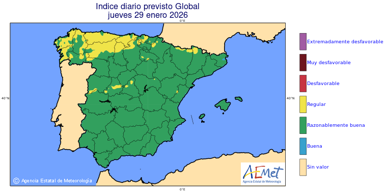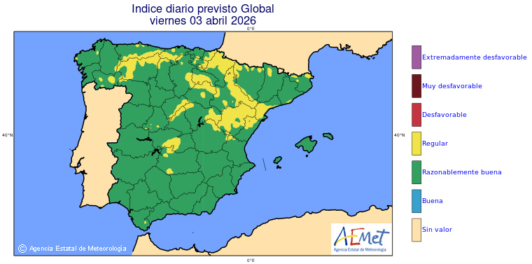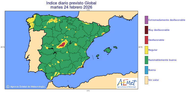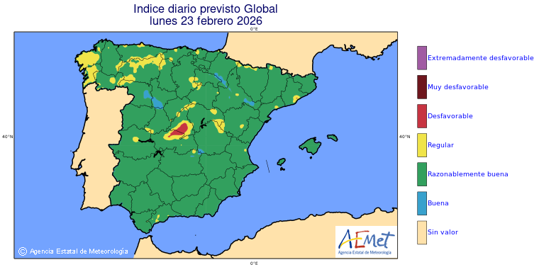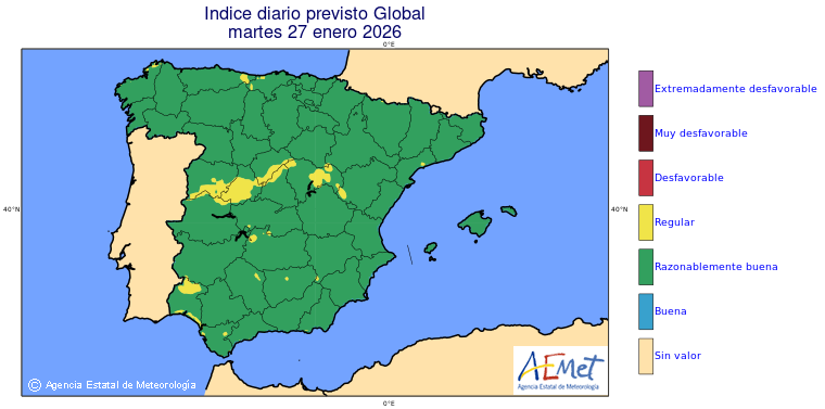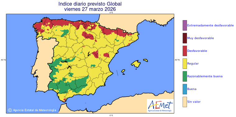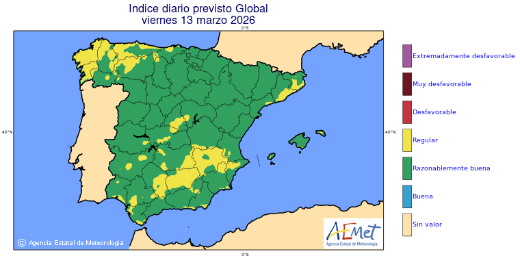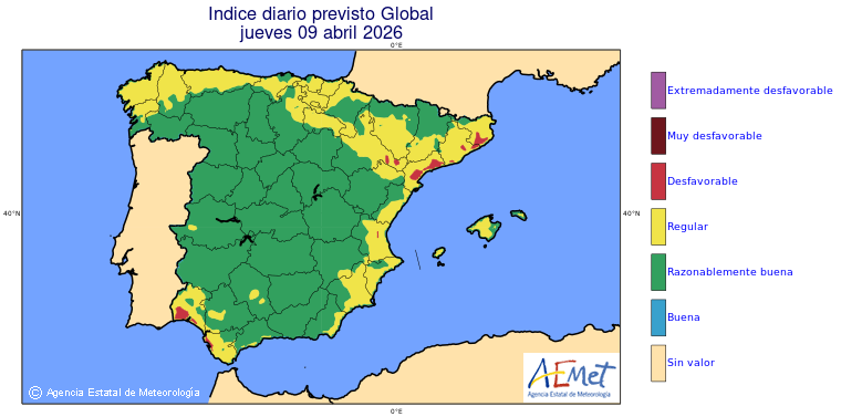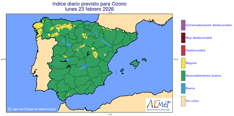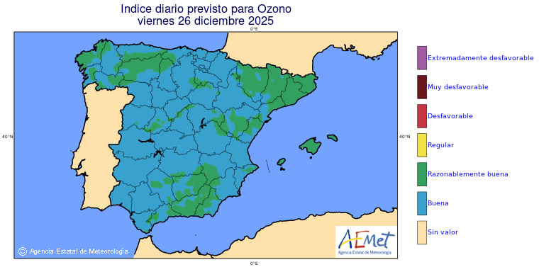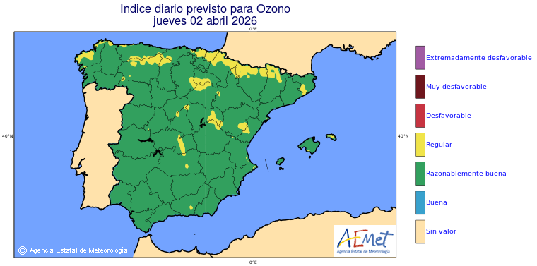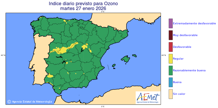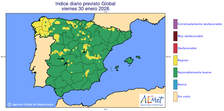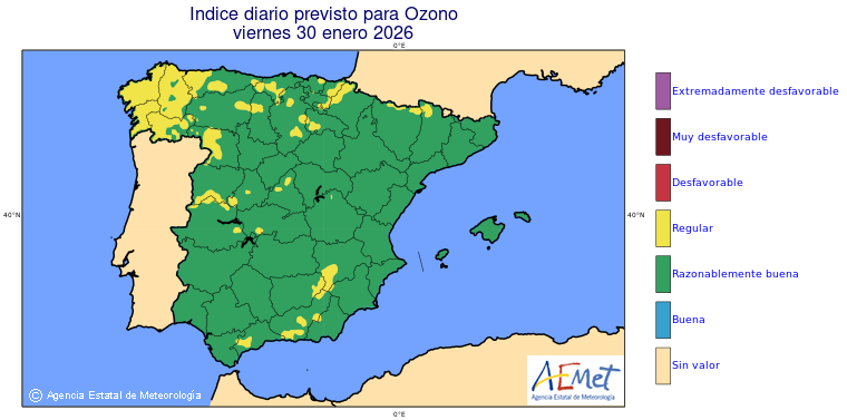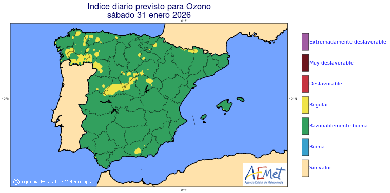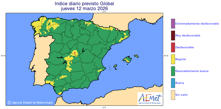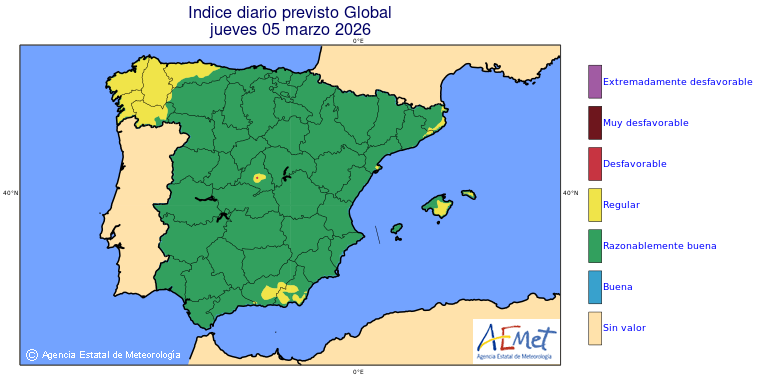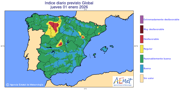 Mapas previstos del modelo de transporte químico MOCAGE. Contaminantes expresadas en microgramos por metro cúbico (µg/m³) con un alcance temporal de 48 horas. Estas predicciones son el resultado de la modelización numérica realizada con el modelo de transporte químico MOCAGE a una resolución de 0.1º.