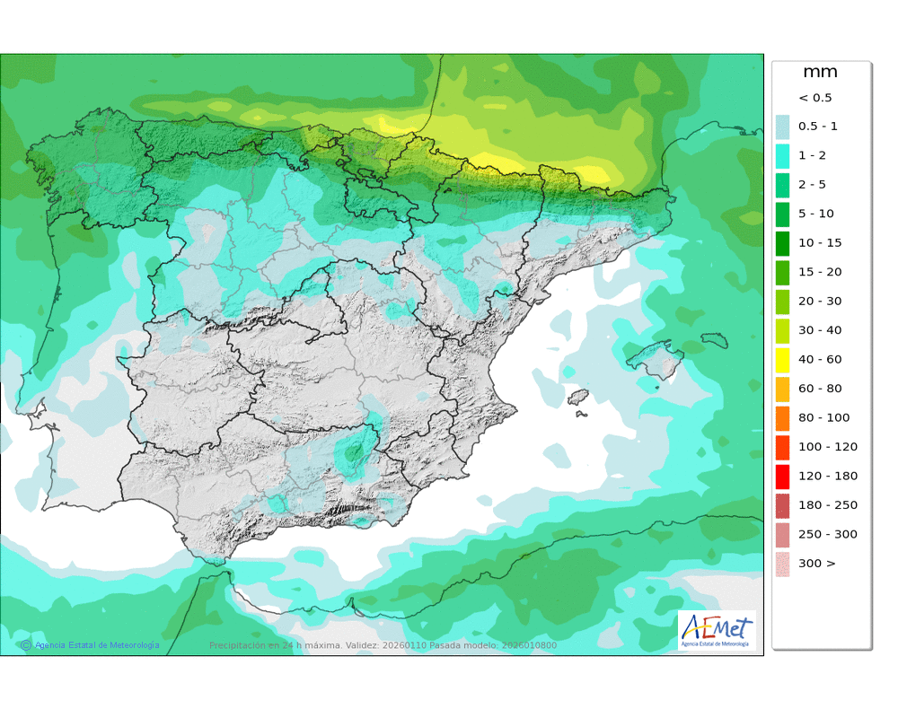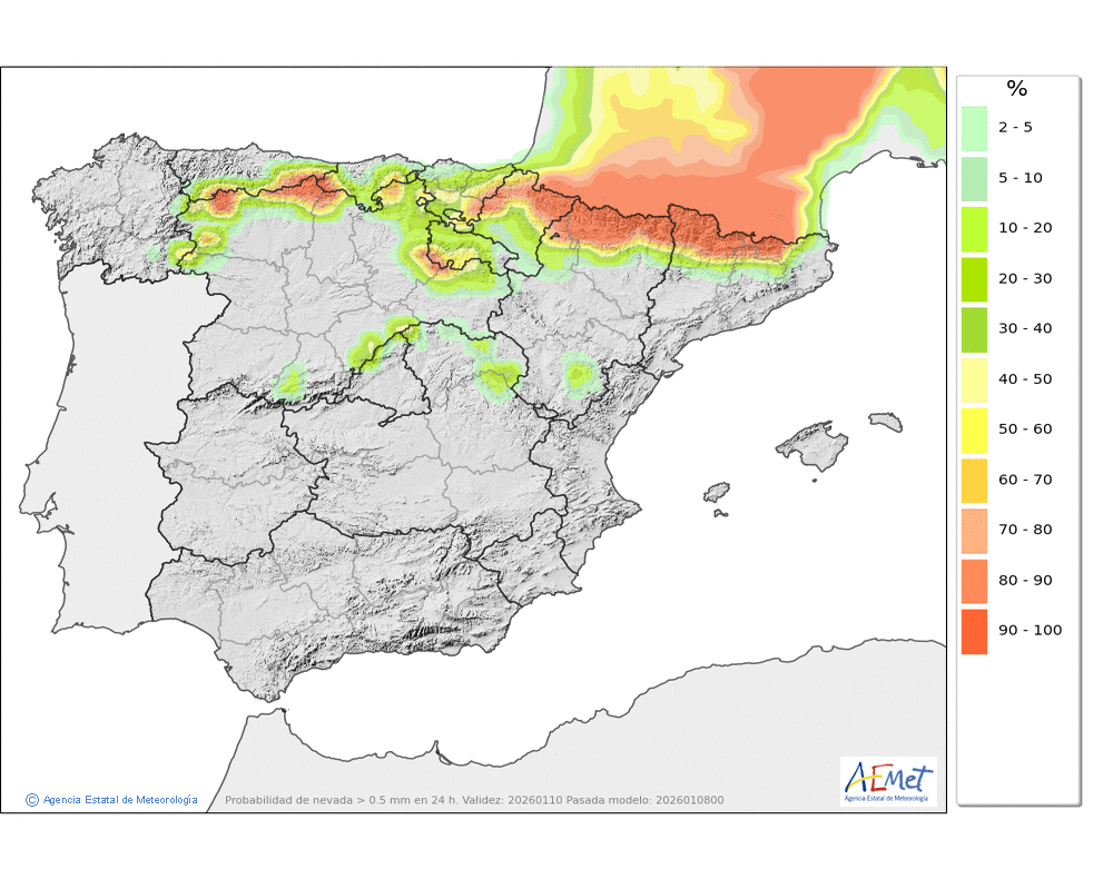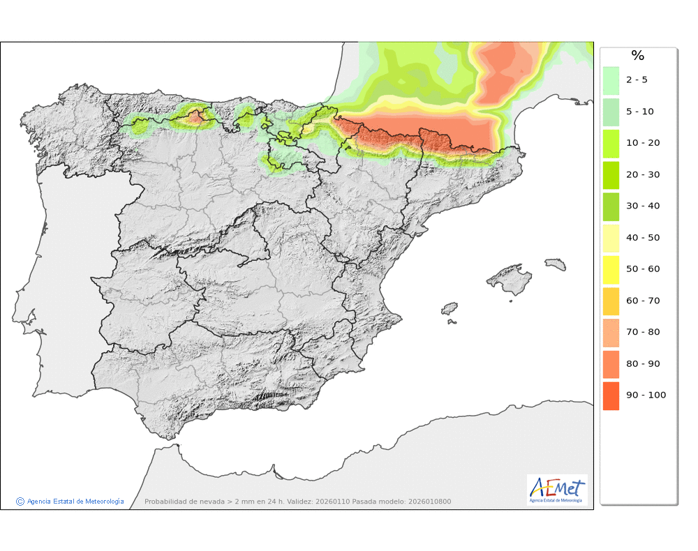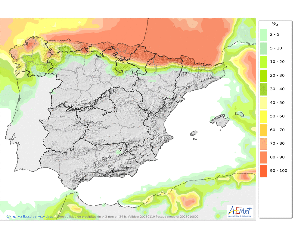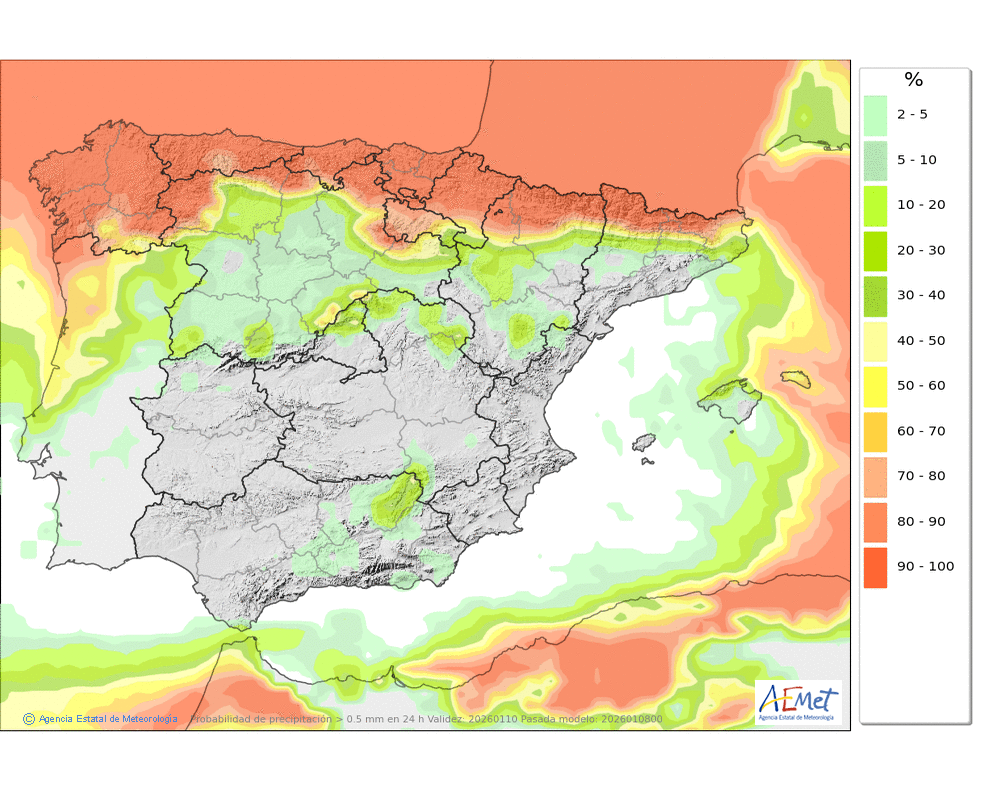 No se descartan algunas débiles a últimas horas en las sierras occidentales, que podrían ser de nieve por encima de unos 1800-2000 metros.