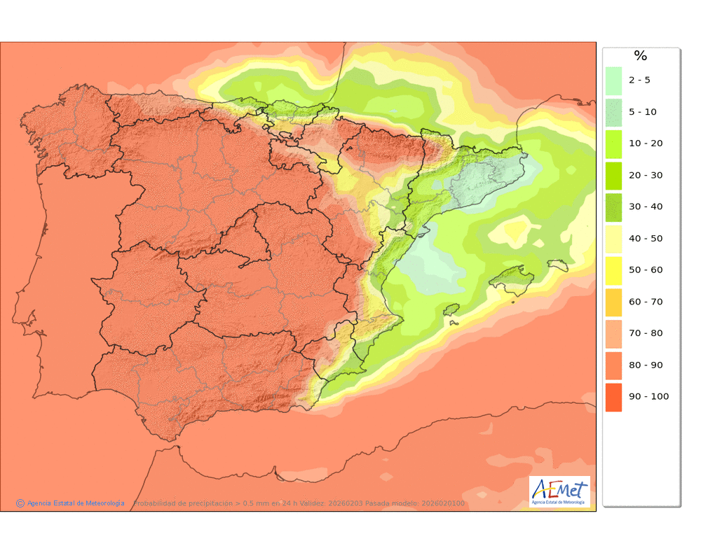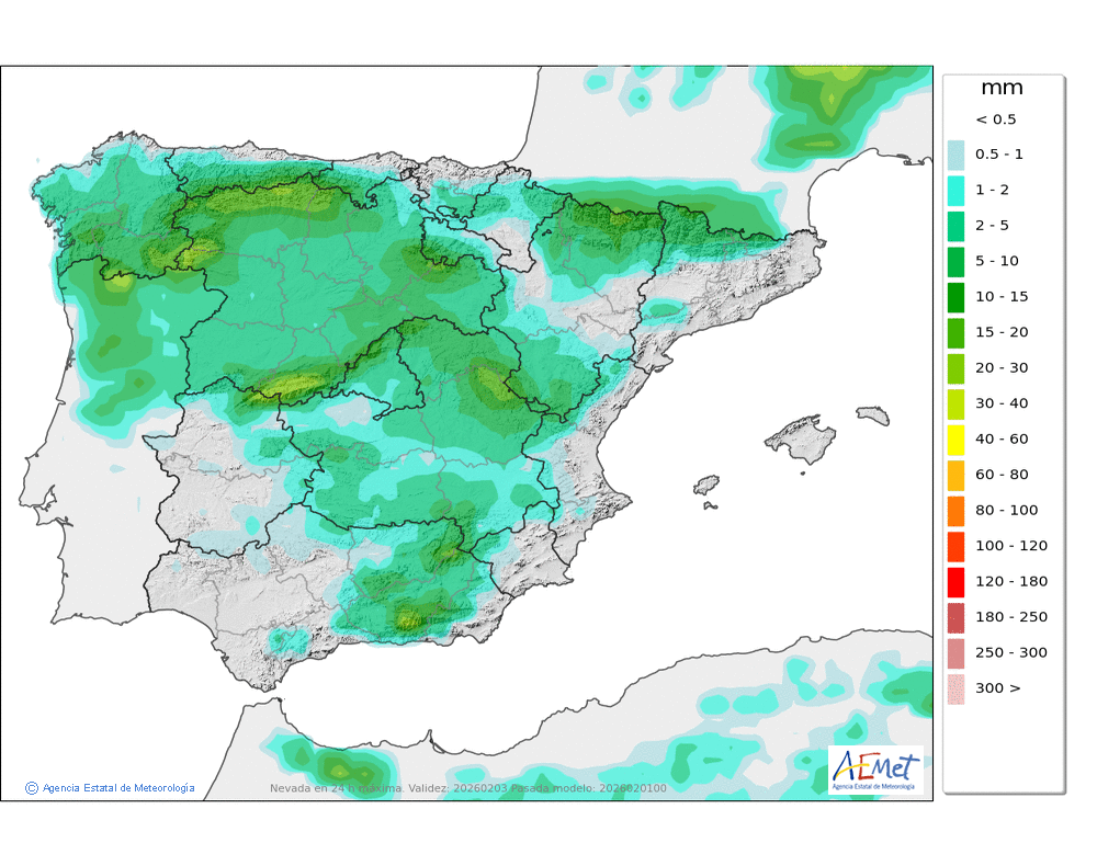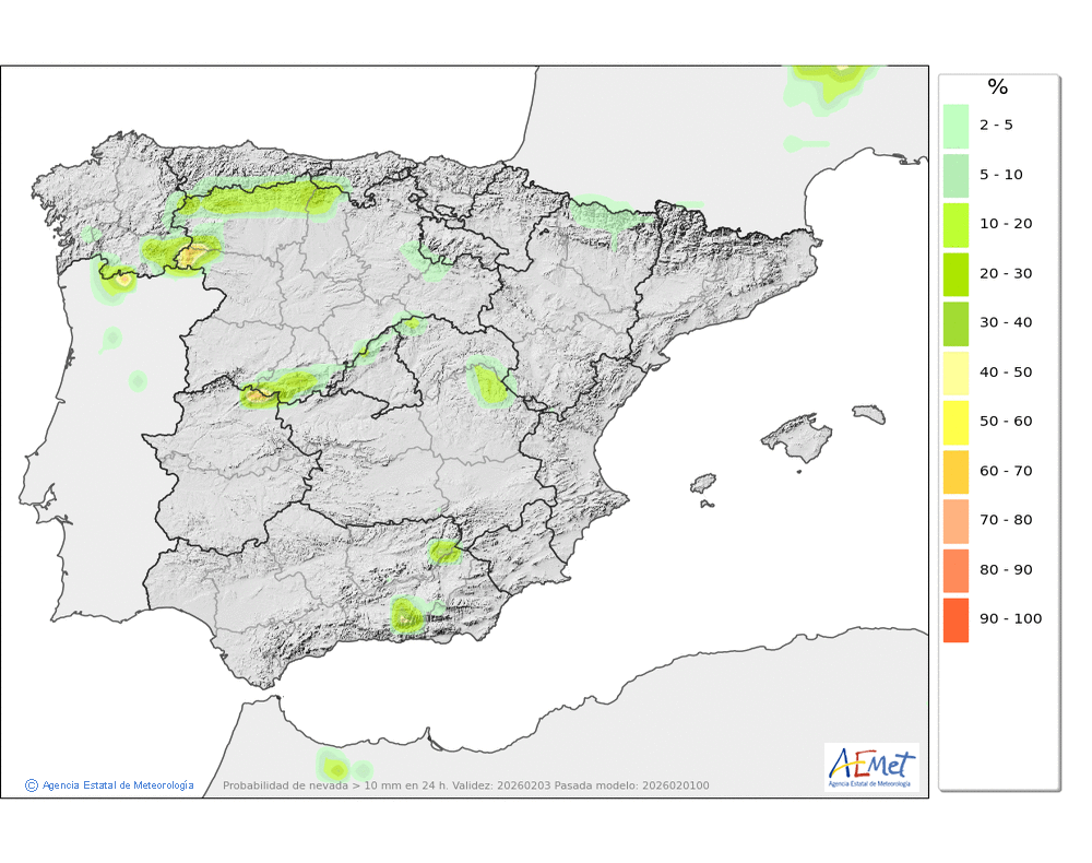 Débiles y ocasionales, más probables en el extremo occidental. Cota de nieve en torno a 1000-1200 metros.