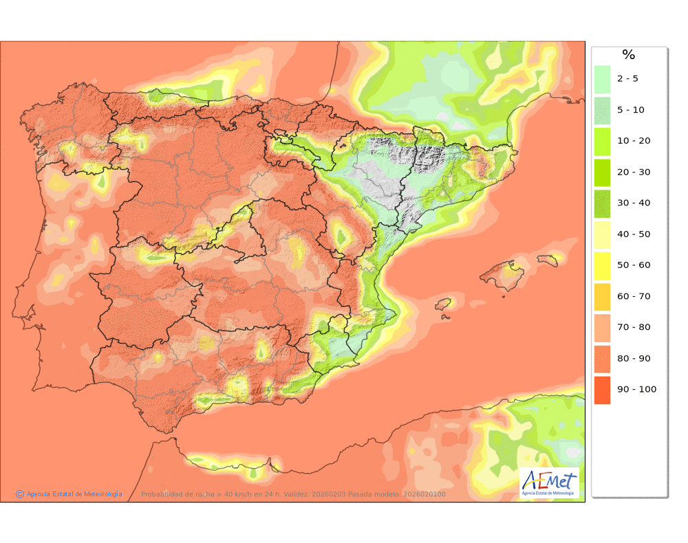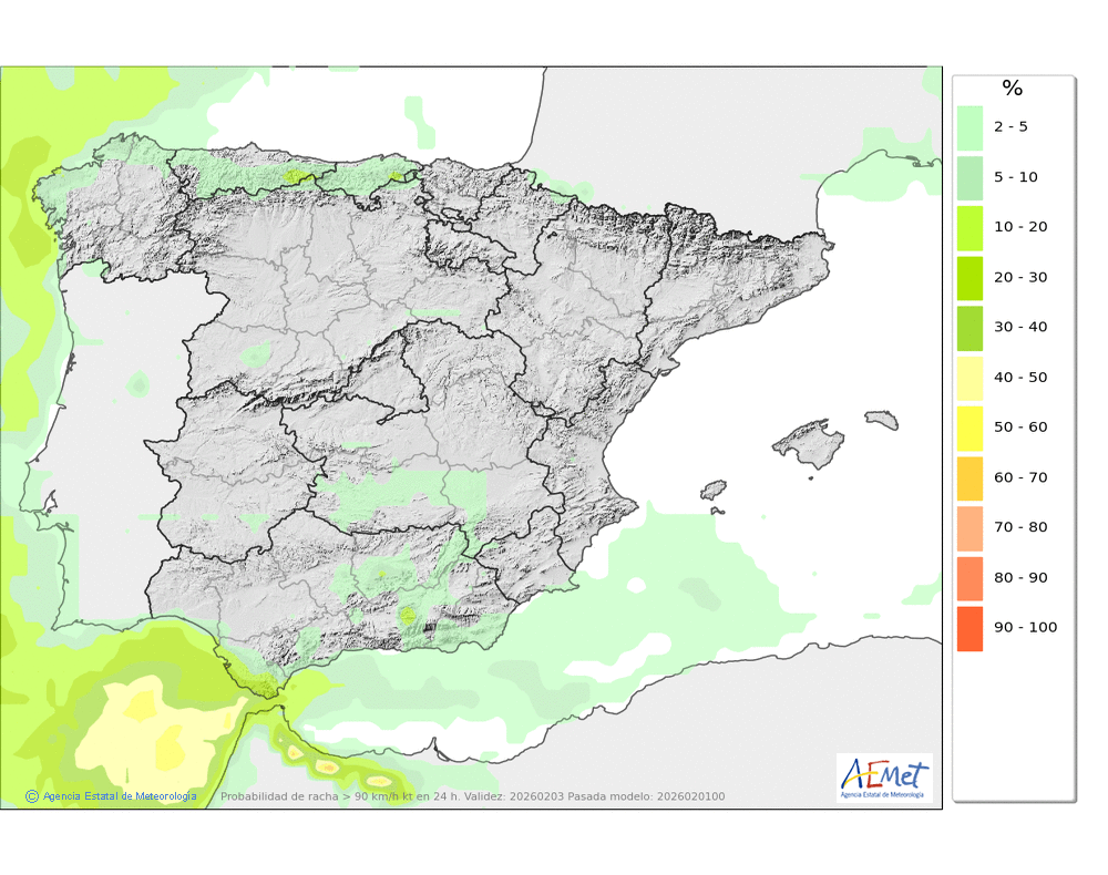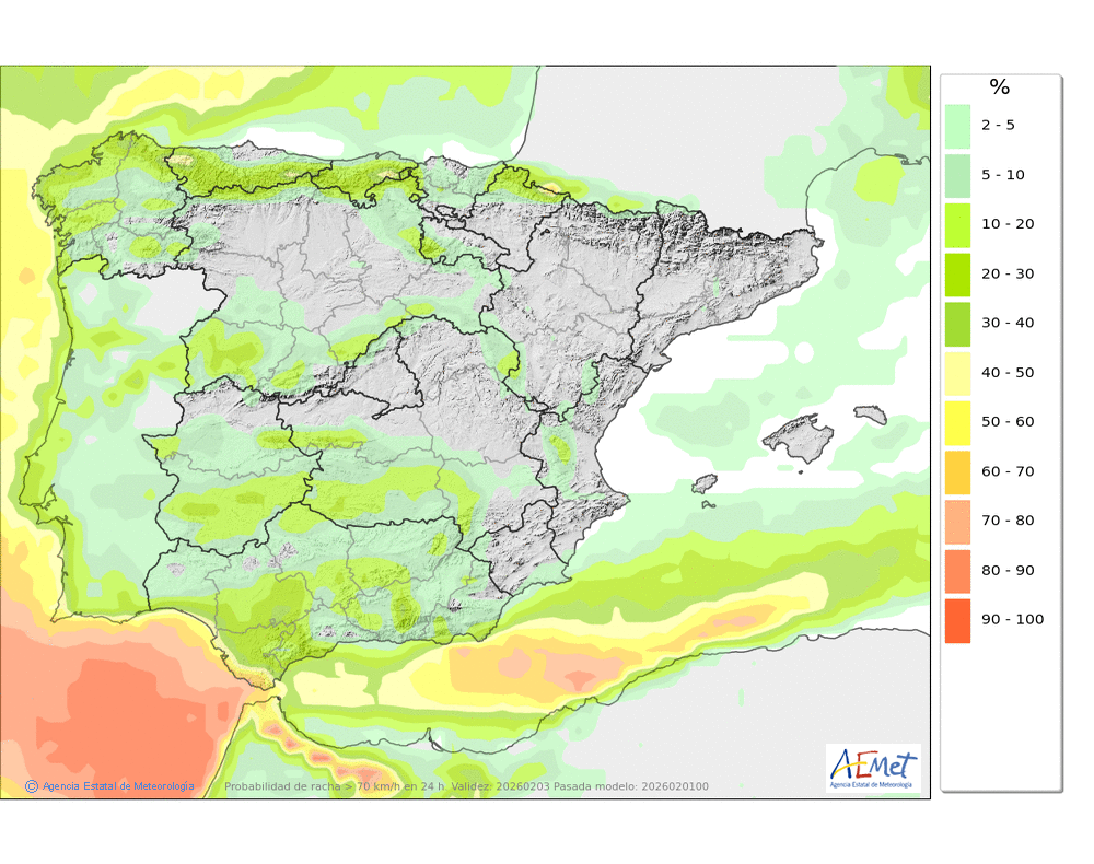 Moderado o fuerte del oeste y suroeste, con probables rachas muy fuertes en cotas altas y zonas expuestas.