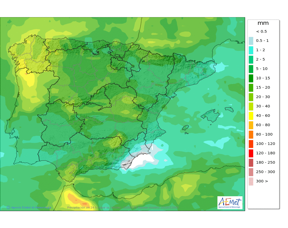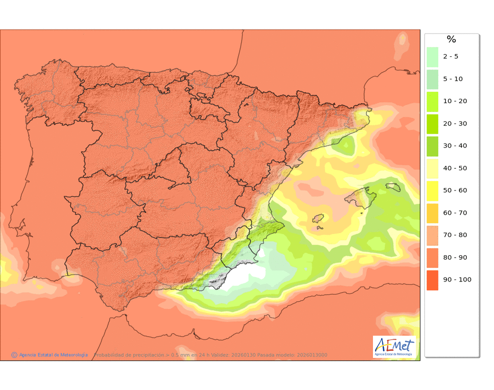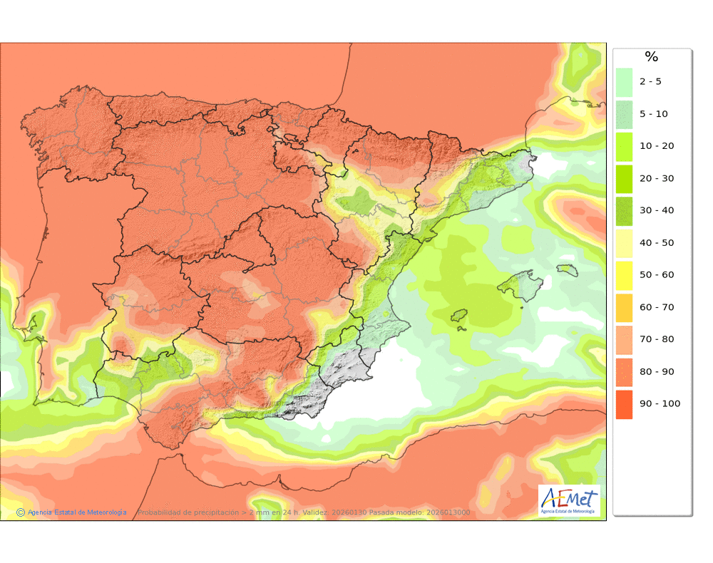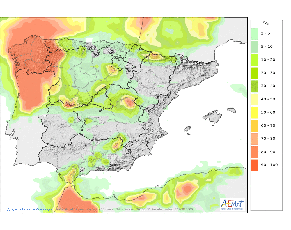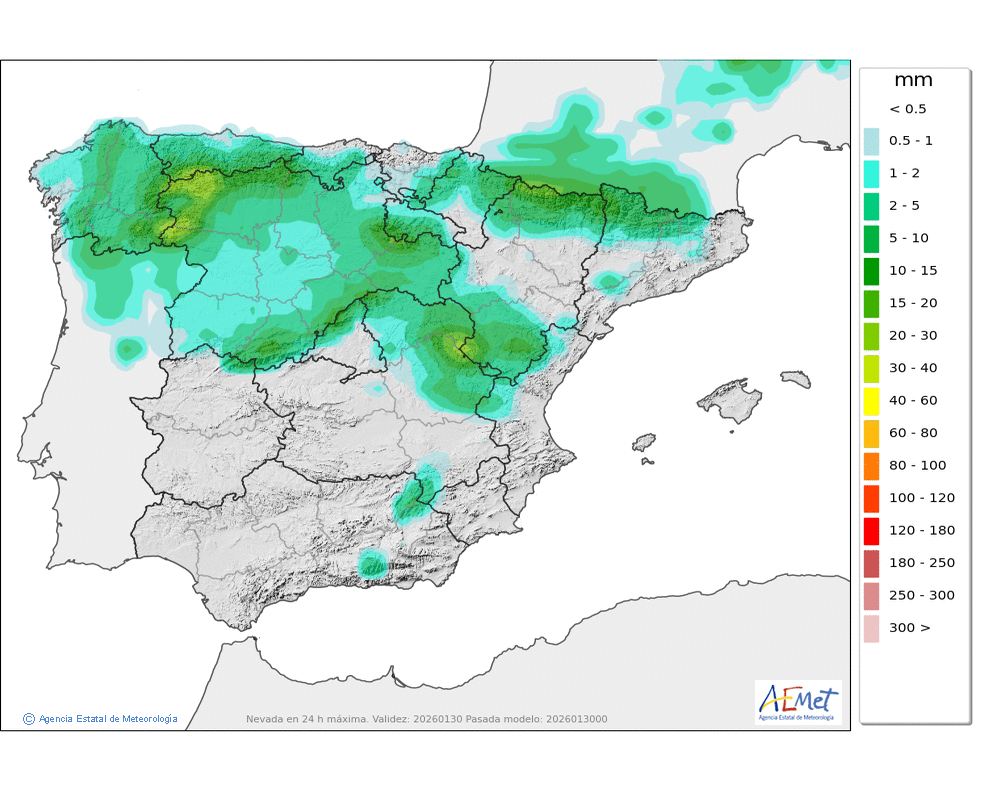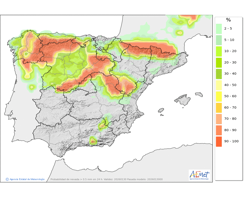 Se esperan precipitaciones débiles o moderadas durante la segunda mitad del día, sin descartarse dispersas y ocasionales por la mañana. Cota de nieve: en torno a 1200-1400 metros, bajando a 800-1000 a últimas horas.