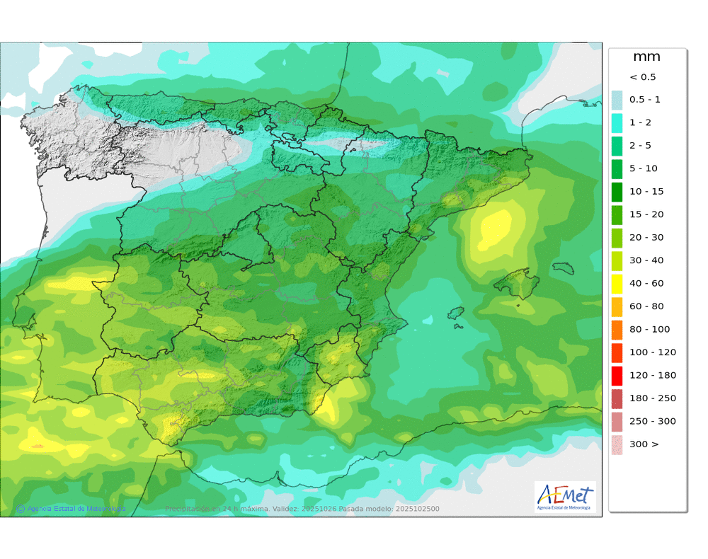 Lluvias débiles o localmente moderadas, tendiendo a remitir por la tarde. Cota de nieve entorno a 1600-1800 metros.