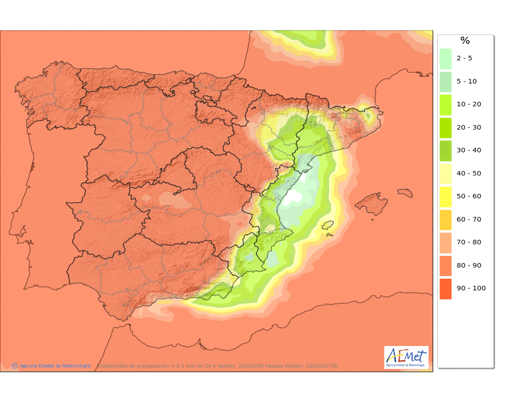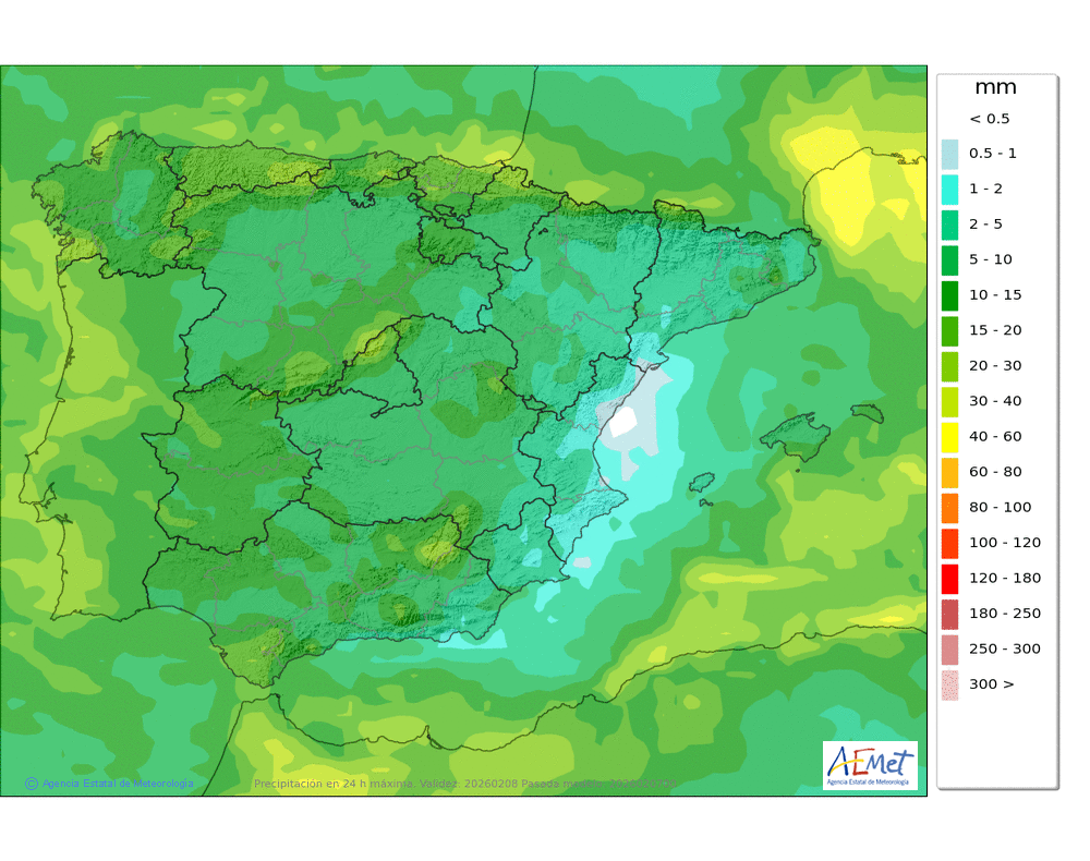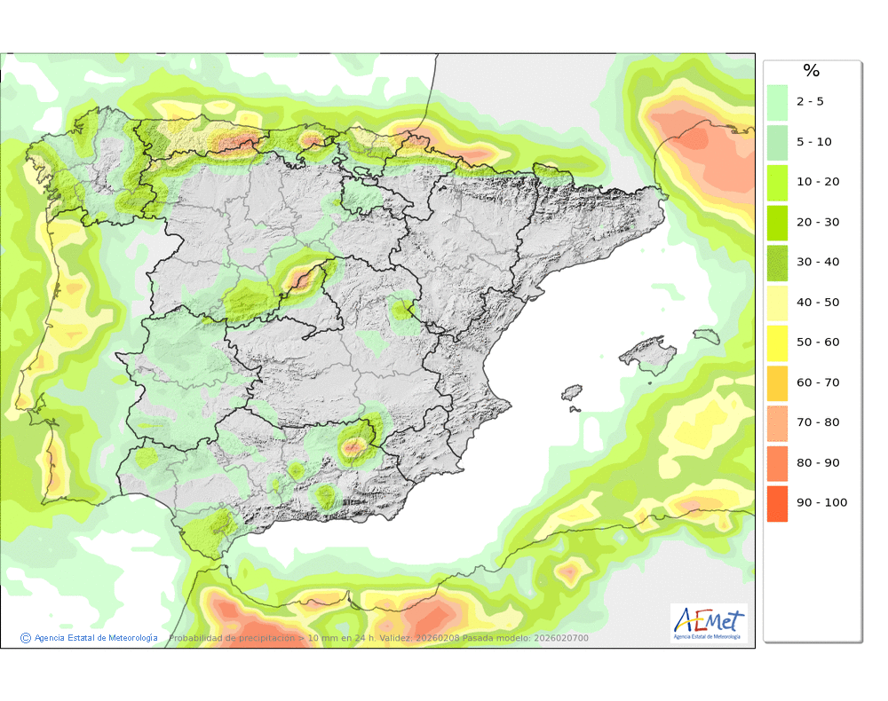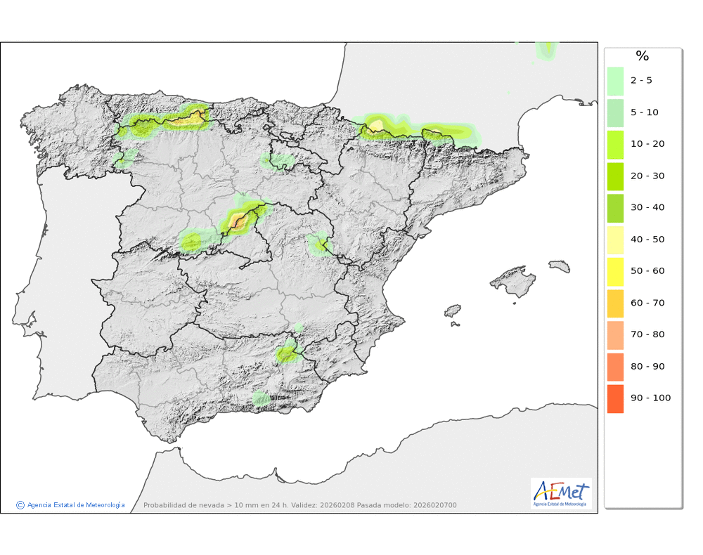 Débiles o localmente moderadas, siendo más frecuentes e intensas en las sierras occidentales. Cota de nieve en torno a 1200 metros.