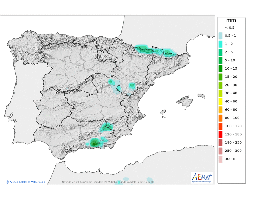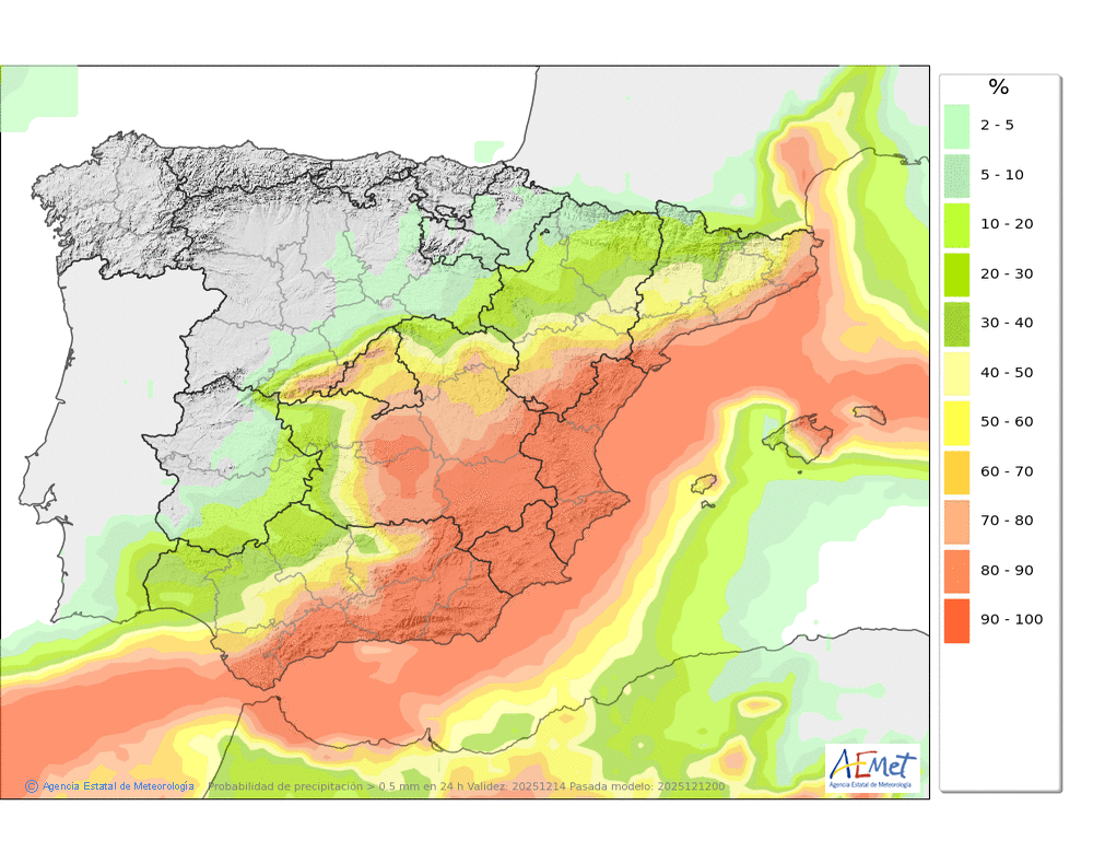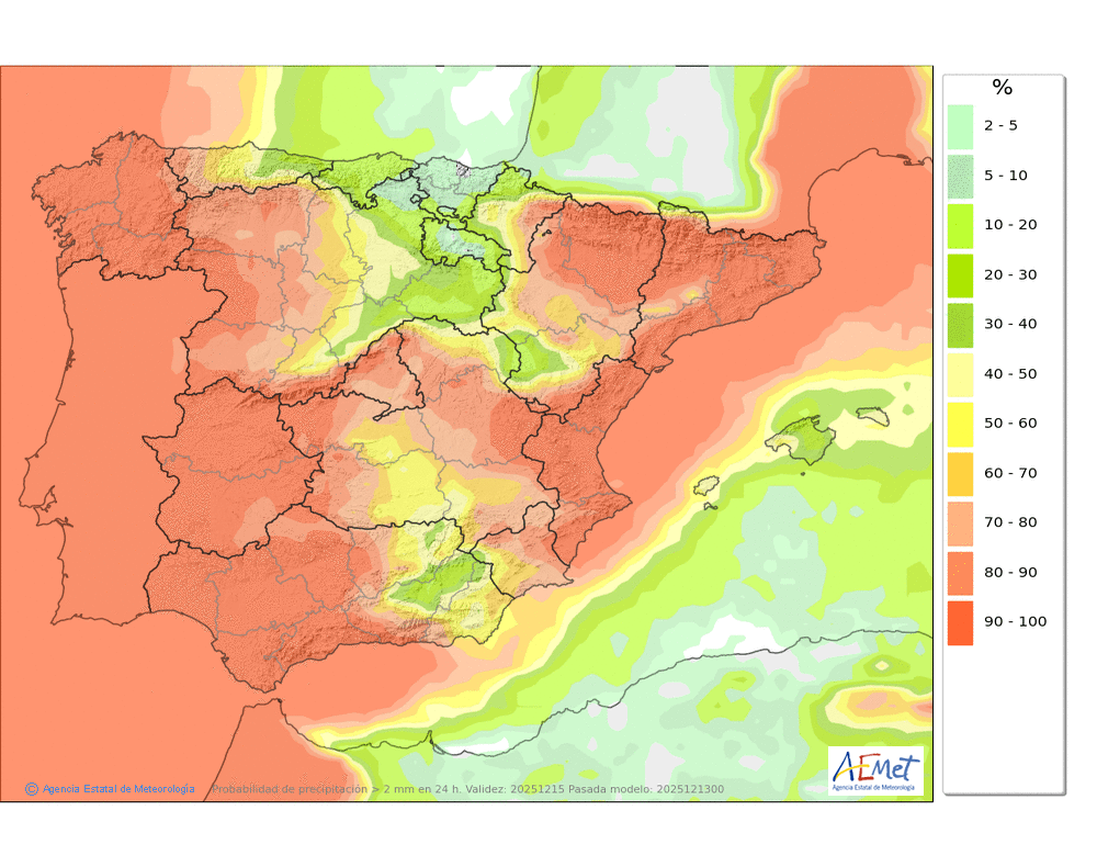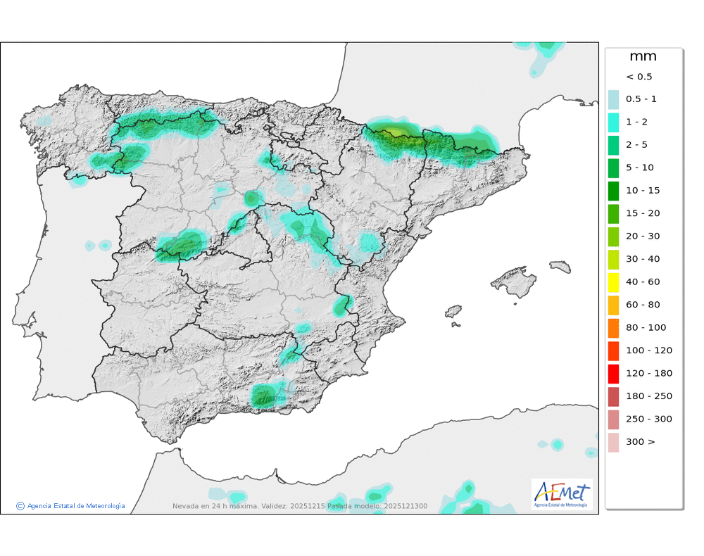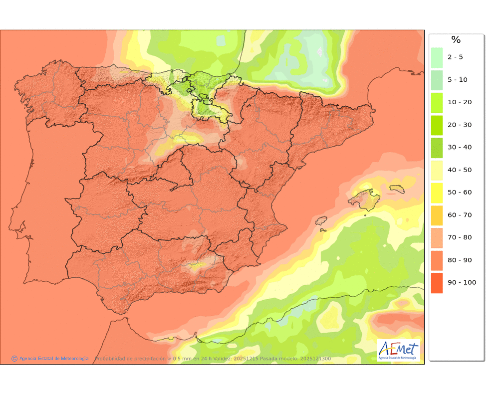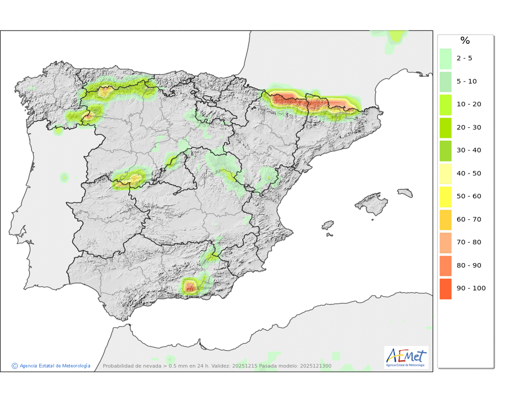 Probables lluvias débiles y chubascos ocasionales. Cota de nieve en torno a unos 1700 metros aproximadamente.