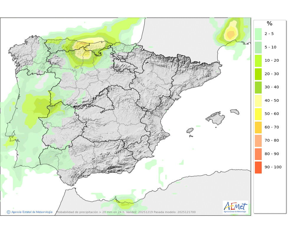Probables débiles, a veces como chubascos. Cota de nieve bajando de 1700 a 1400 metros.