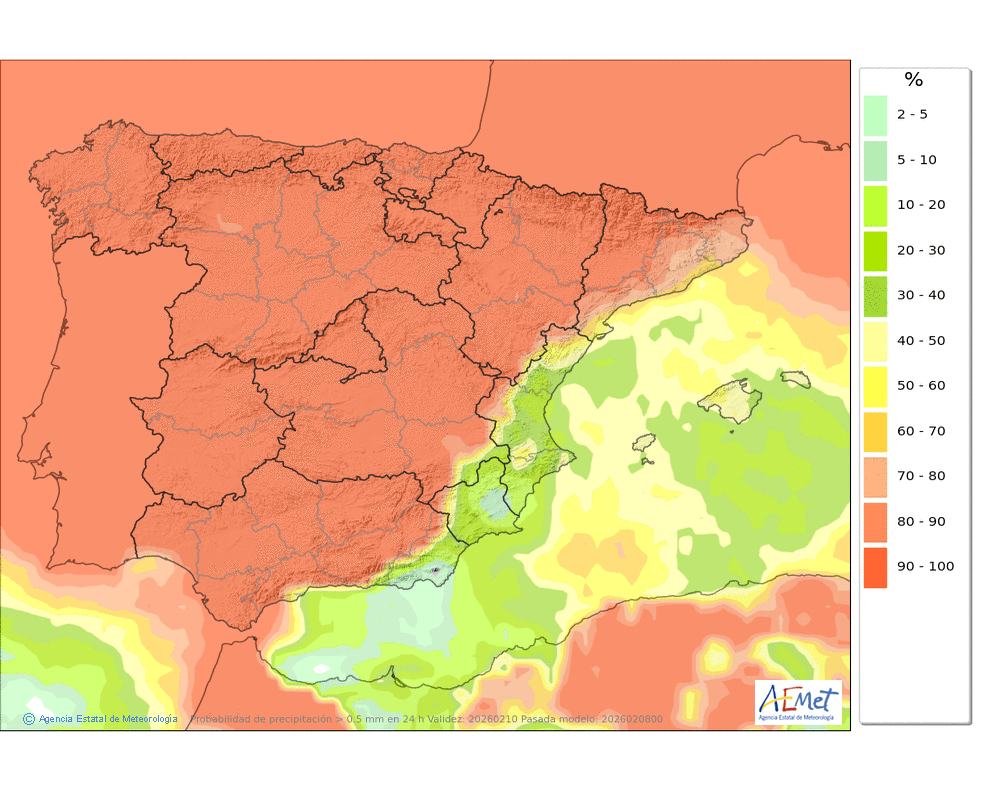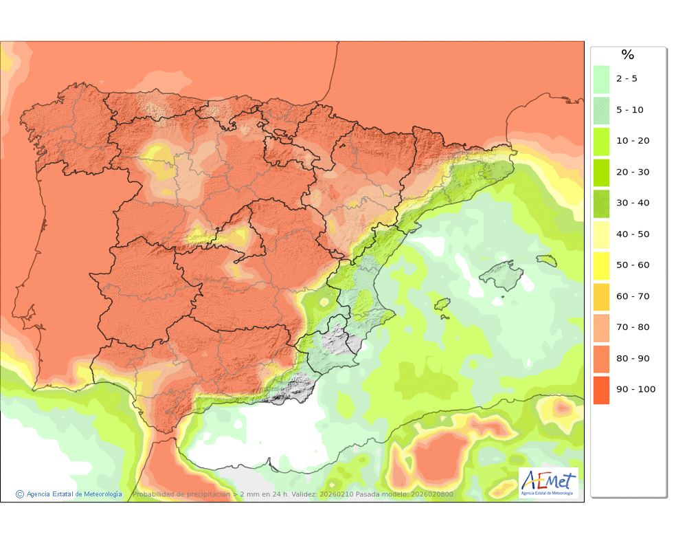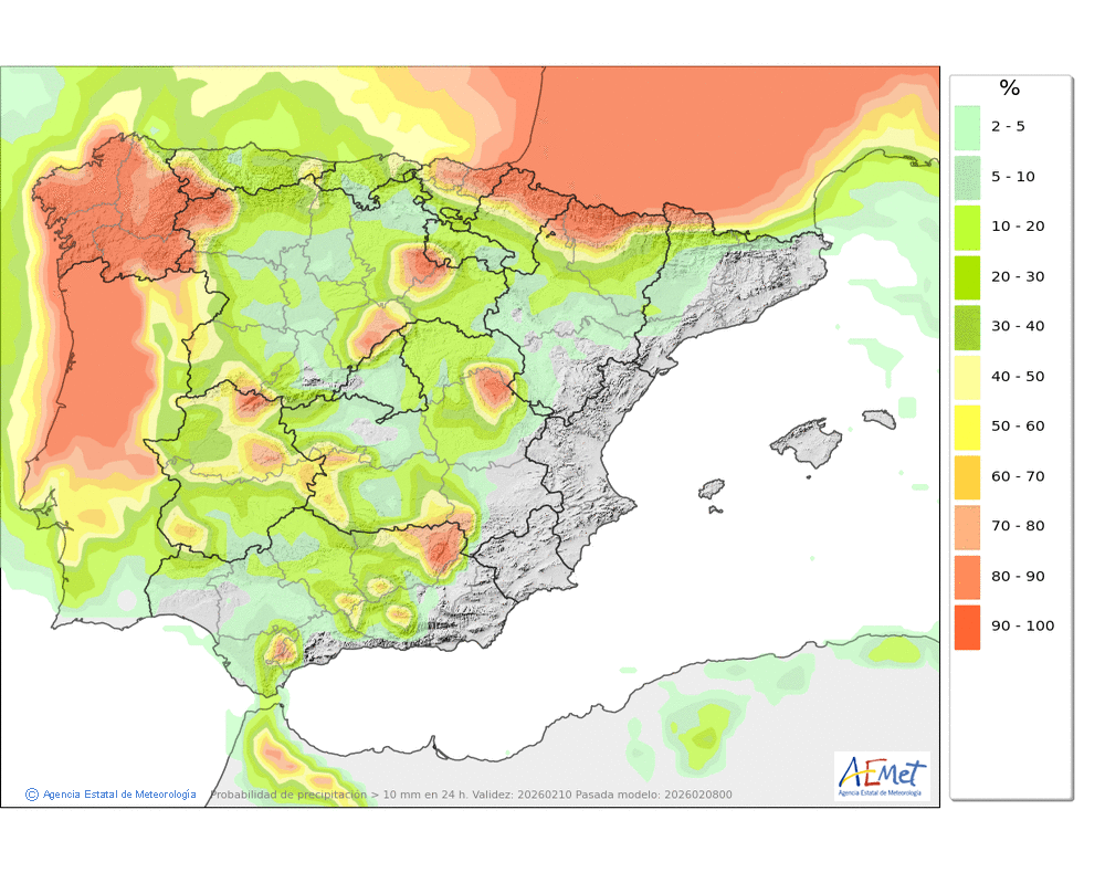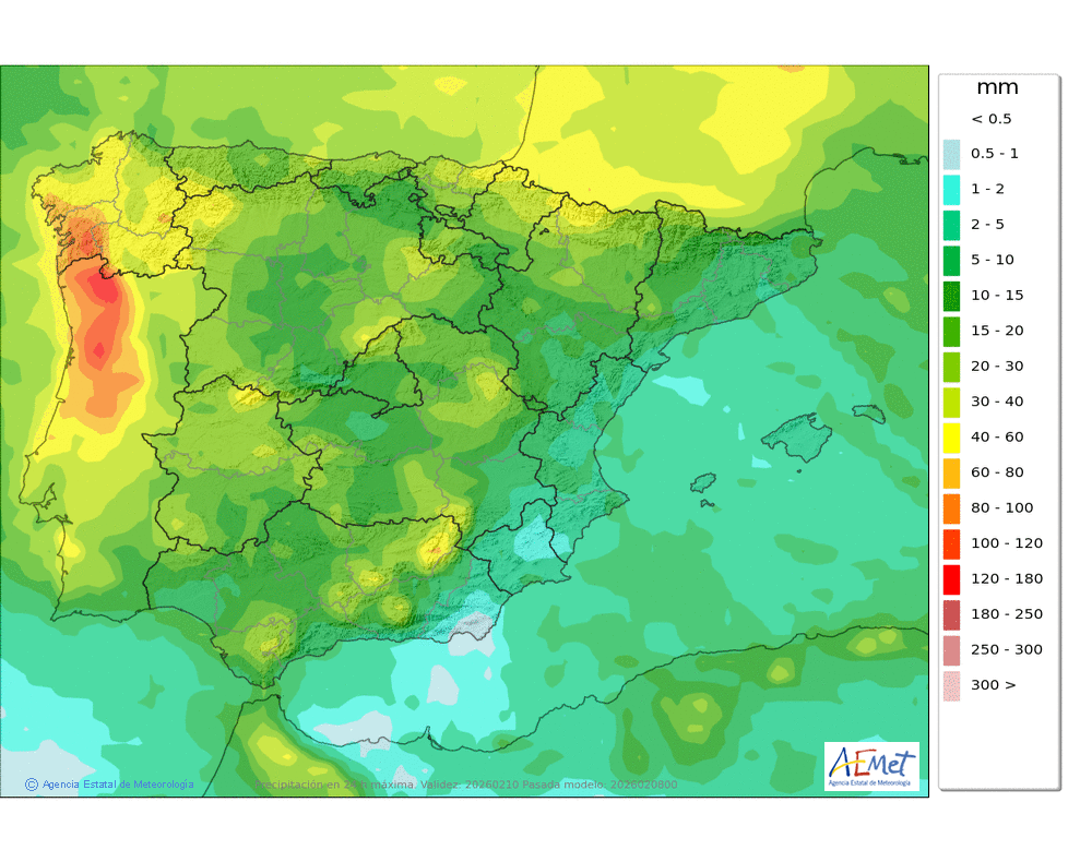 Se esperan precipitaciones débiles, que podrán ser localmente moderadas. Cota de nieve: subiendo de 1.200 a unos 2.200 metros.