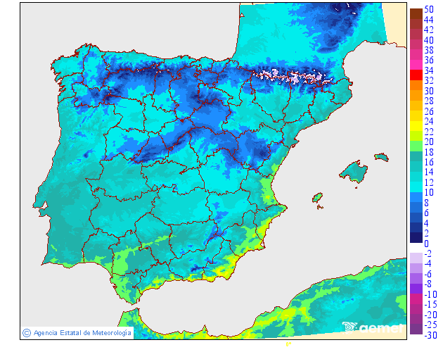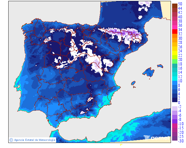 En descenso. Heladas débiles, moderadas en cotas altas. Las mínimas se podrán dar al final del día.