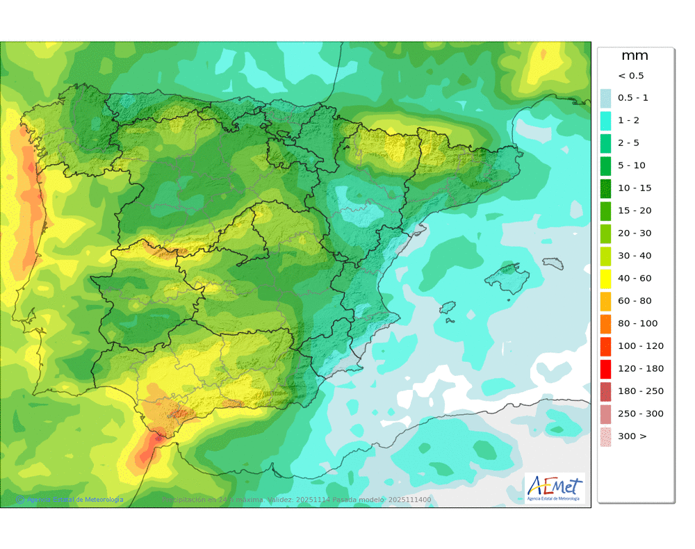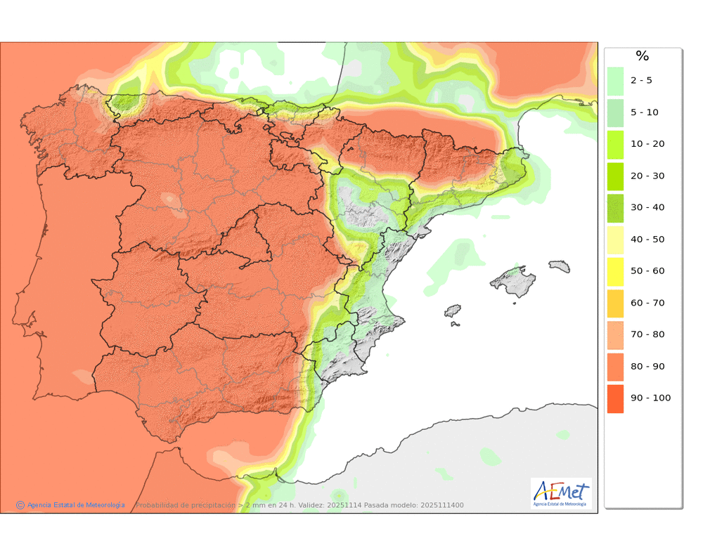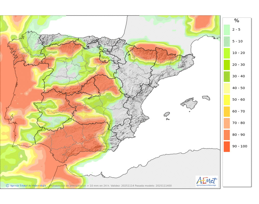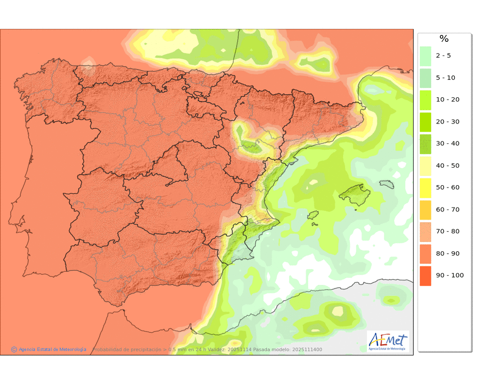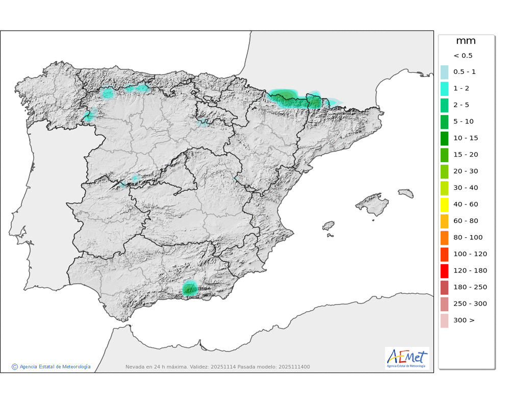 Débiles o moderadas, a veces chubascos, más frecuentes e intensas en el sur, donde podrían ser localmente persistentes. Cota de nieve bajando de 2600 a 1800-2000 metros.
