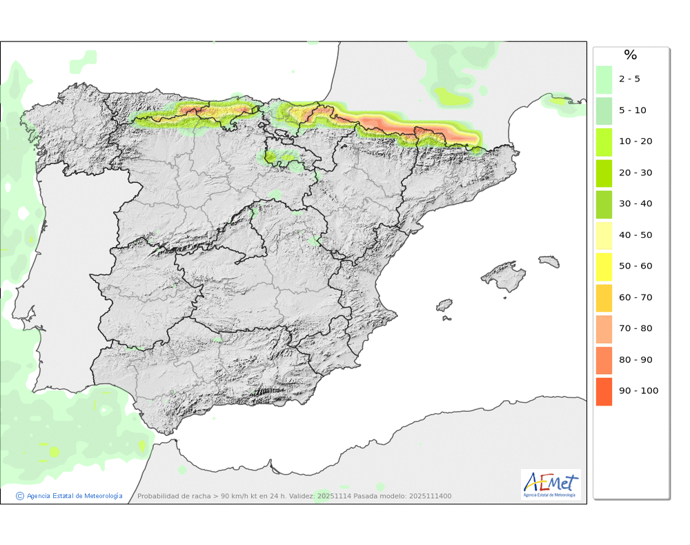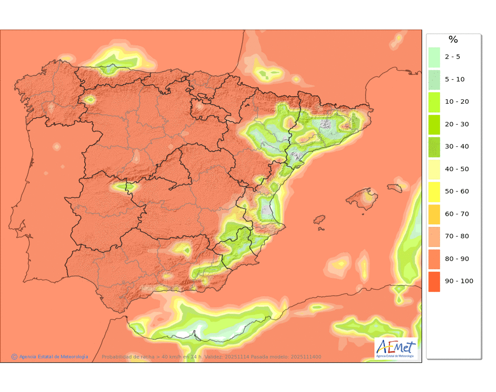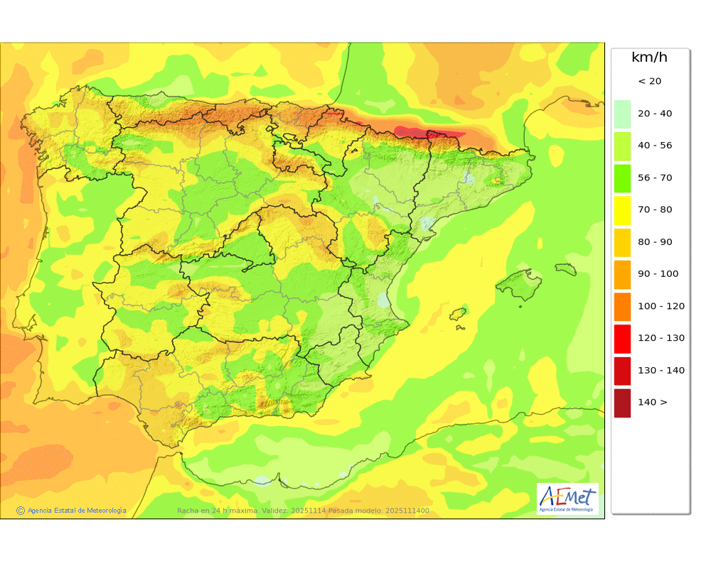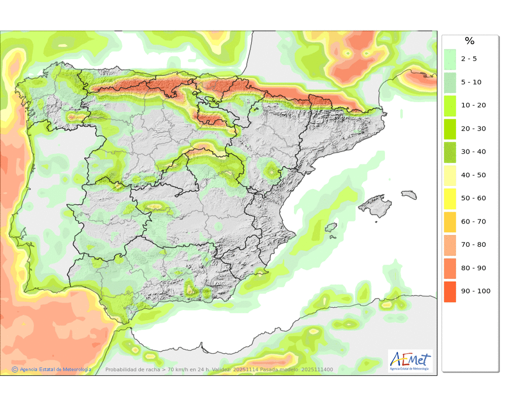 Fuerte o muy fuerte del suroeste, con probables rachas huracanadas (superiores a 120 km/h) en cotas altas y zonas expuestas de madrugada.