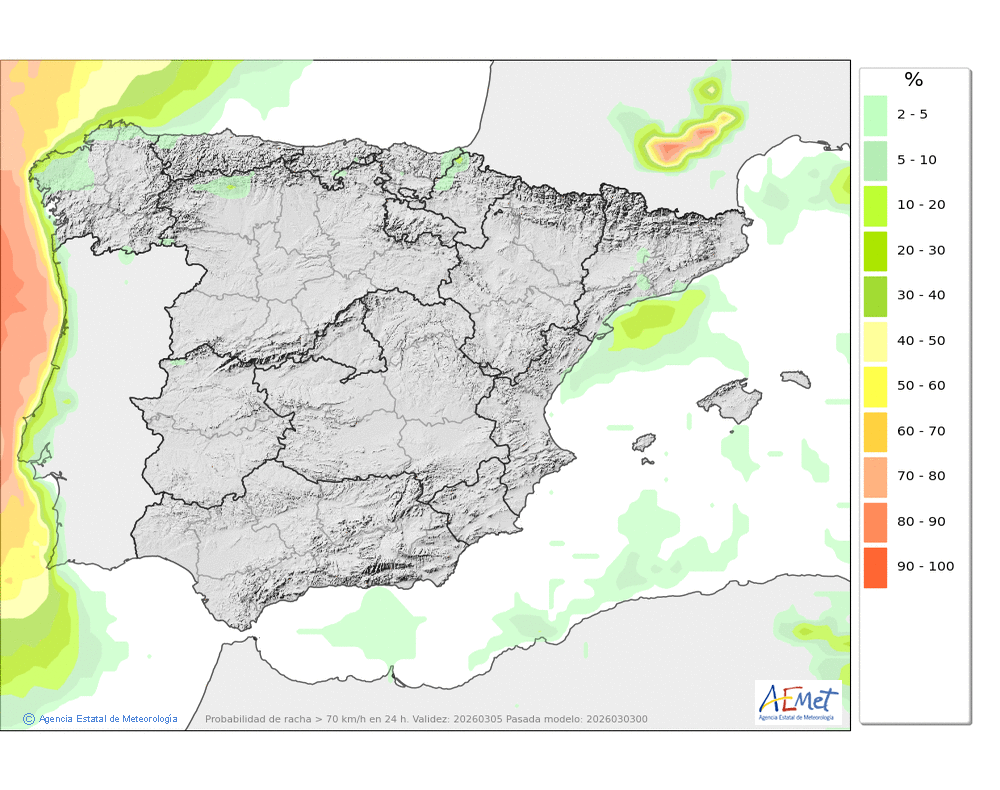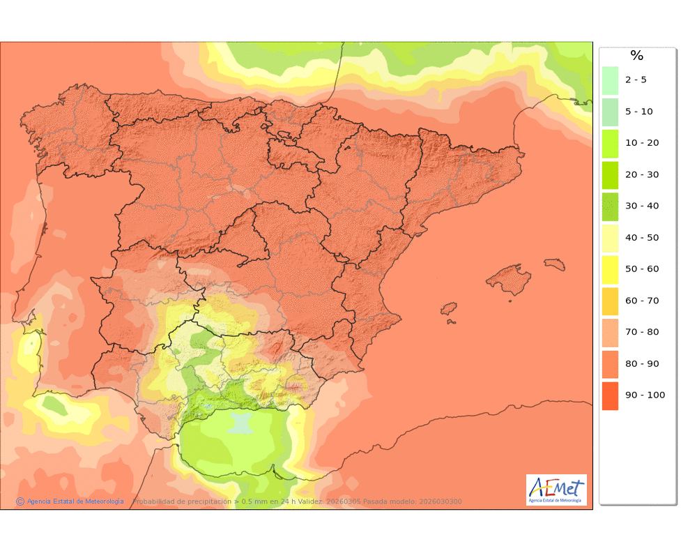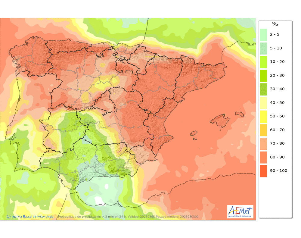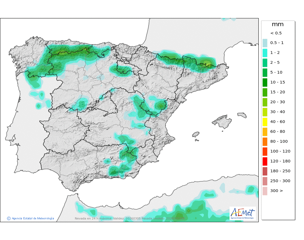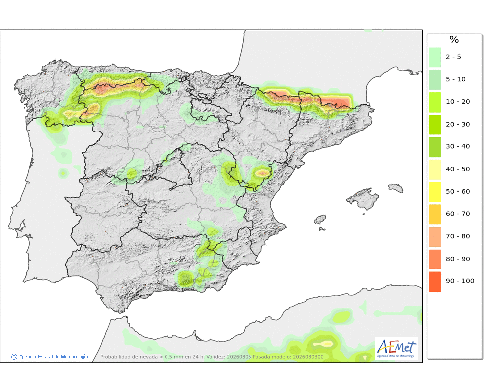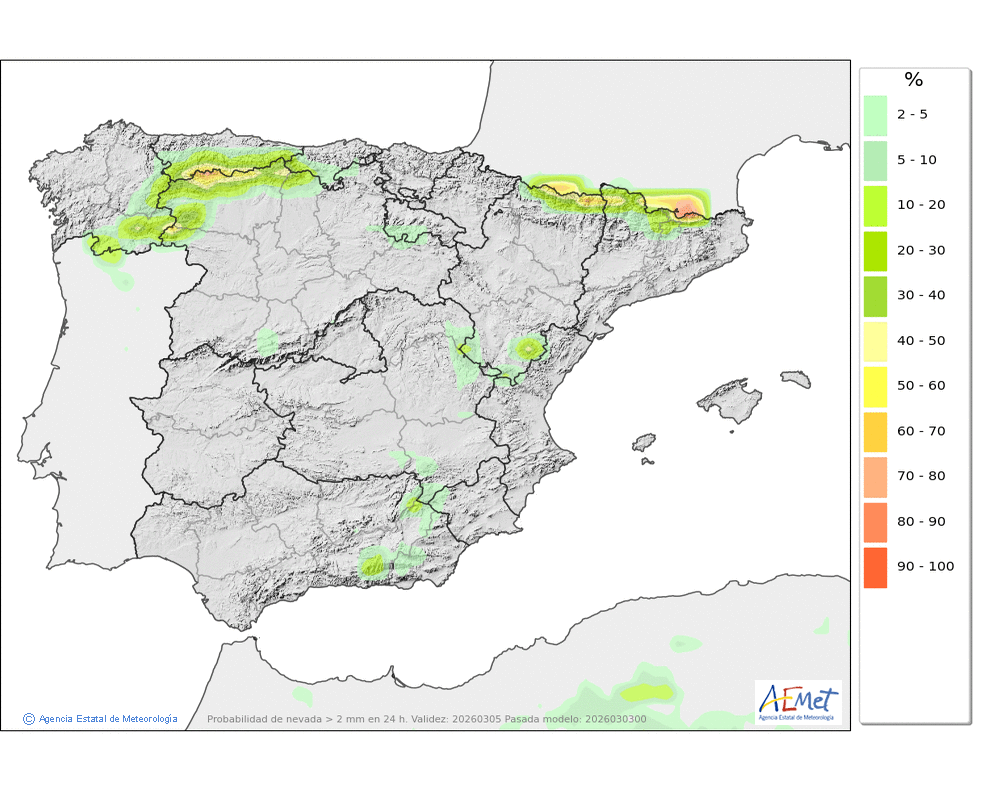 Se esperan precipitaciones moderadas, principalmente en la segunda mitad del día, cuando podrán ser persistentes. Cota de nieve: bajando de 2000-2200 metros a 1600-1800 al final del día.