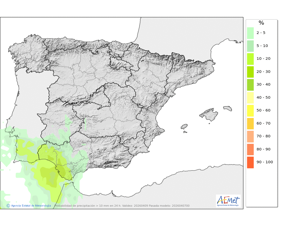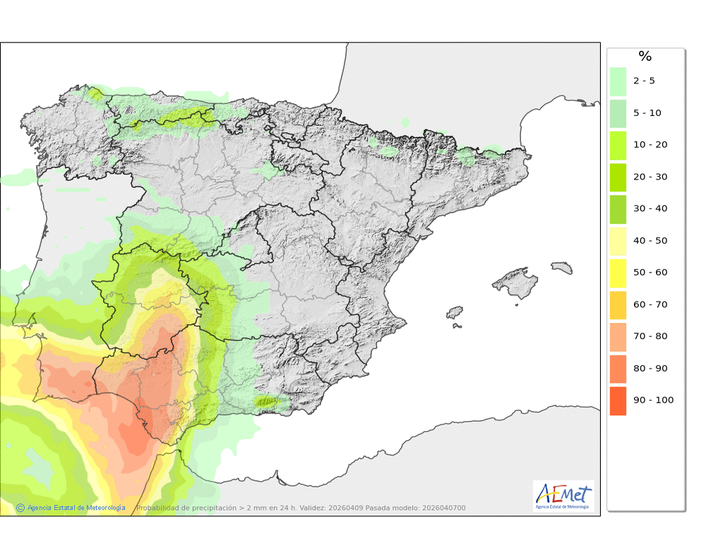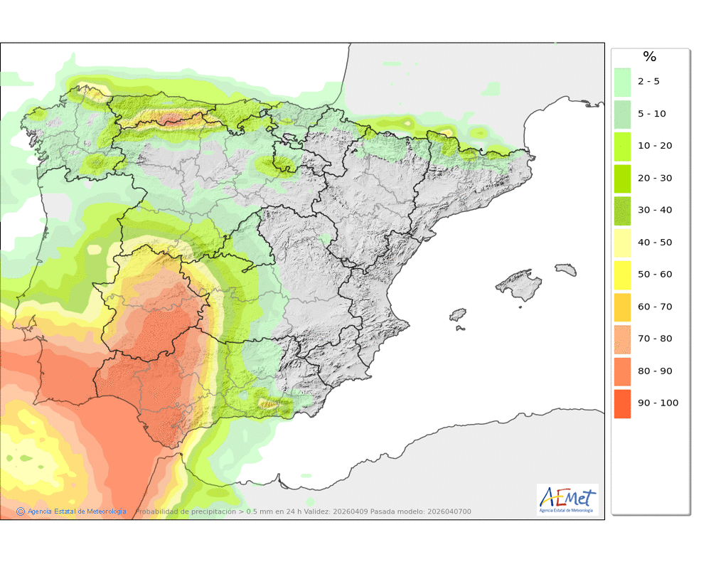 Se esperan precipitaciones débiles o moderadas, más probables durante la segunda mitad del día. Cota de nieve: bajando a lo largo de la tarde hasta unos 800 ó 900 metros.