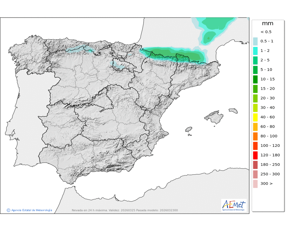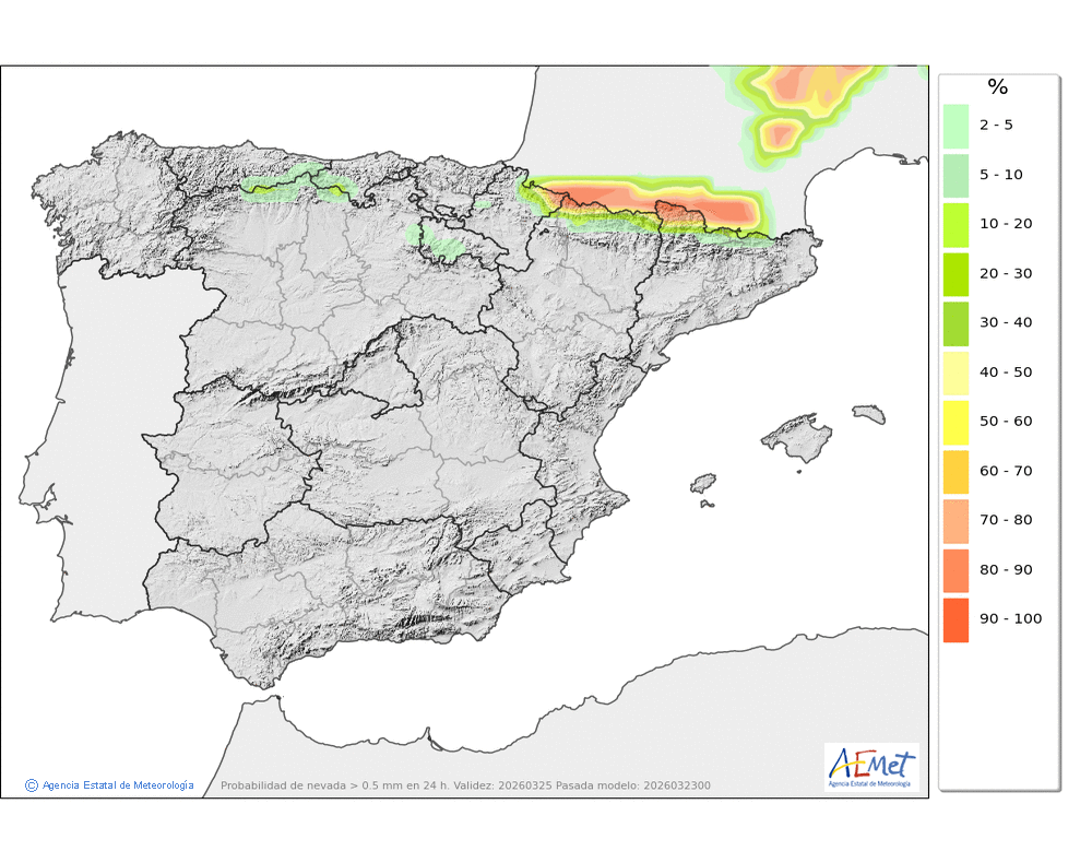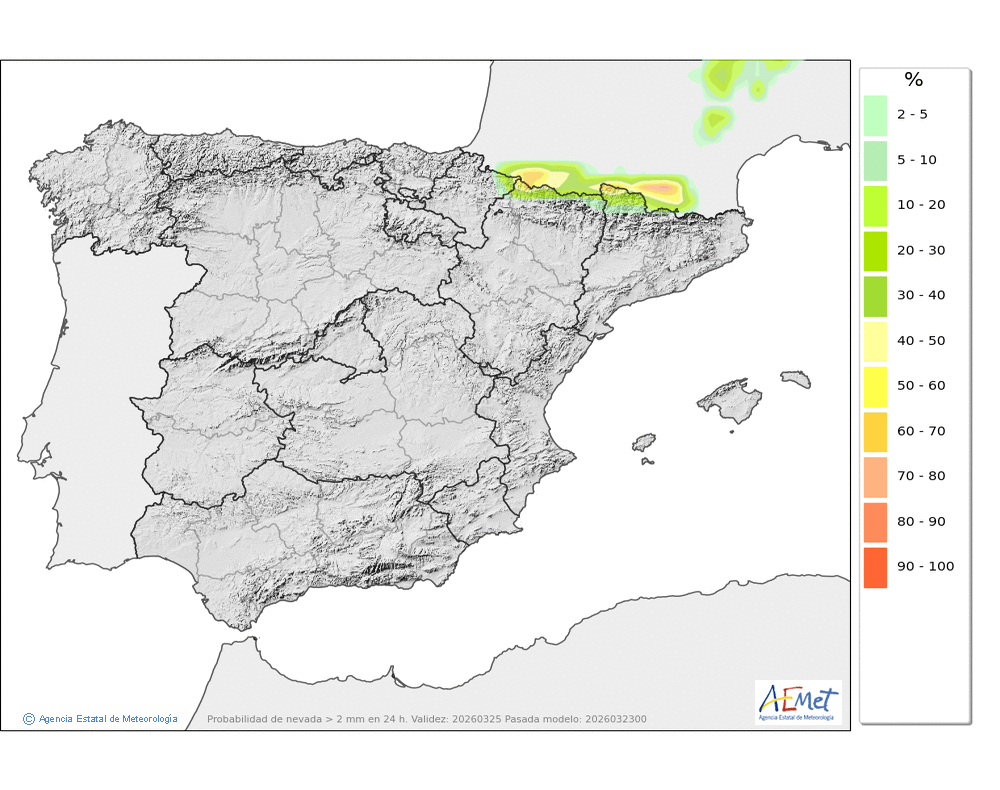 Débiles o moderadas durante la segunda mitad del día, principalmente en la divisoria fronteriza. Cota de nieve en acusado descenso, de 1600-1800 a 900 metros aproximadamente.