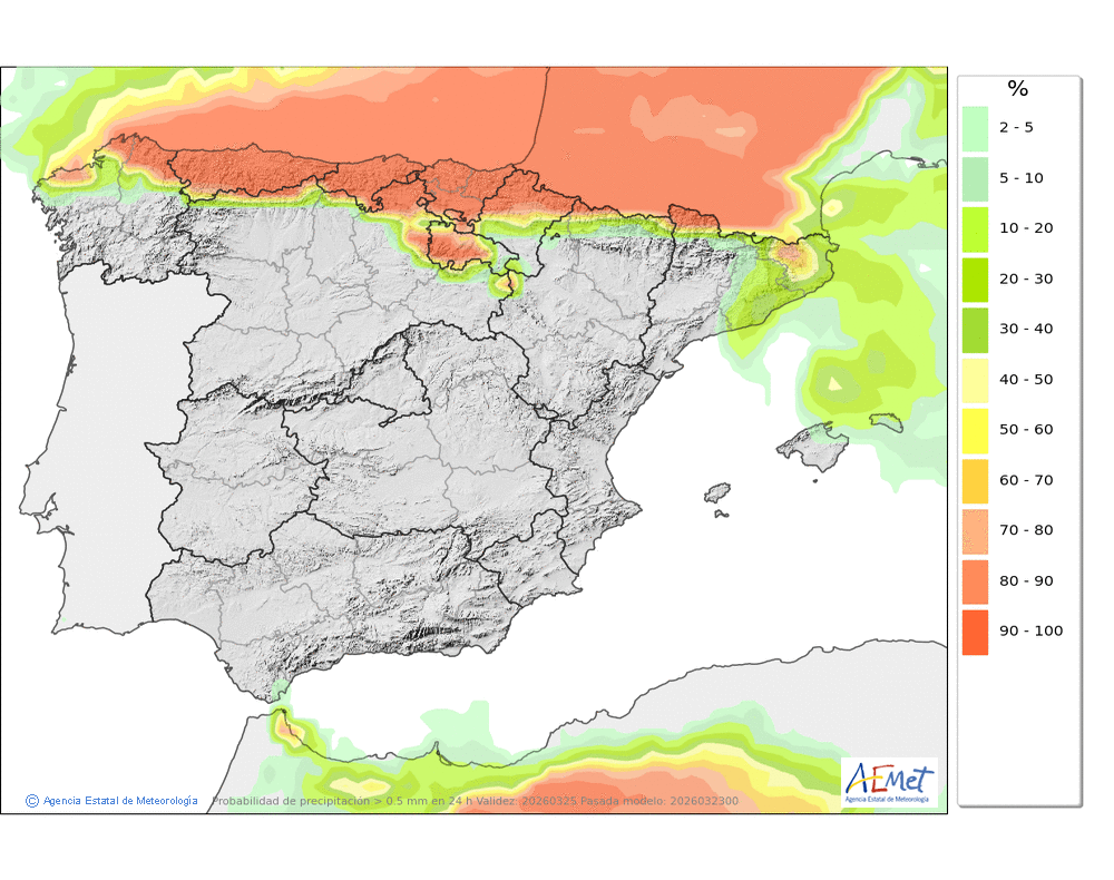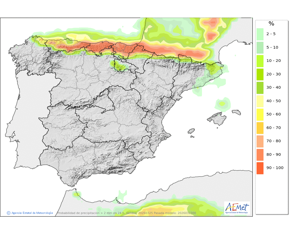 Mínimas sin cambios o en ligero ascenso, pudiendo producirse al final del día. Máximas con cambios ligeros o moderados, tendiendo a descender en el área occidental y ascender en la oriental. Heladas débiles, localmente moderadas en cotas altas.