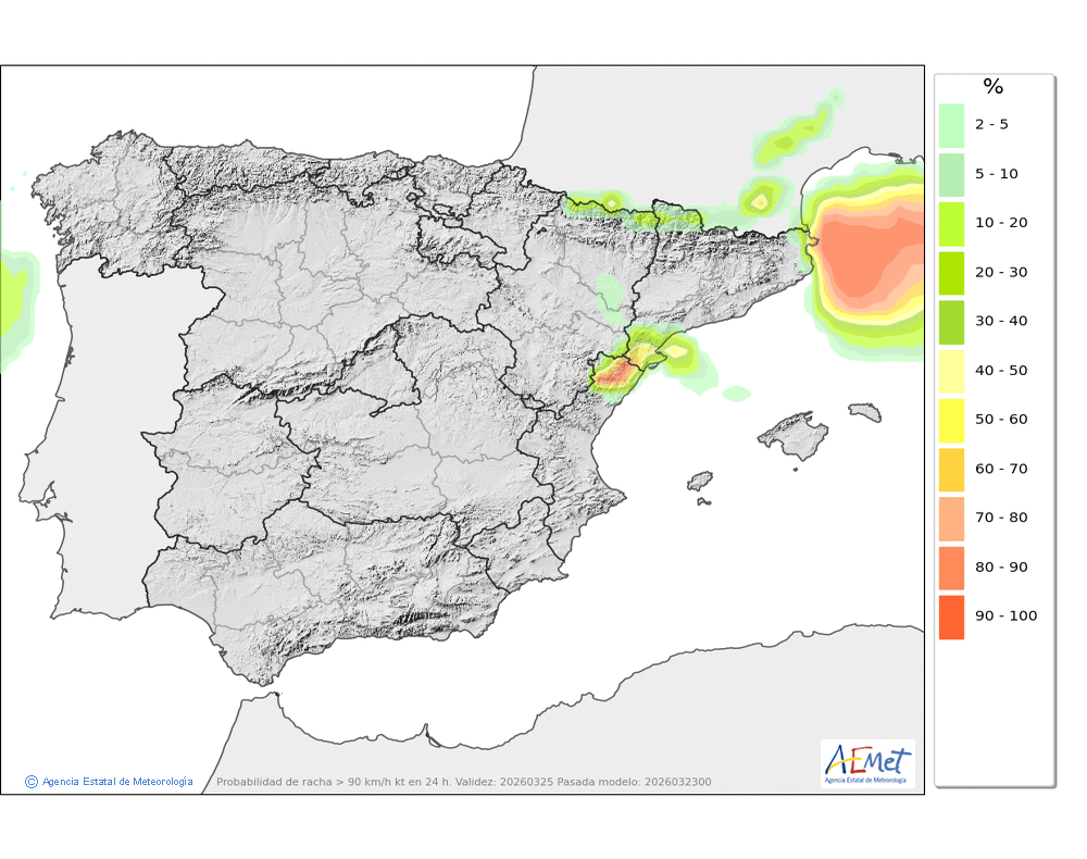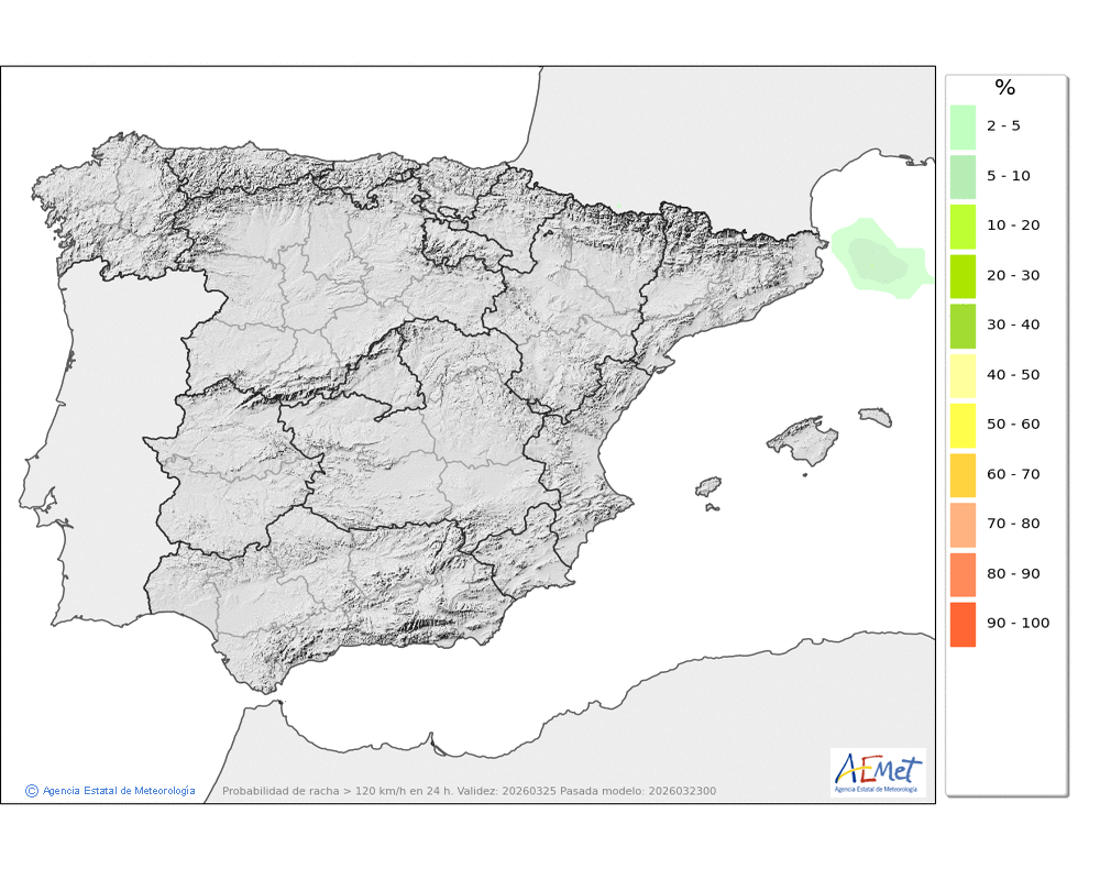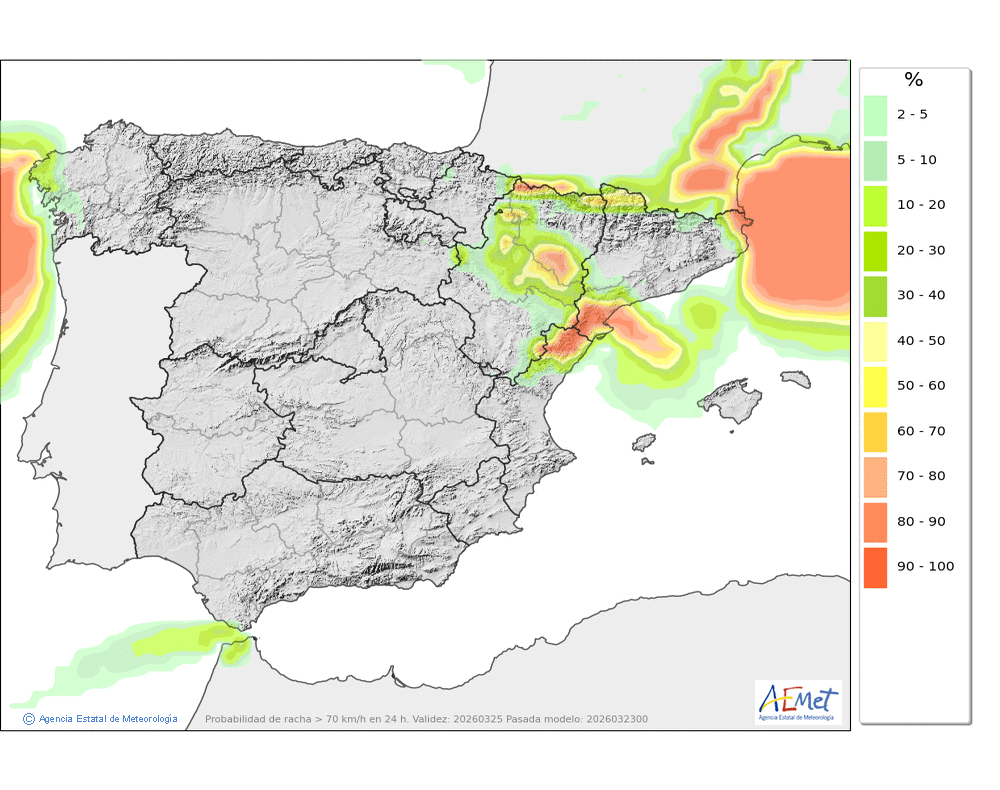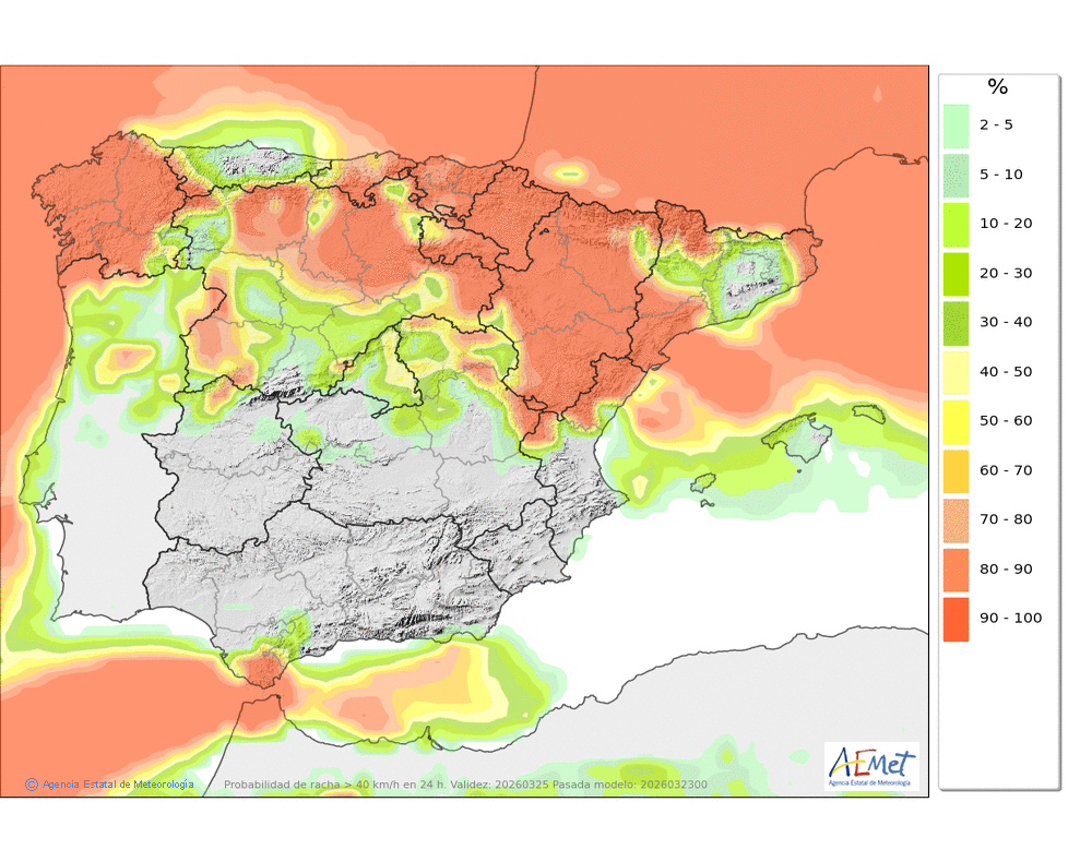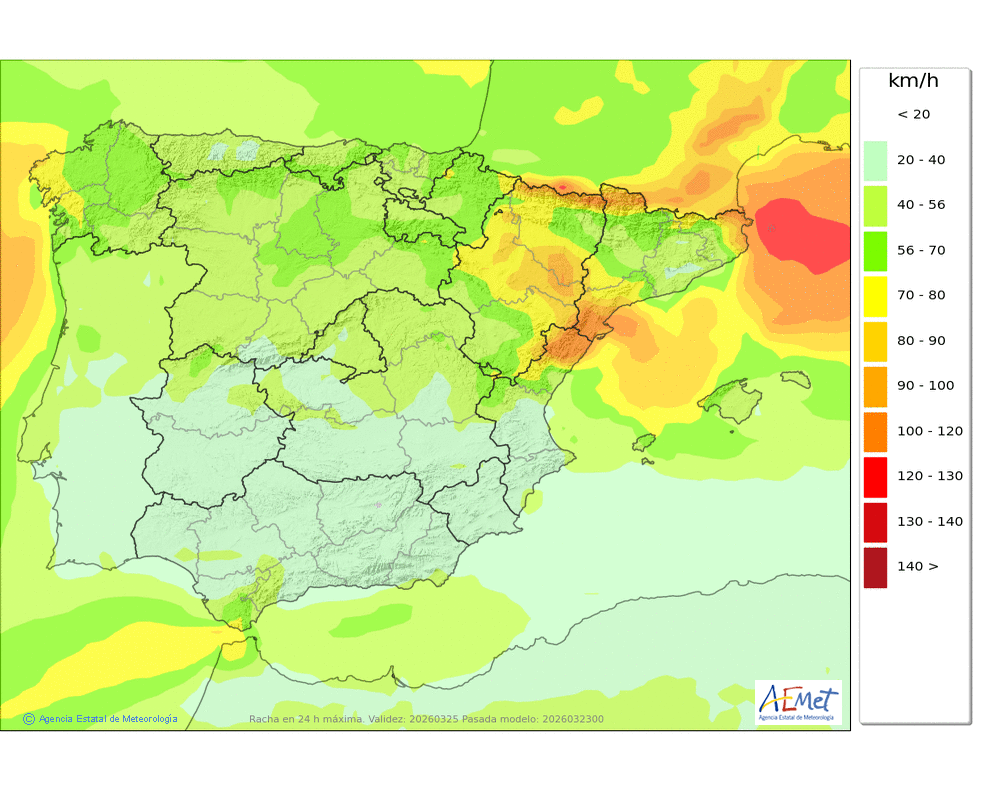 Flojo o moderado de componente oeste, tendiendo a fuerte del norte y noroeste, con rachas muy fuertes en cotas altas y zonas expuestas que podrían superar los 100 km/h.