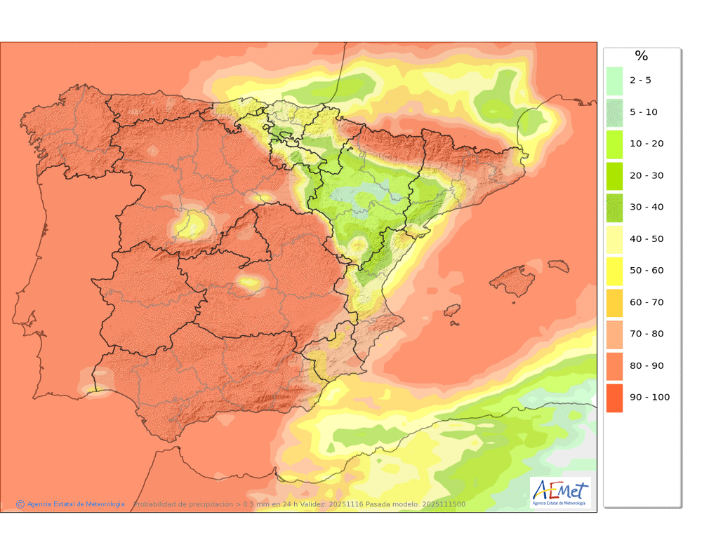 Se esperan precipitaciones generalizadas de madrugada, débiles o localmente moderadas, y a media tarde también chubascos en el Ripollés. Cota de nieve: 2000-2200 metros.