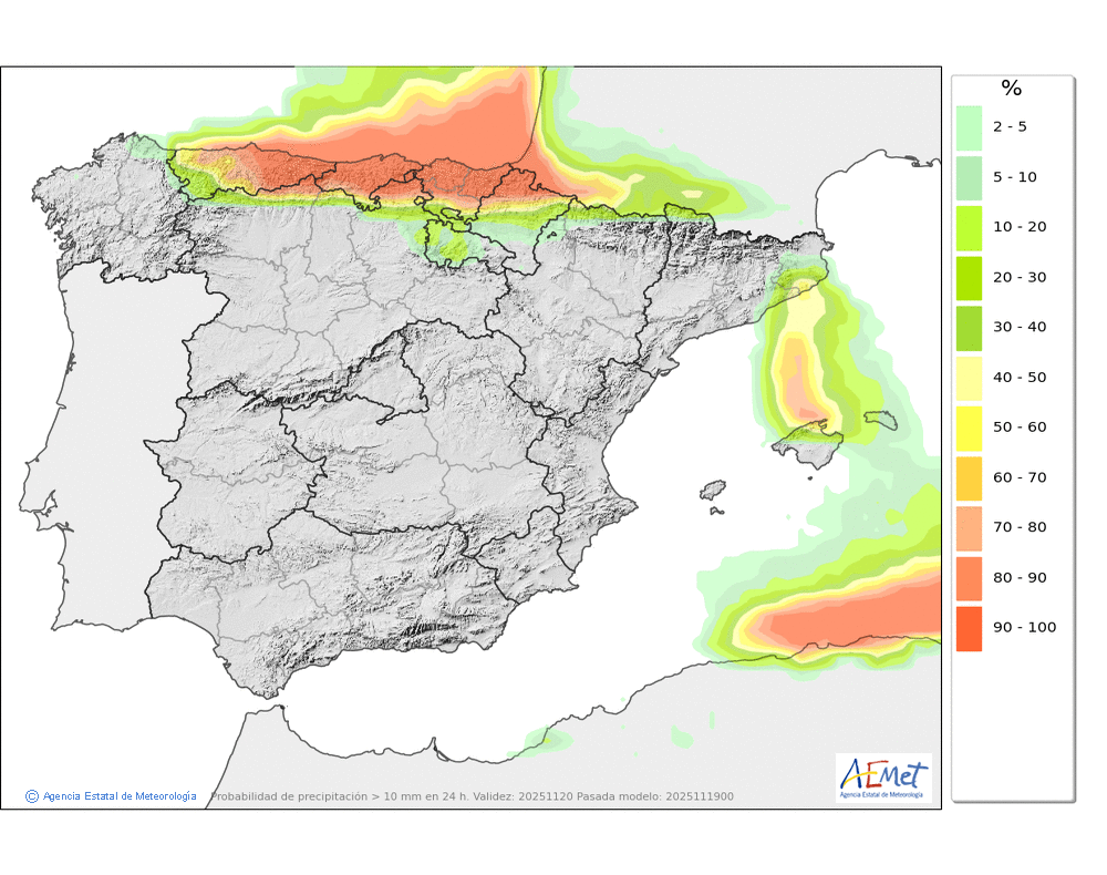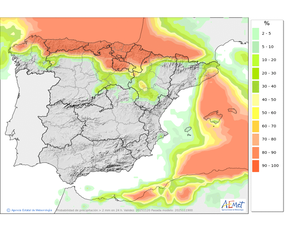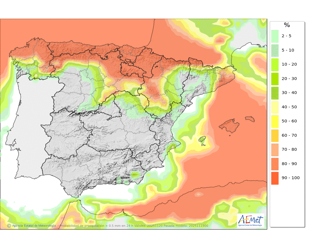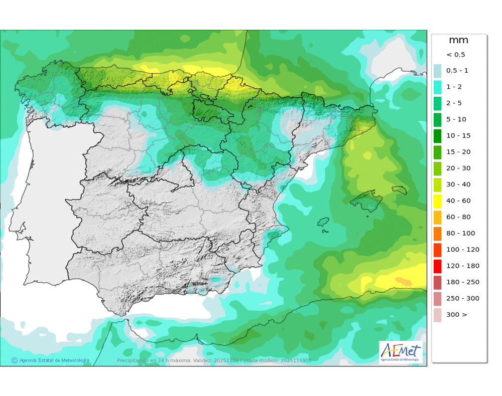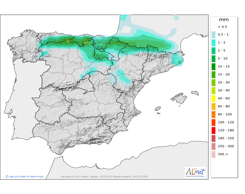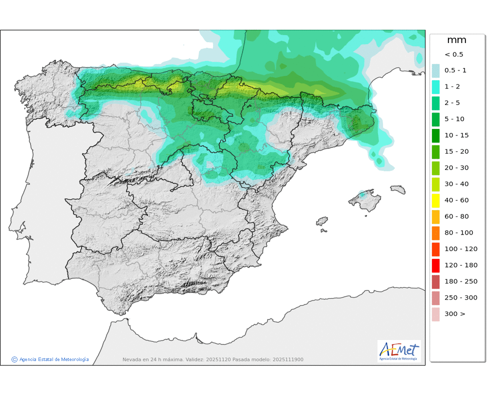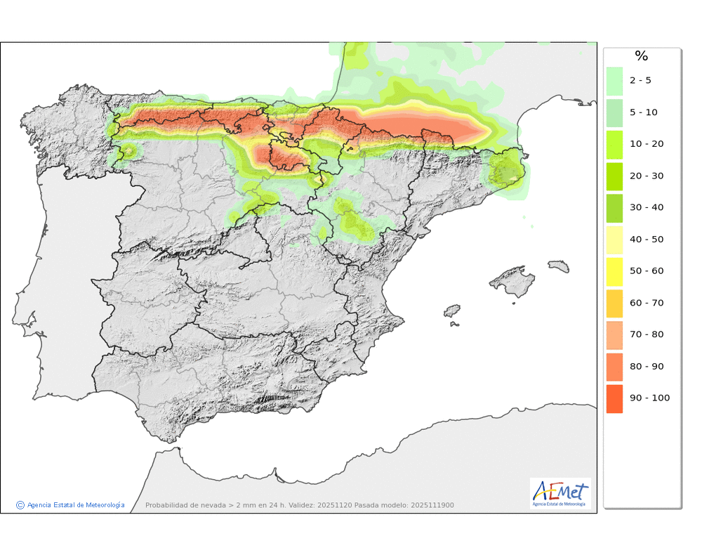Se esperan precipitaciones débiles o localmente moderadas en Arán y Franja Norte Pallaresa, que podrían afectar al resto de manera más dispersa y ocasional. Cota de nieve: bajando de 1.000 ó 1.200 metros a cualquier altitud.