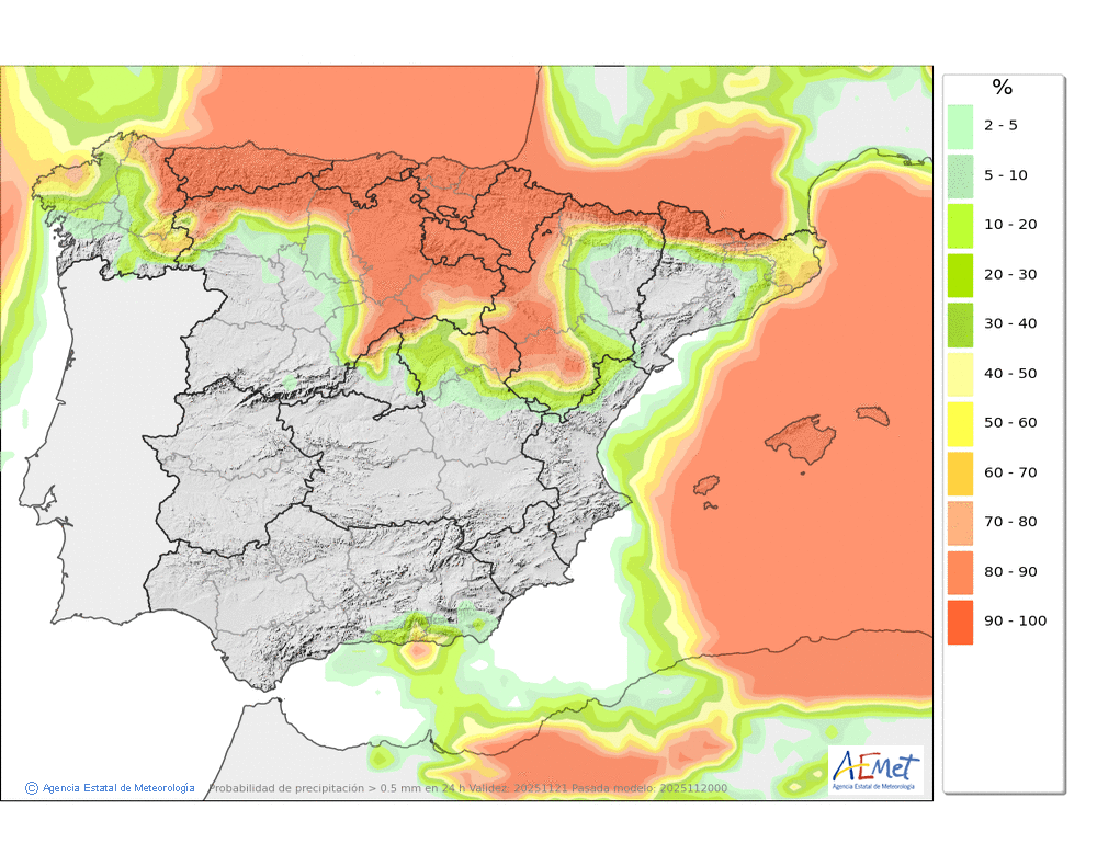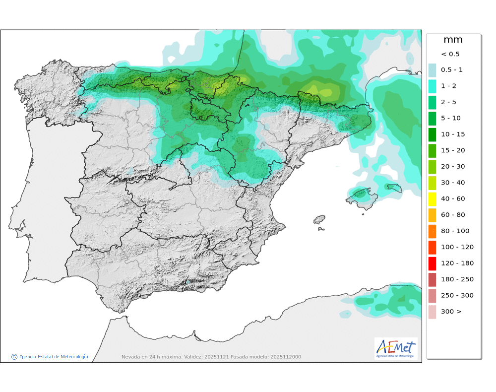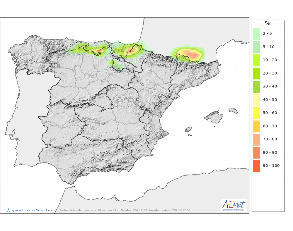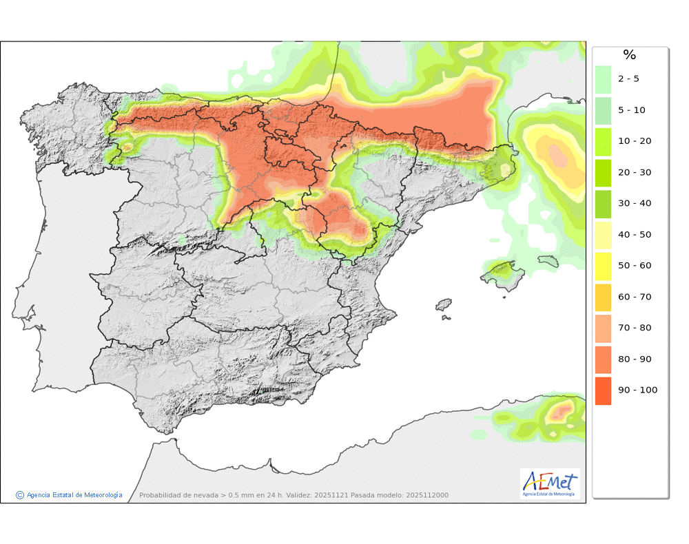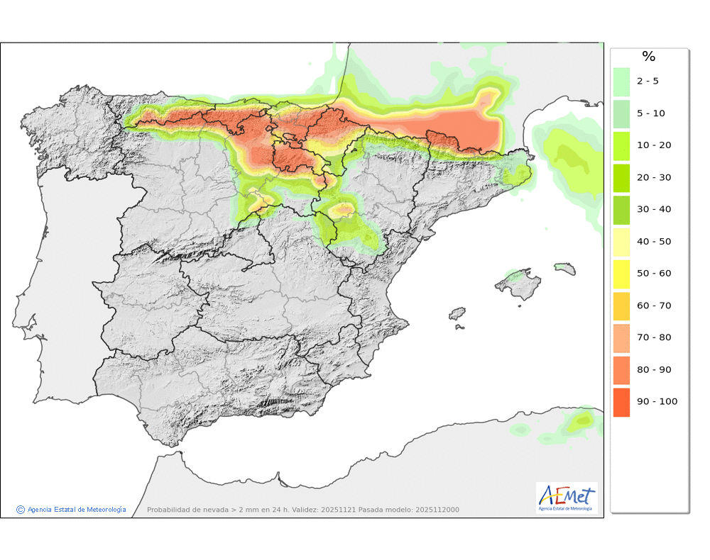 Se esperan nevadas débiles o localmente moderadas en el valle de Arán y Franja Norte Pallaresa, que podrán afectar de manera más ocasional al resto de la divisoria con Francia, siendo ya poco probables en el resto. Probables ventiscas acompañando a las nevadas.