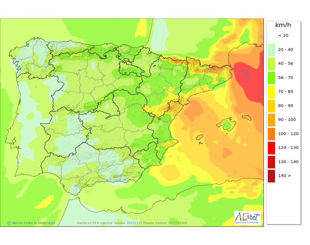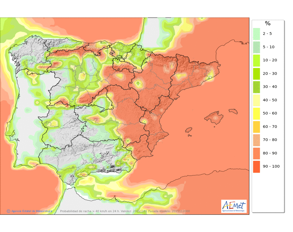 Fuerte del norte y noroeste, con rachas muy fuertes en cotas altas y zonas expuestas, que podrán superar los 100 km/h al final del día.