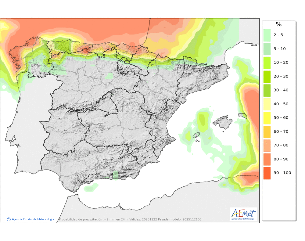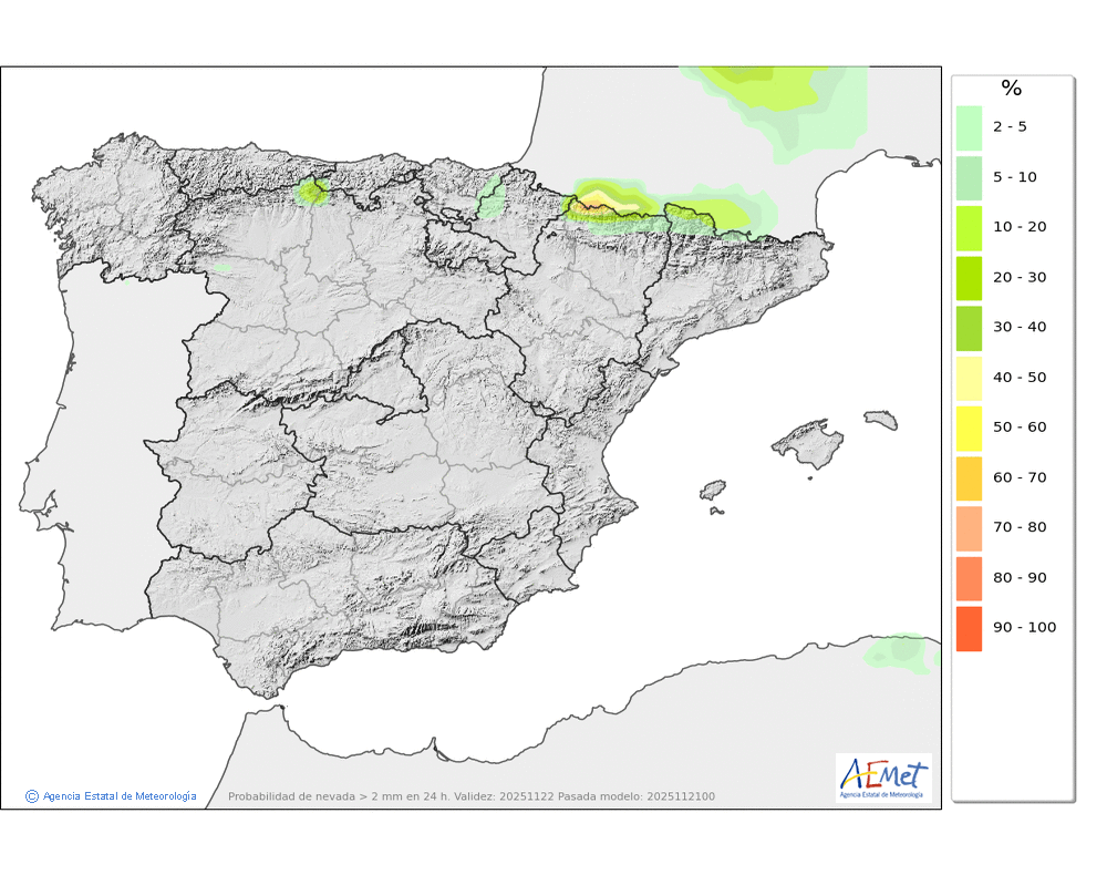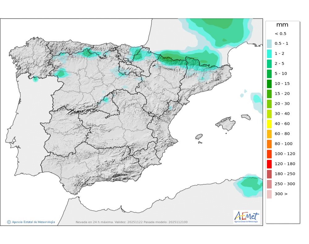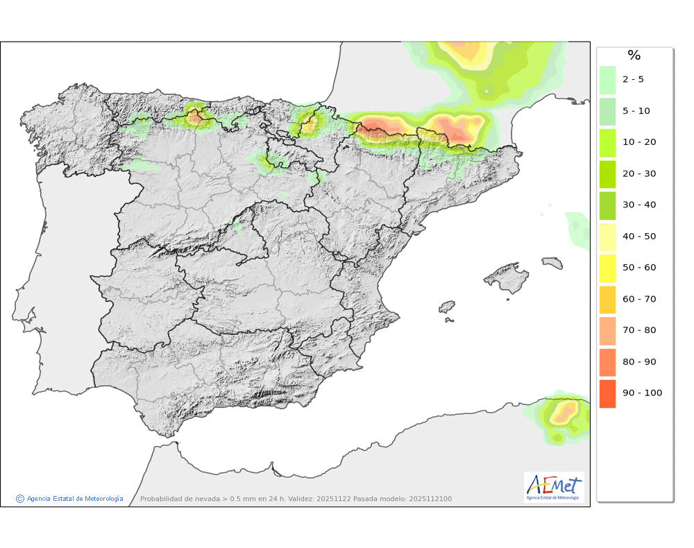 En cotas altas (red automática): 0.4ºC en La Molina (1703 m), -1ºC en Port del Comte (1813 m) y Cap de Rec (1940 m), -8ºC en Port Aine (2410 m), -9ºC en Cap de Vaqueira (2467 m).