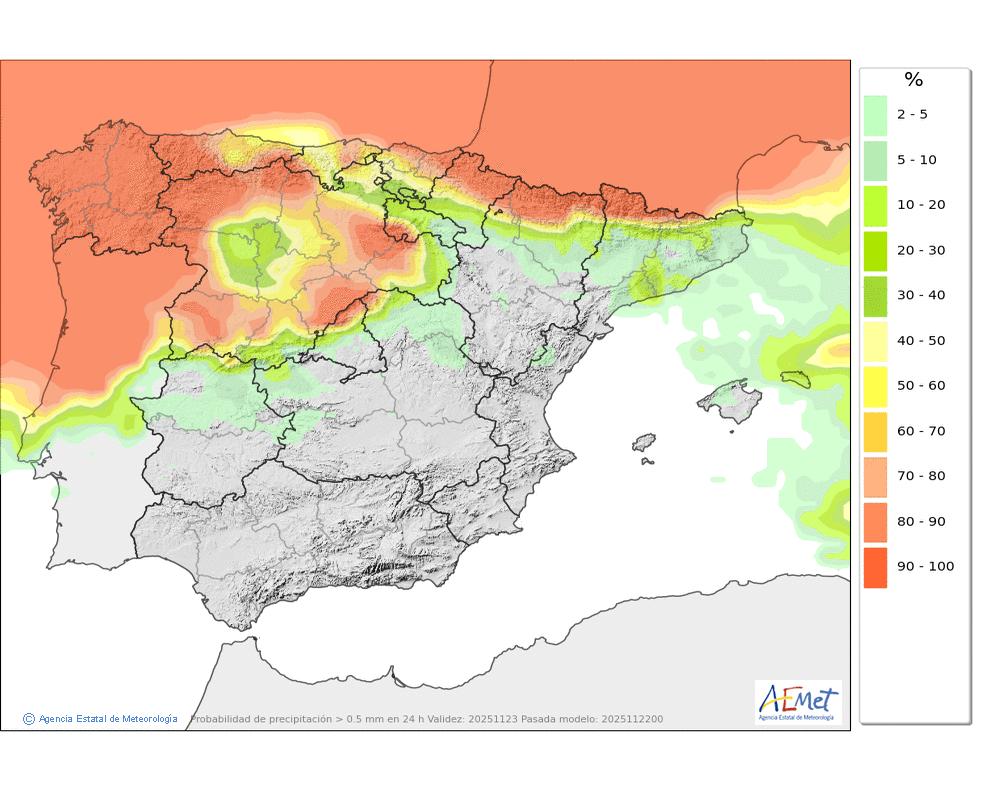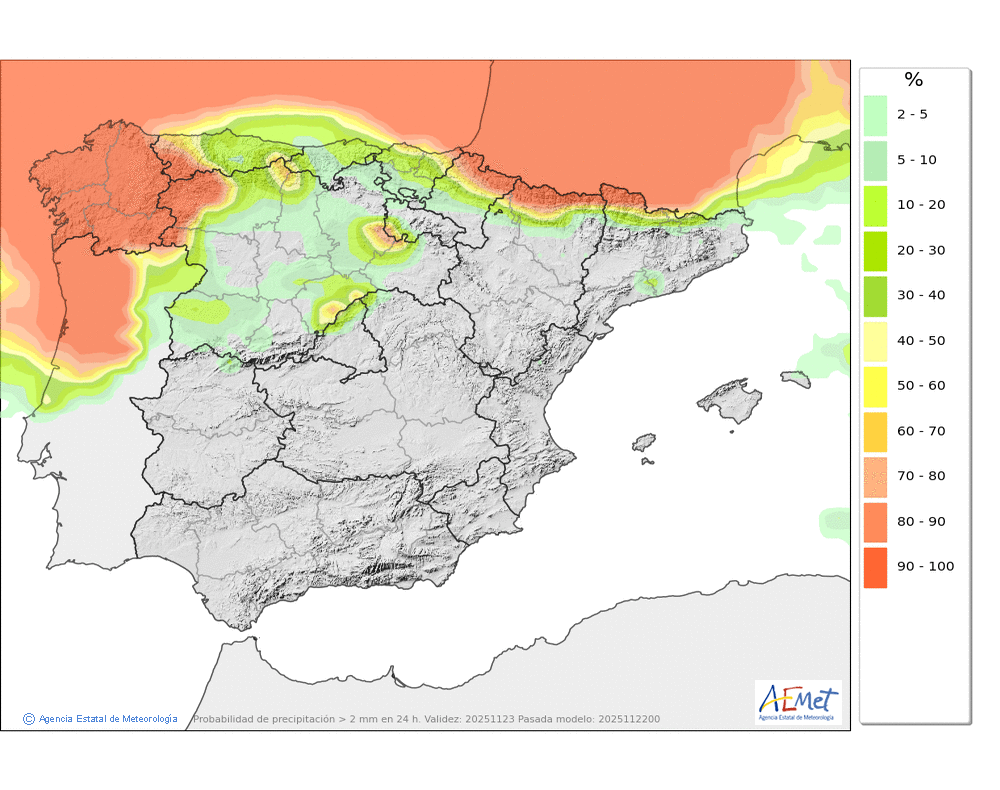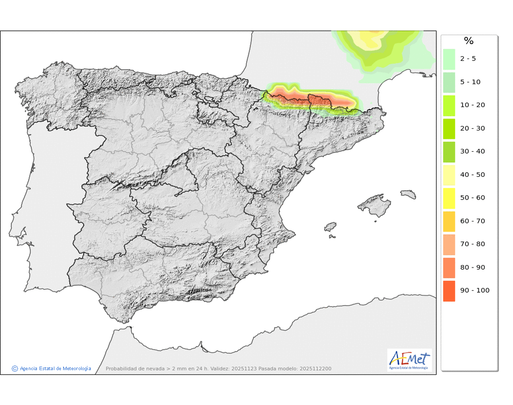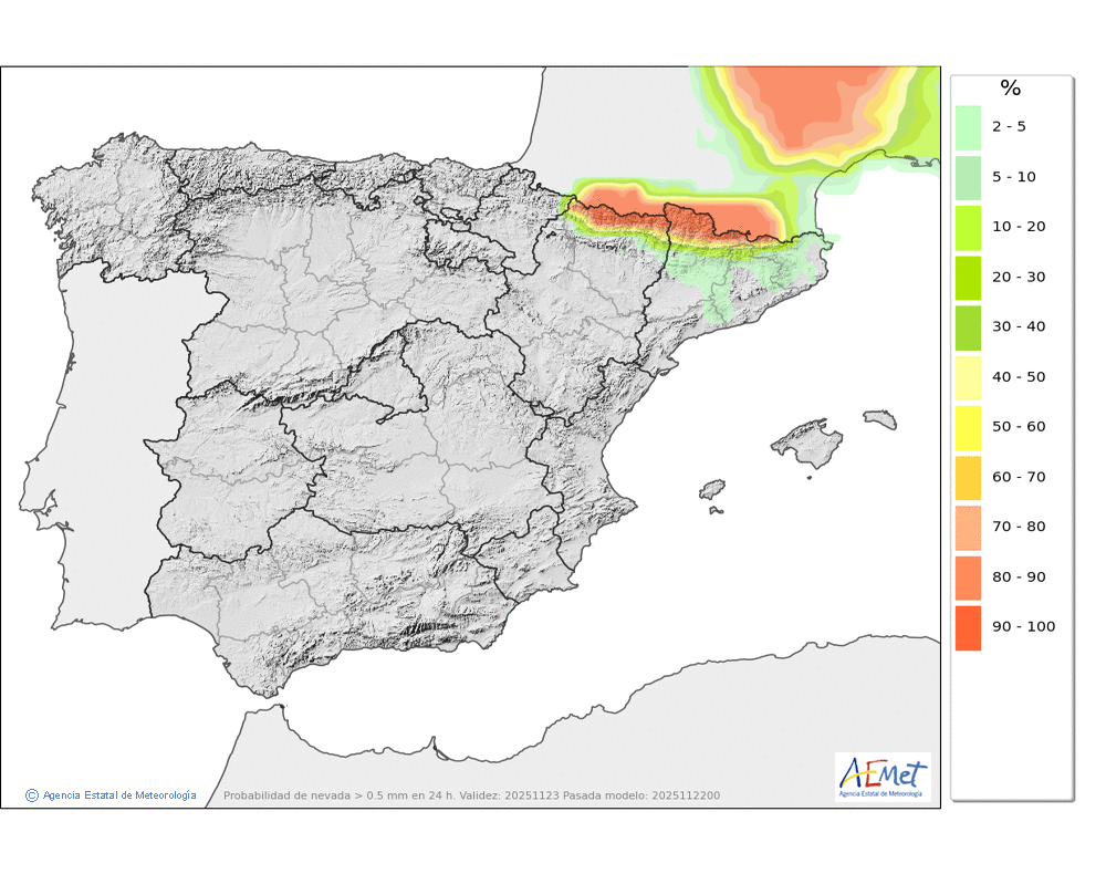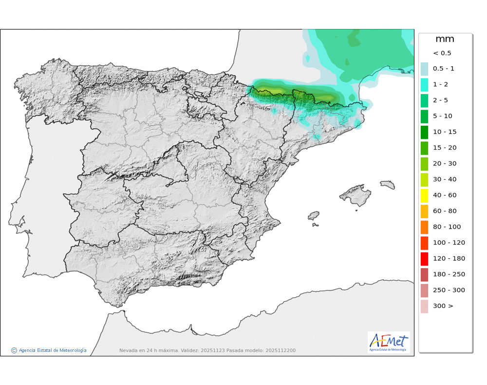 Débiles o moderadas, principalmente en el Arán y norte de los macizos occidentales durante la primera mitad del día. Cota de nieve subiendo rápidamente desde unos 800-1000 metros hasta los 1900-2000. No se descarta que localmente se pueda producir lluvia engelante de madrugada.