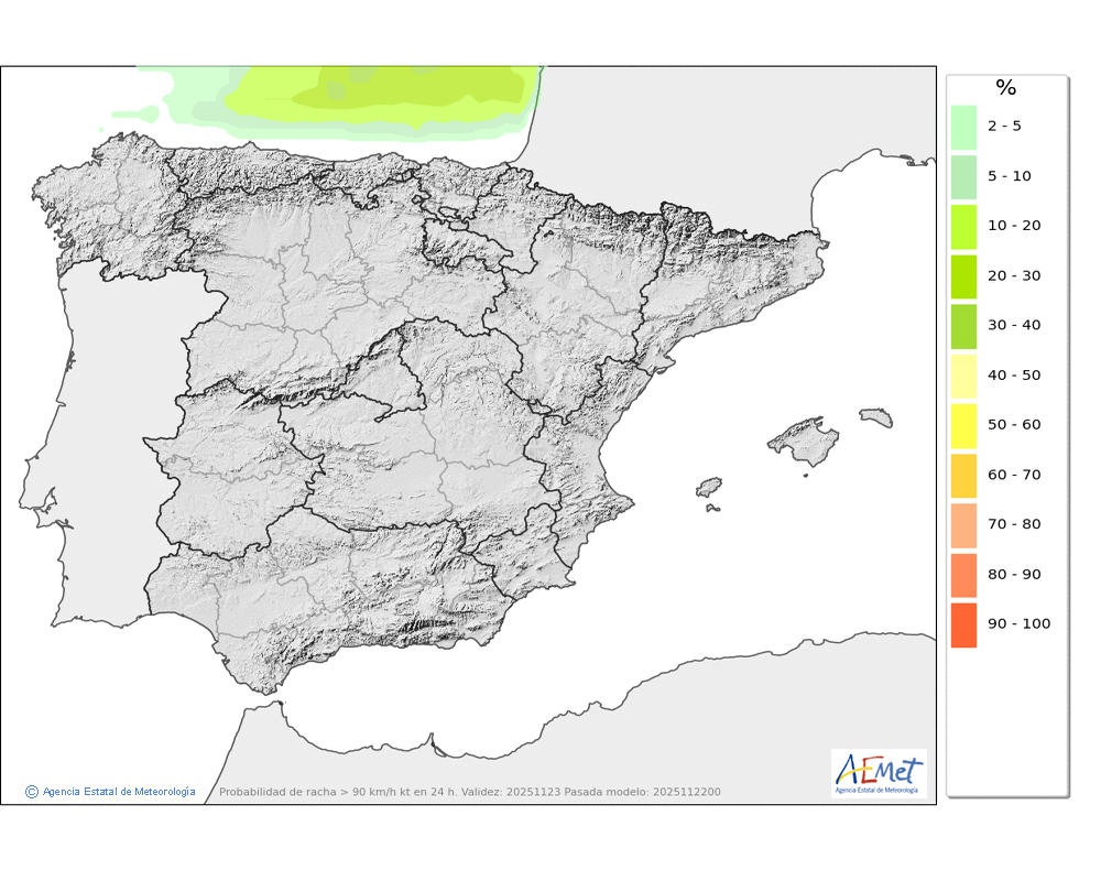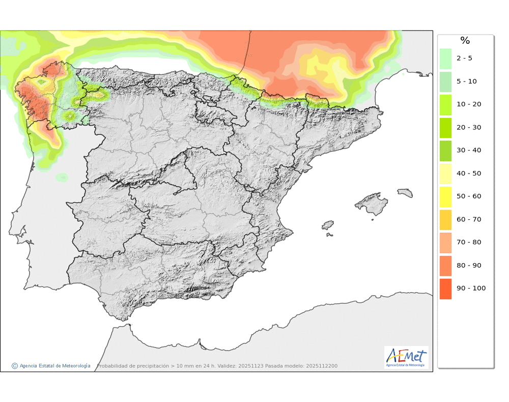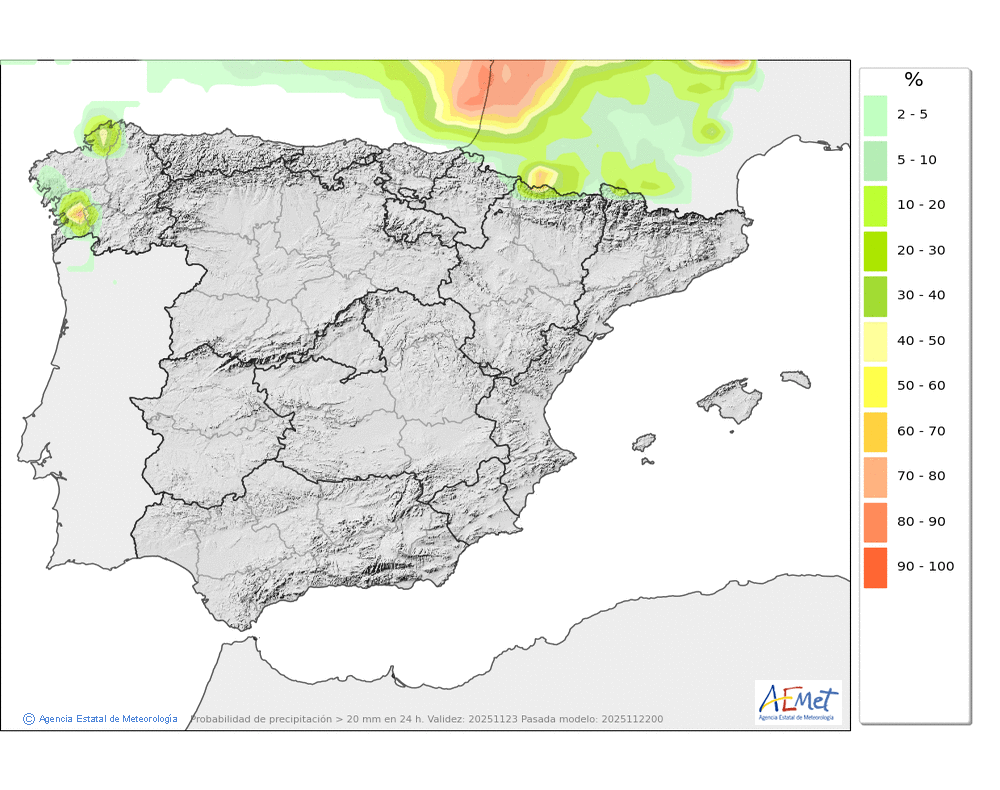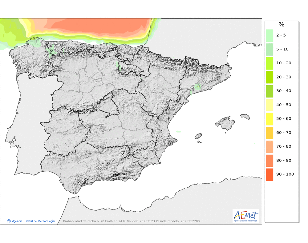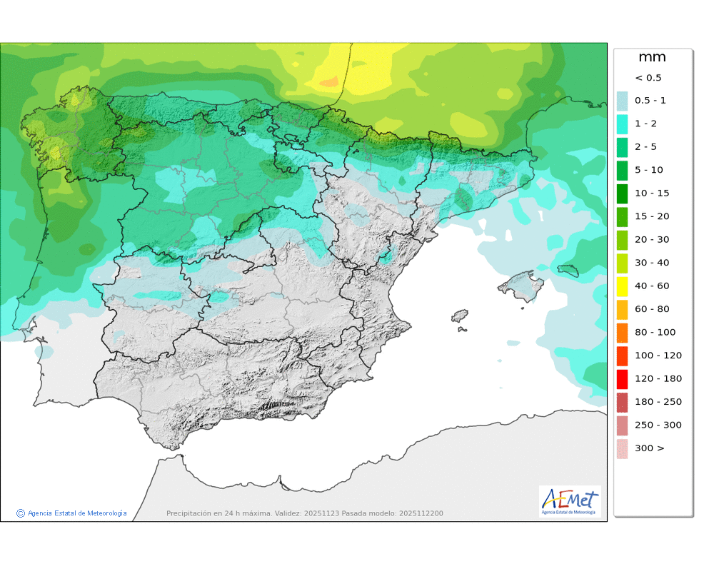 Débiles o moderadas, principalmente en el Arán y norte de los macizos occidentales durante la primera mitad del día. Cota de nieve subiendo rápidamente desde unos 800-1000 metros hasta los 1900-2000. No se descarta que localmente se pueda producir lluvia engelante de madrugada.