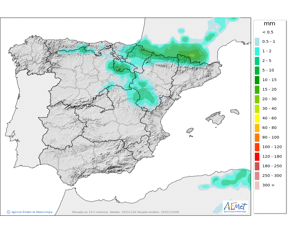 Débiles, o localmente moderadas, en el entorno de la divisoria occidental, tendiendo a perder intensidad y remitiendo a lo largo de la mañana, más frecuentes en el Arán y norte de la Pallaresa. Cota de nieve en torno a 500-700 metros.
