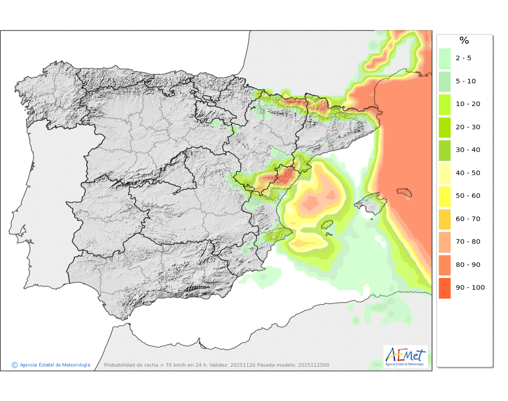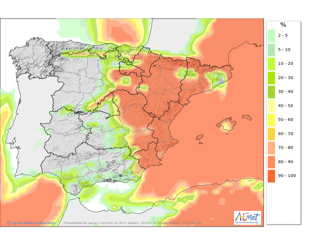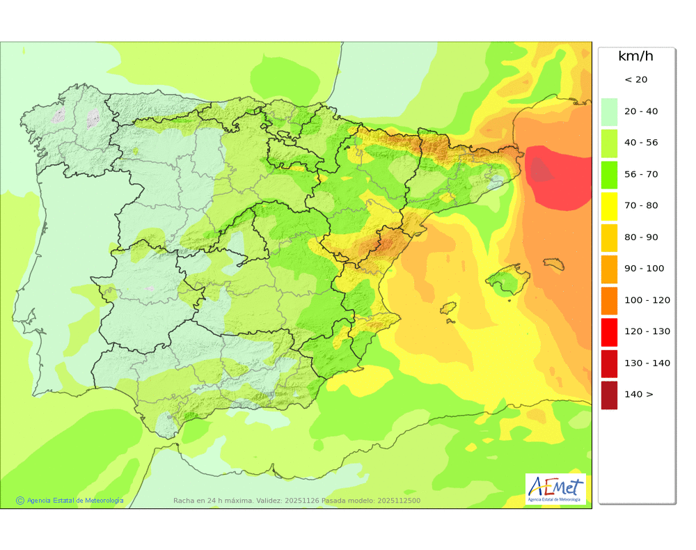 Moderado o fuerte de componente norte, con rachas muy fuertes en cotas altas y zonas expuestas, que podrán superar los 100-110 km/h.