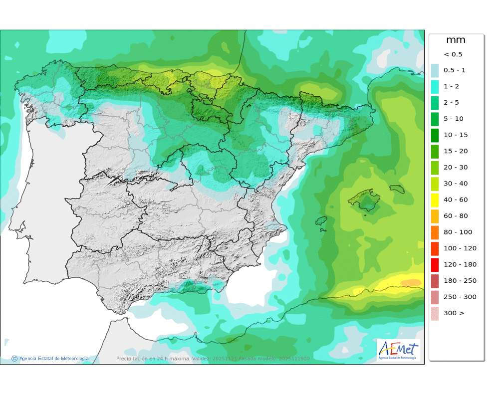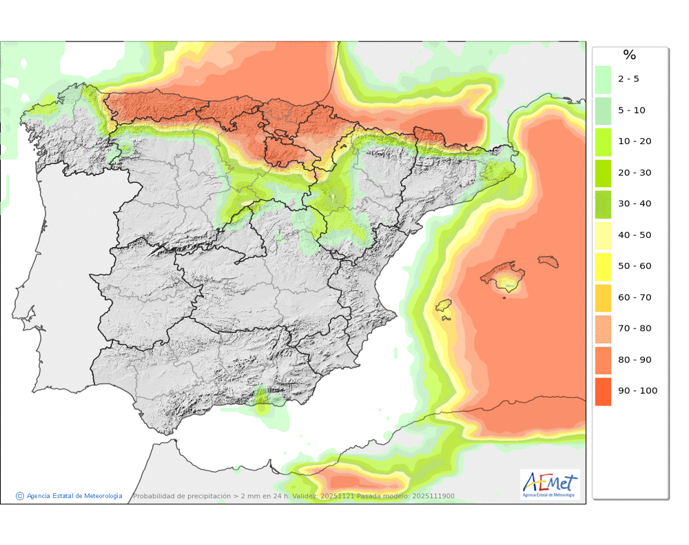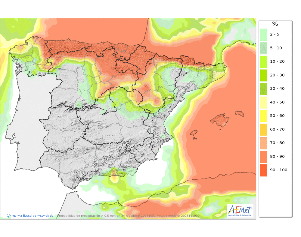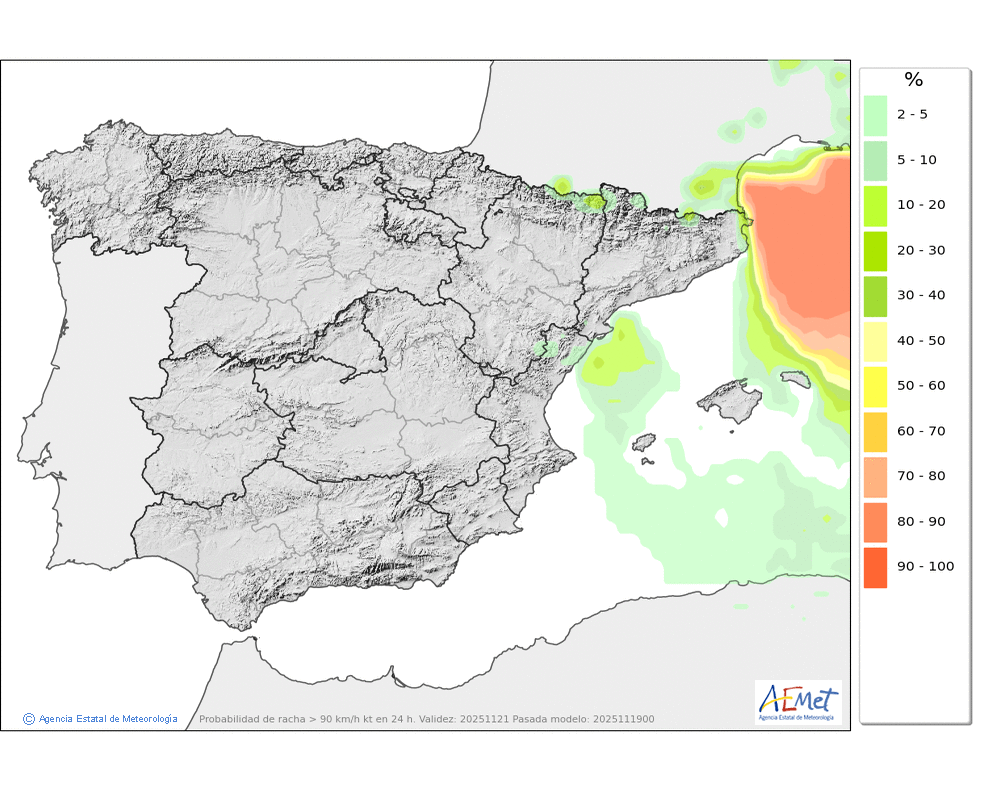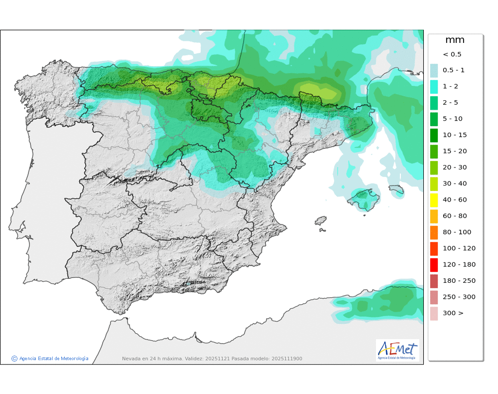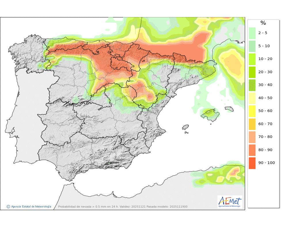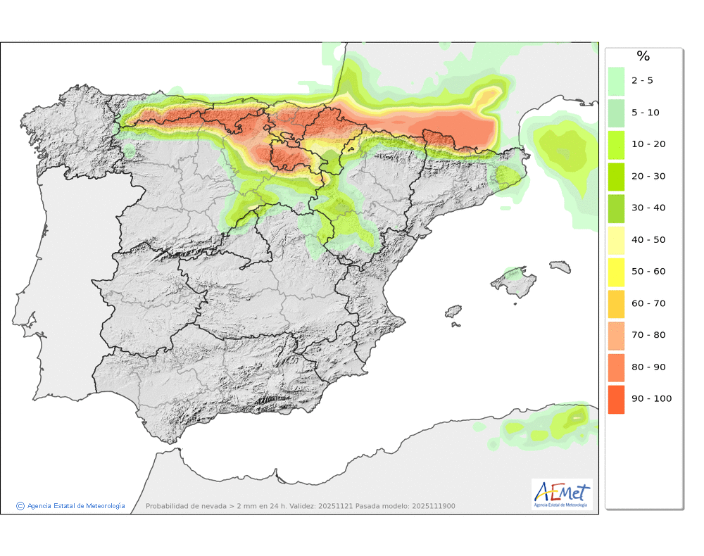Se esperan nevadas débiles o moderadas en el valle de Arán y Franja Norte Pallaresa, que podrán afectar de manera más ocasional al resto de la divisoria con Francia, siendo ya poco probables en el resto. Probables ventiscas acompañando a las nevadas.