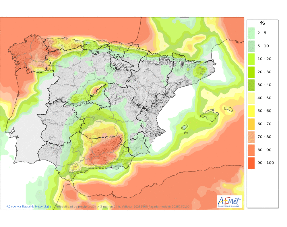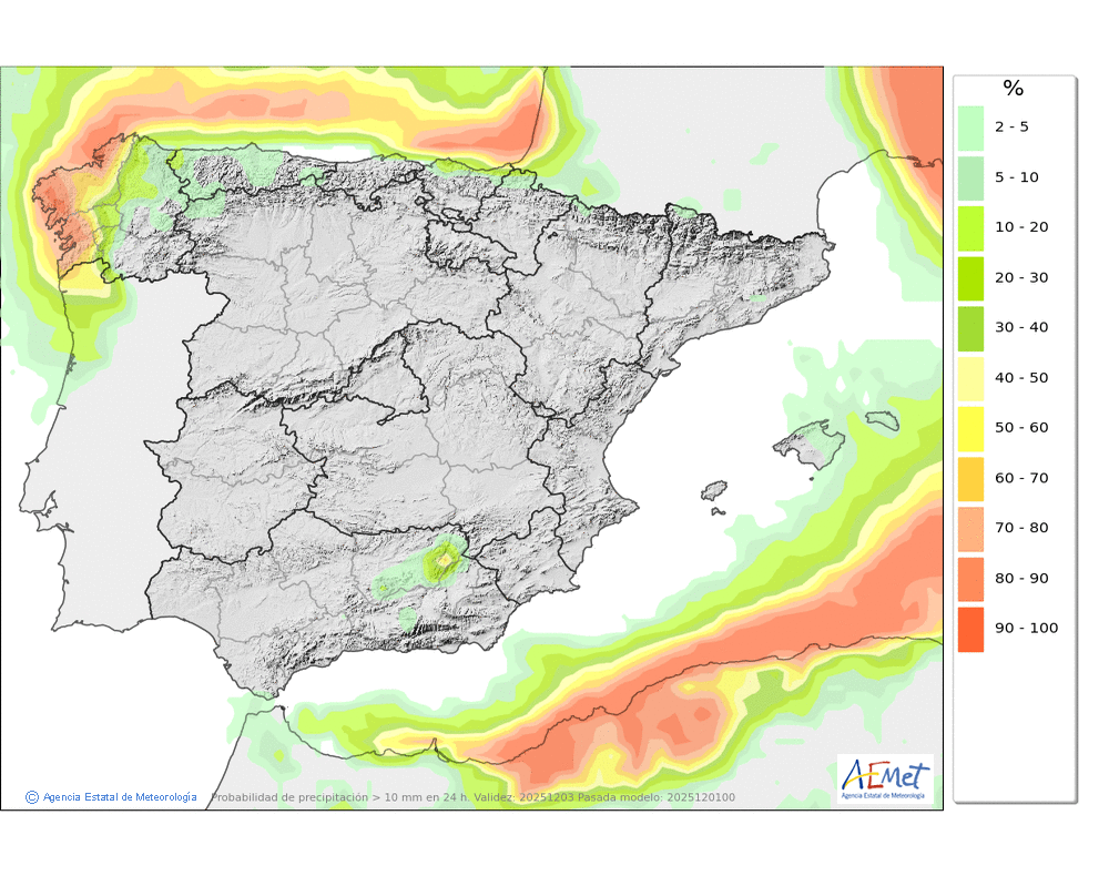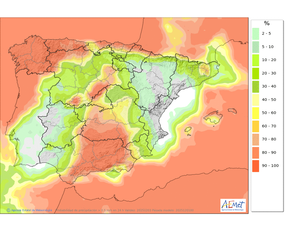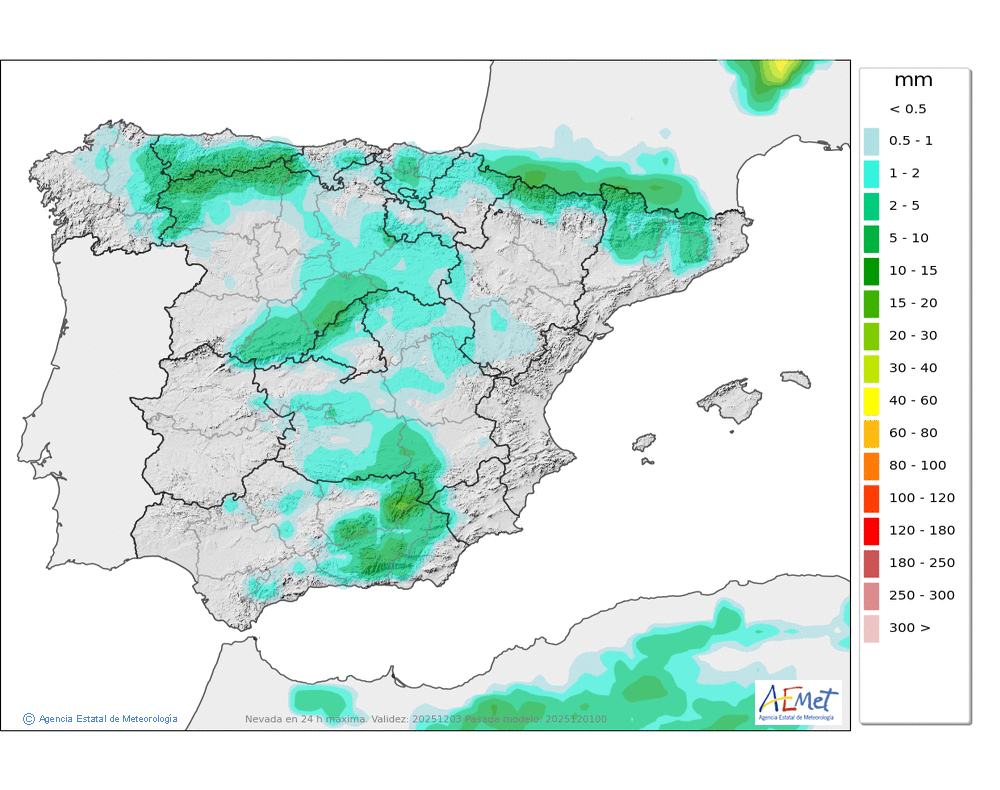 Son probables algunas lluvias y chubascos ocasionales en zonas próximas a la divisoria fronteriza, sin descartarse en el resto. Cota de nieve en torno a 1300-1000 metros.