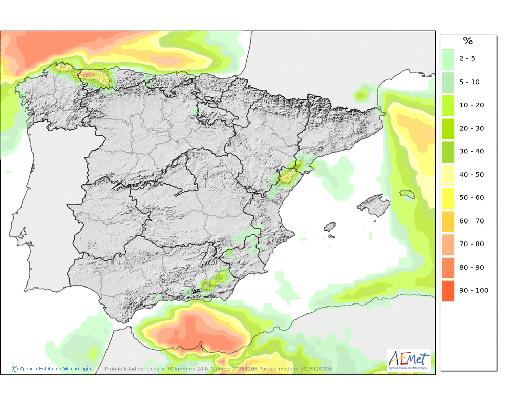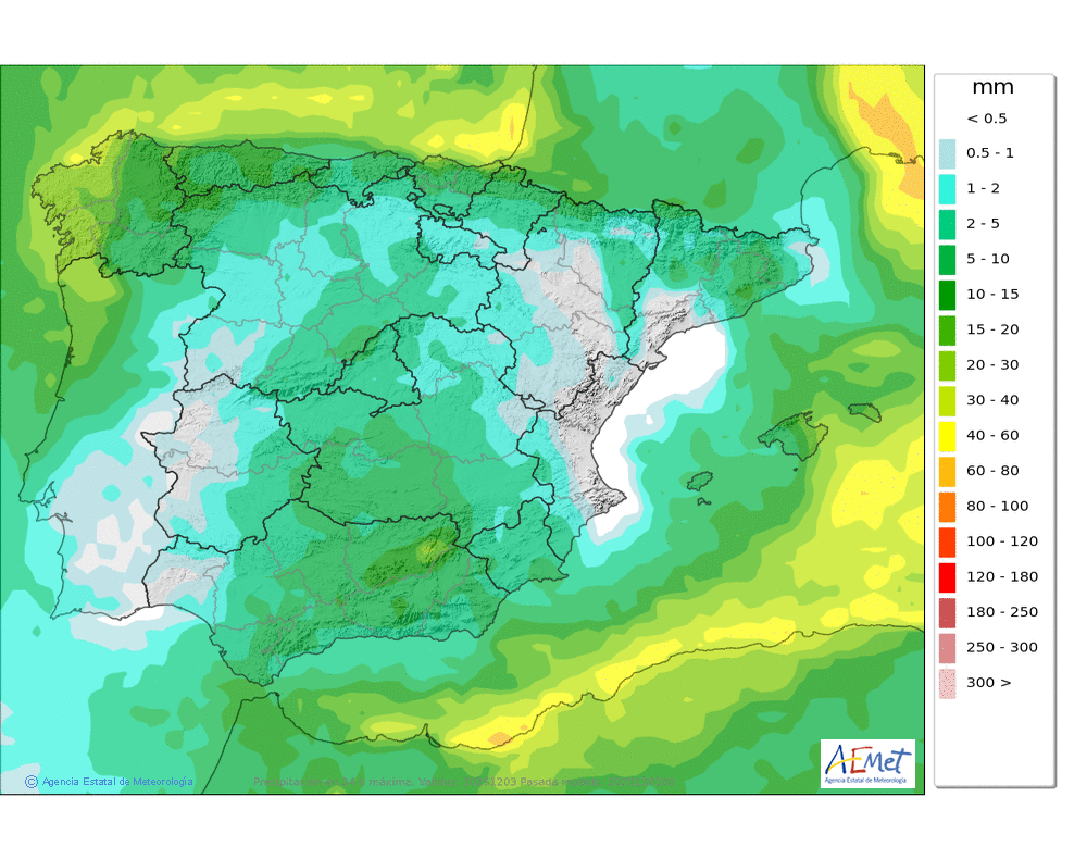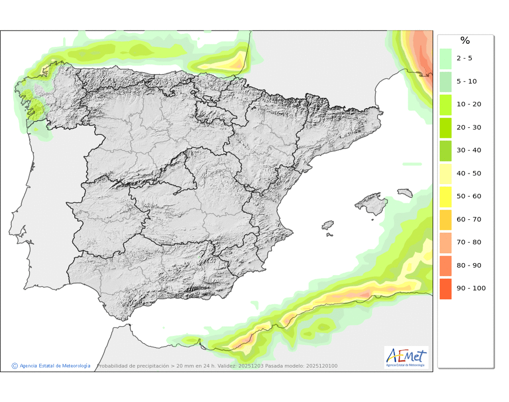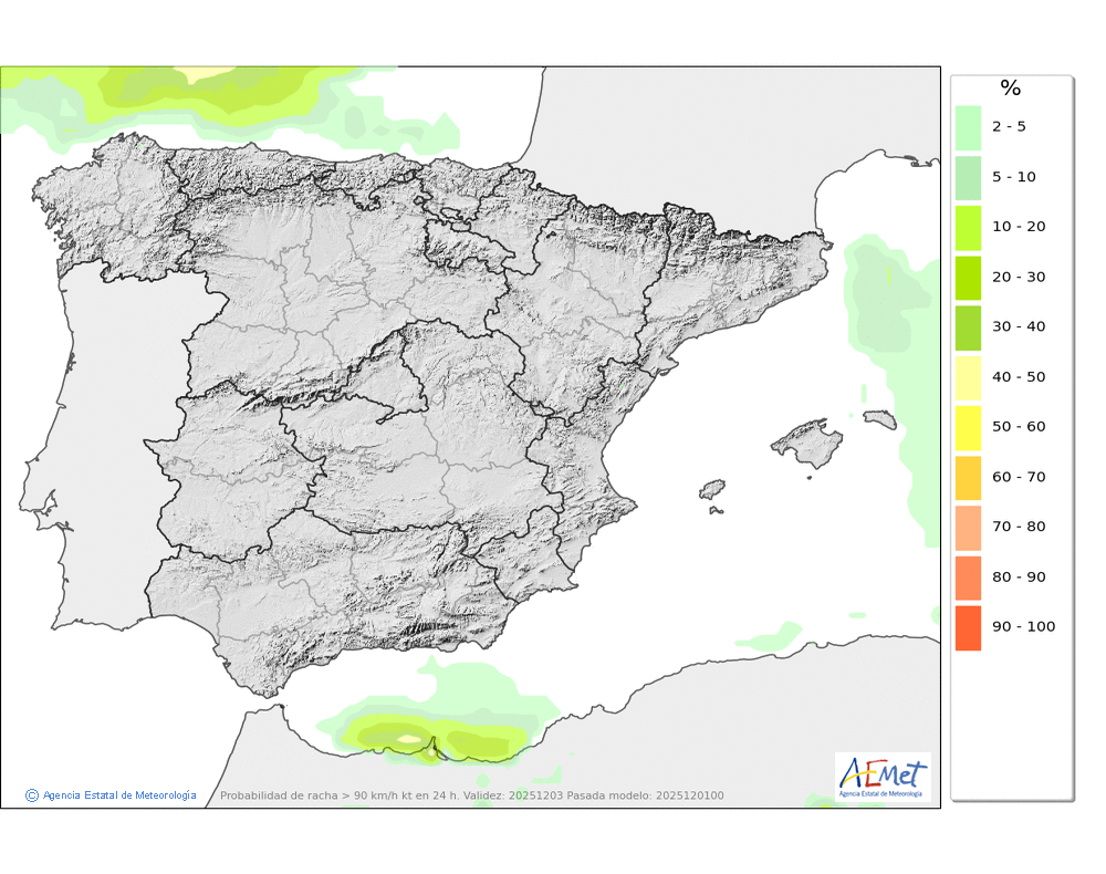 Son probables algunas lluvias y chubascos ocasionales en zonas próximas a la divisoria fronteriza, sin descartarse en el resto. Cota de nieve en torno a 1300-1000 metros.