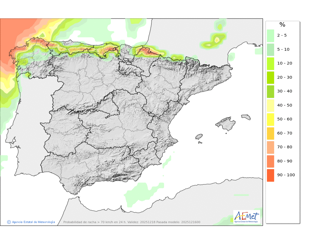 No se descartan débiles o localmente moderadas. Cota de nieve en torno a 1600-1800 metros aproximadamente, pudiendo ascender al final del día.