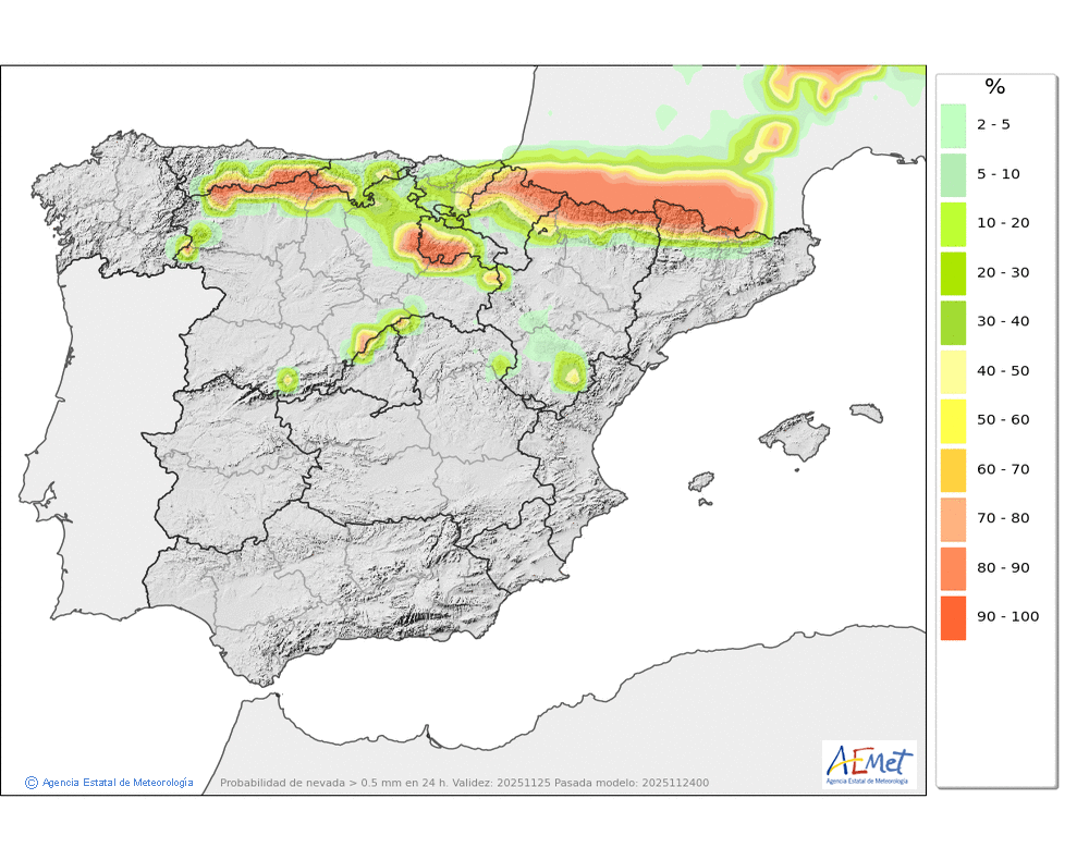 Moderadas y frecuentes, que podrían llegar a ser localmente persistentes en puntos de la divisoria fronteriza. Cota de nieve en descenso, de 1200 a 800-900 metros.