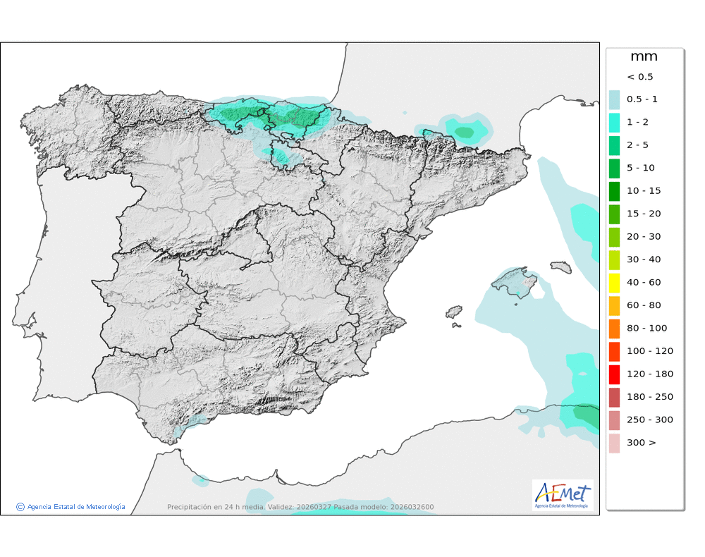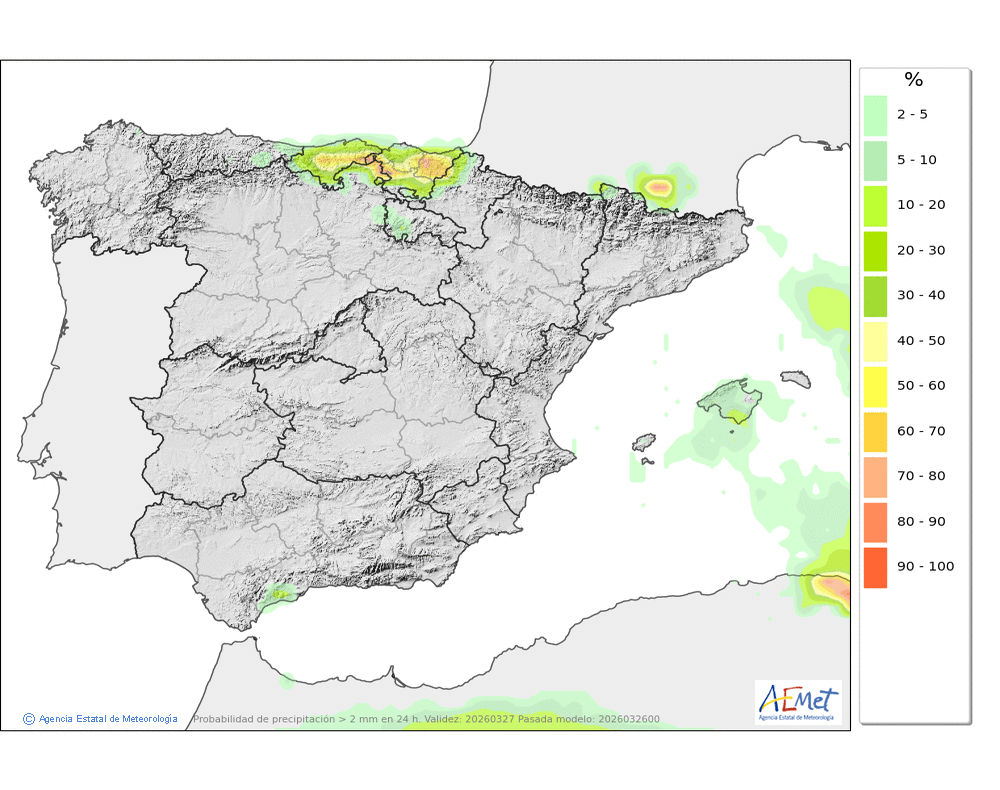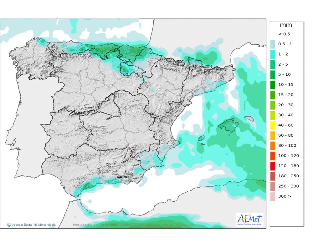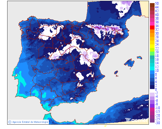 No se descartan algunas débiles y ocasionales a primeras horas en el norte y oeste. Cota de nieve en torno a 500-700 metros.