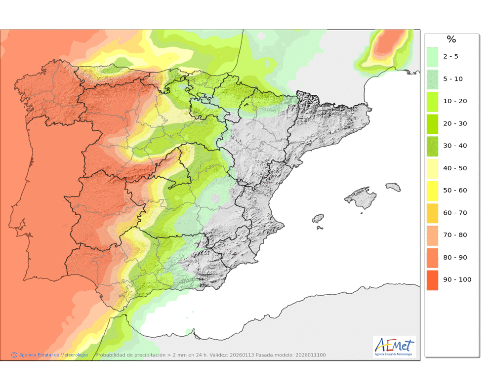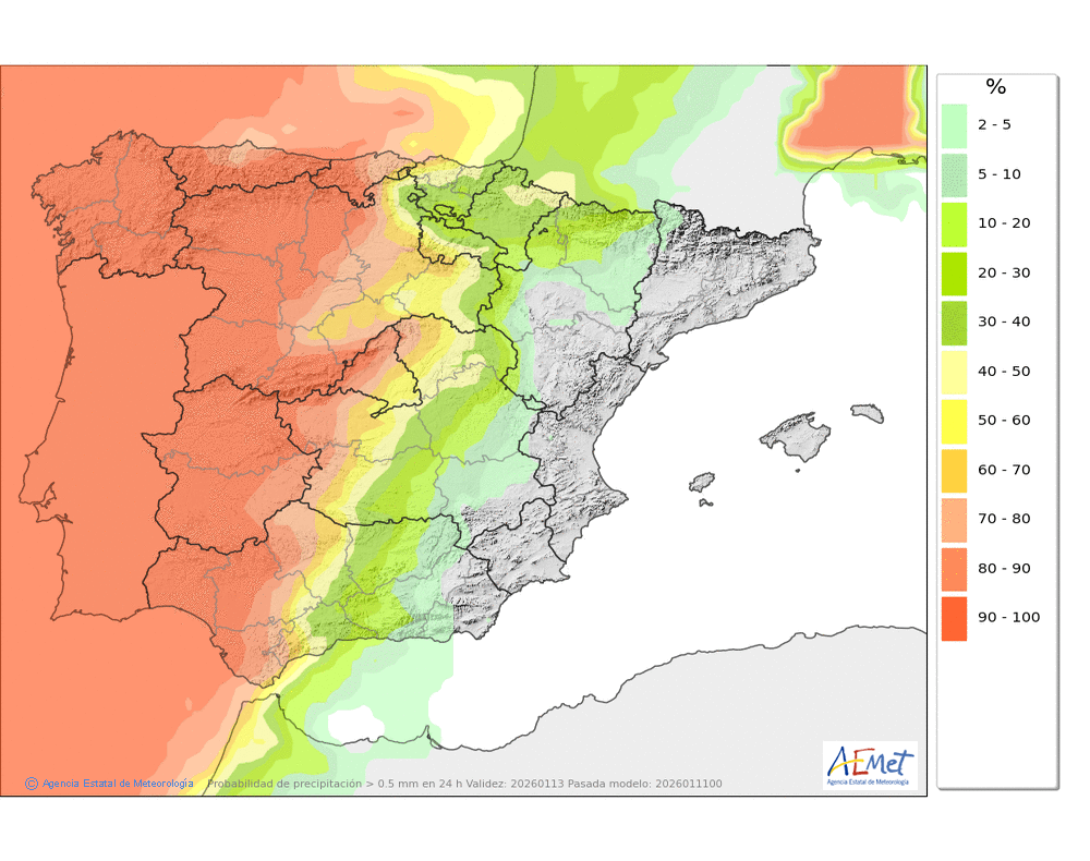 precipitaciones débiles en la divisoria a primeras horas.