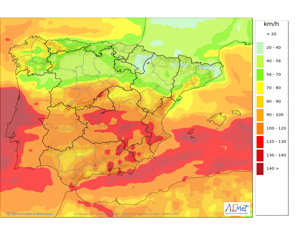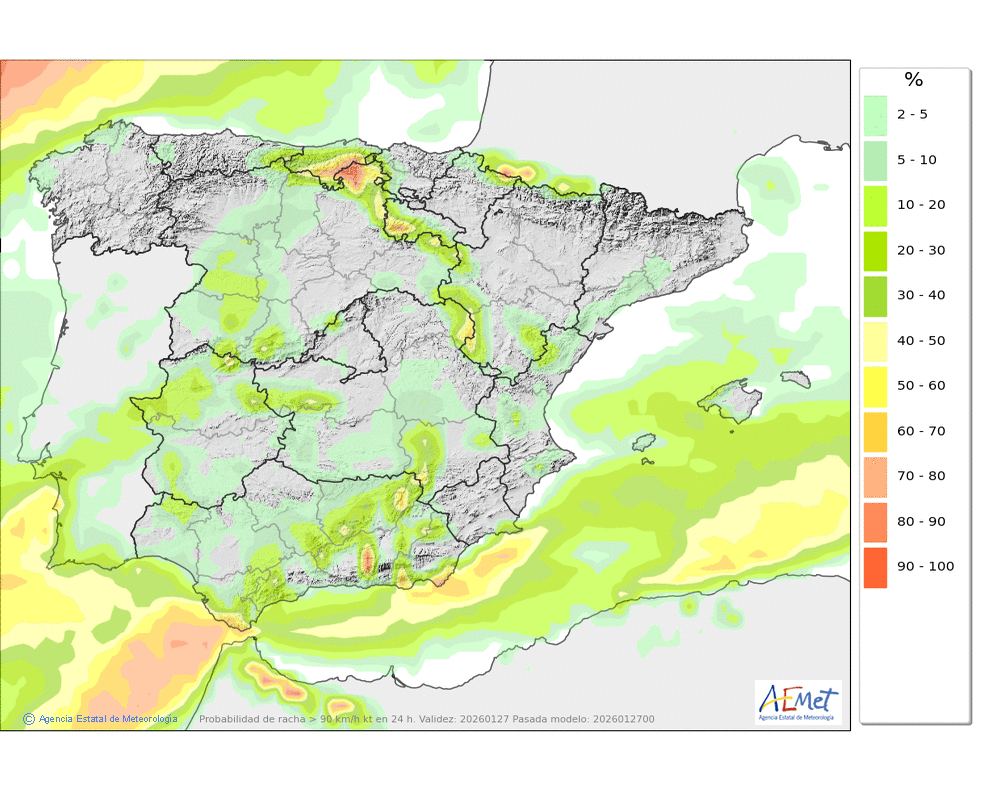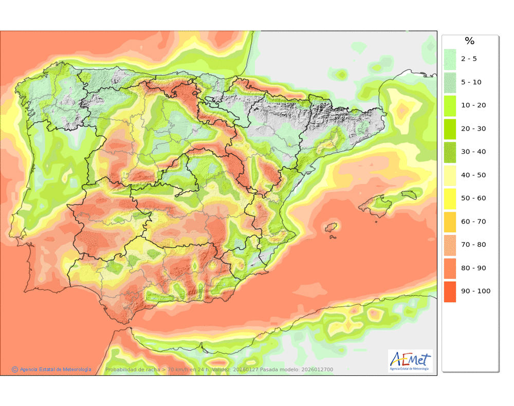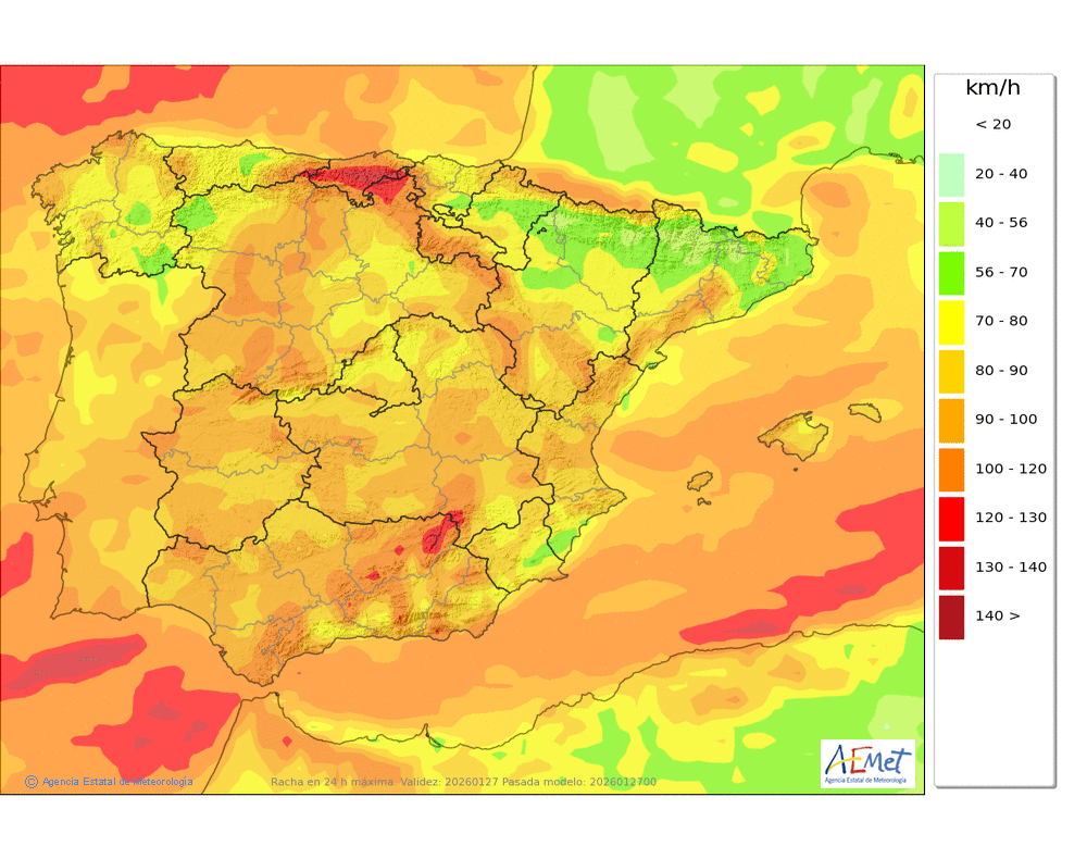Fuerte o muy fuerte del oeste y noroeste, con probables rachas huracanadas (más de 120 km/h) en cotas altas y zonas expuestas.