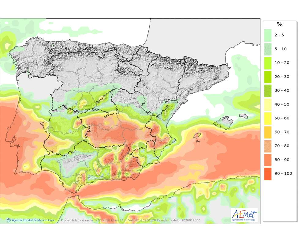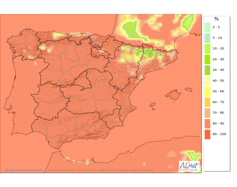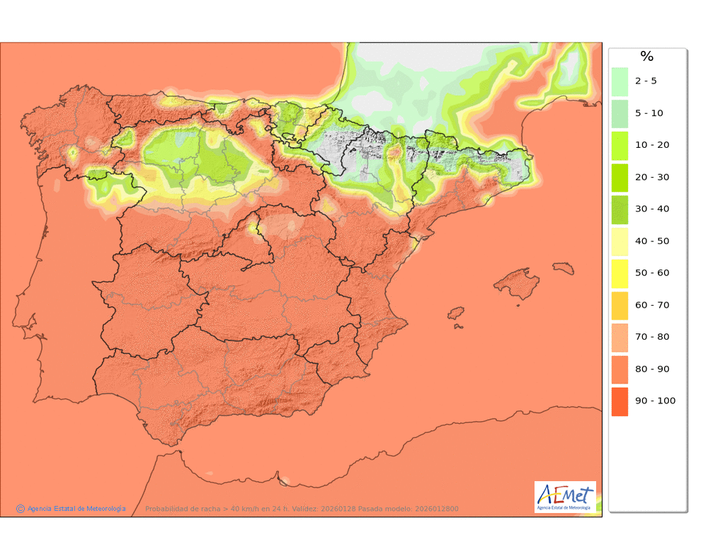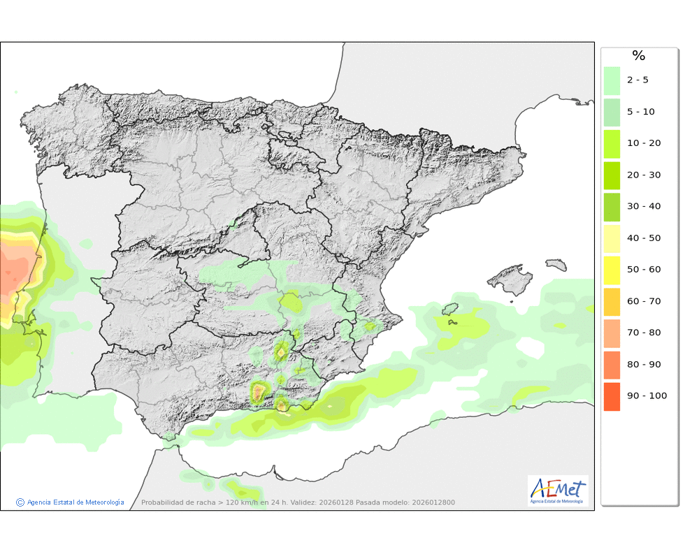 Fuerte o muy fuerte del oeste y noroeste, con probables rachas huracanadas (más de 120 km/h) en cotas altas y zonas expuestas.