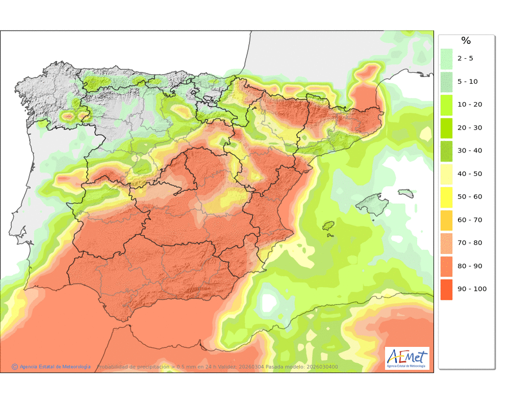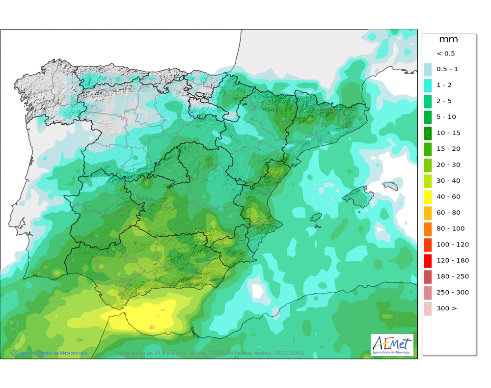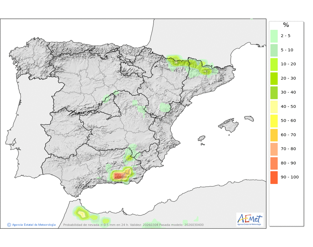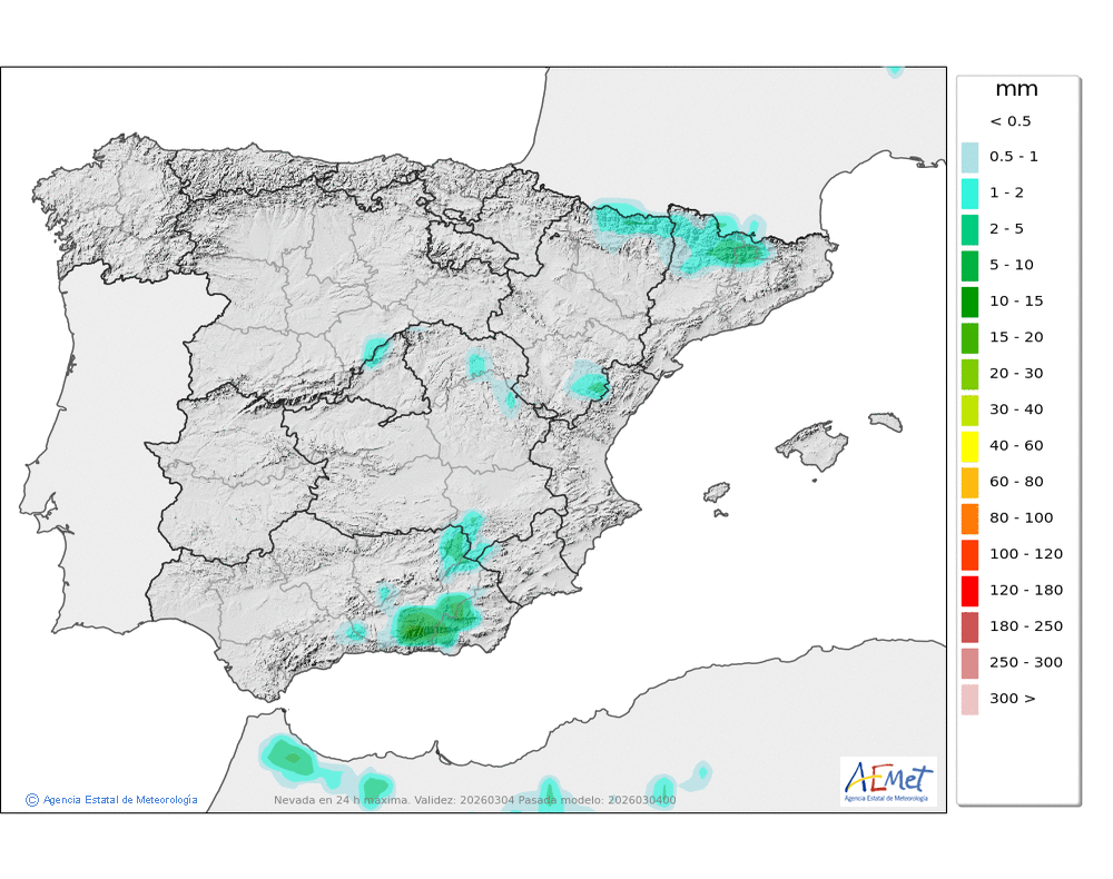 Se esperan moderadas, a veces en forma de chubasco, que podrán ser localmente fuertes por la tarde e ir acompañados de granizo. Cota de nieve: bajando de 2000 a 1500-1700 metros. La precipitación podría arrastrar algo de barro.