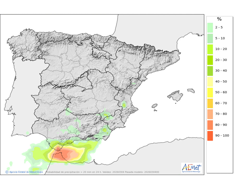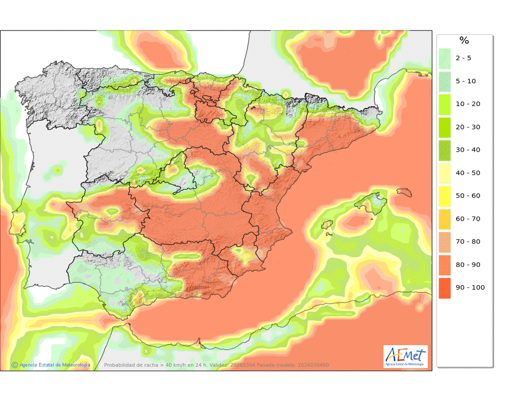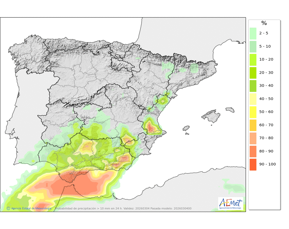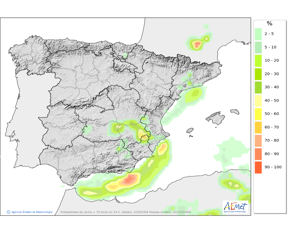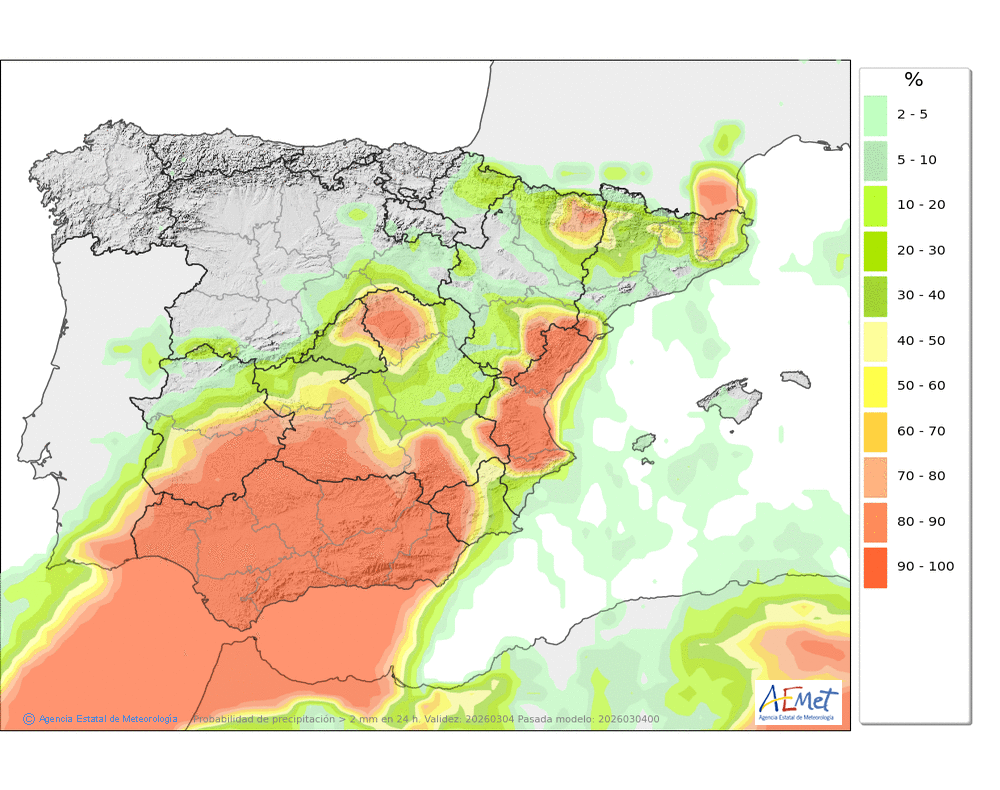 Se esperan moderadas, a veces en forma de chubasco, que podrán ser localmente fuertes por la tarde e ir acompañados de granizo. Cota de nieve: bajando de 2000 a 1500-1700 metros. La precipitación podría arrastrar algo de barro.