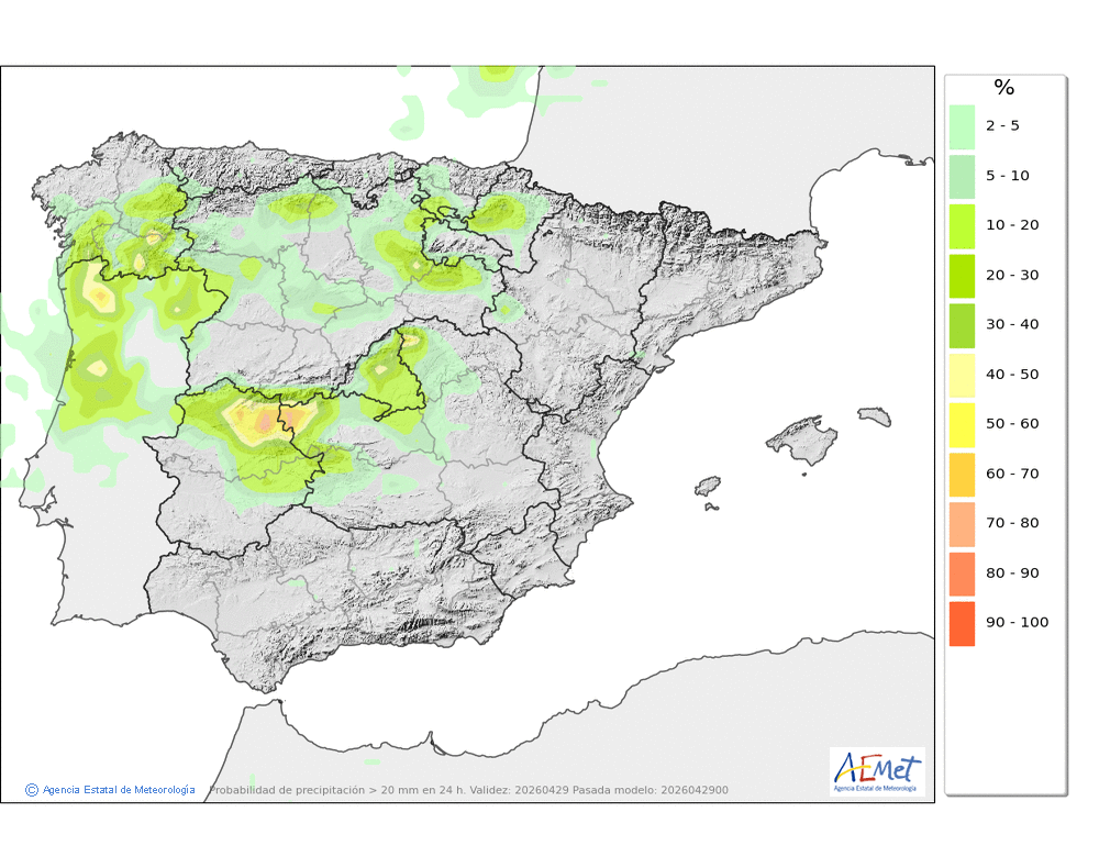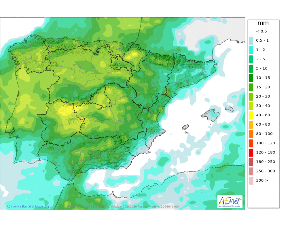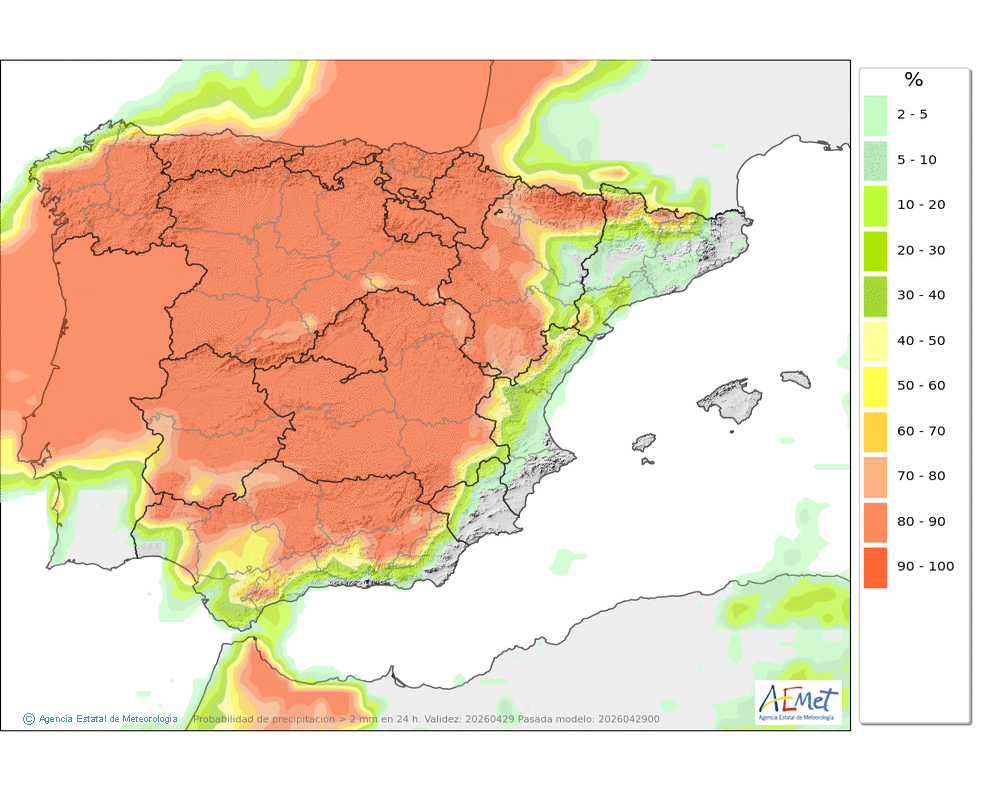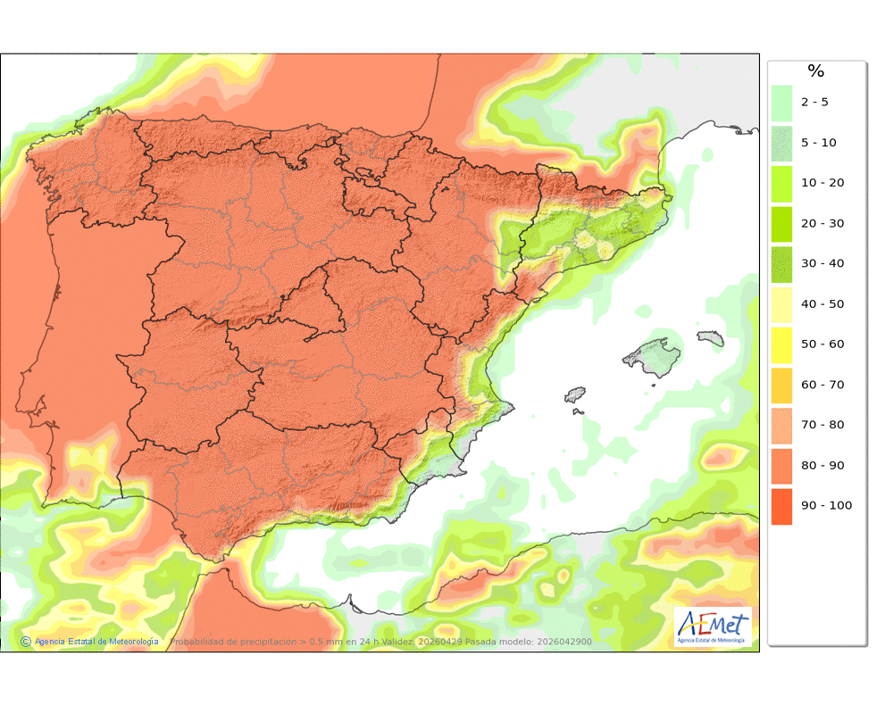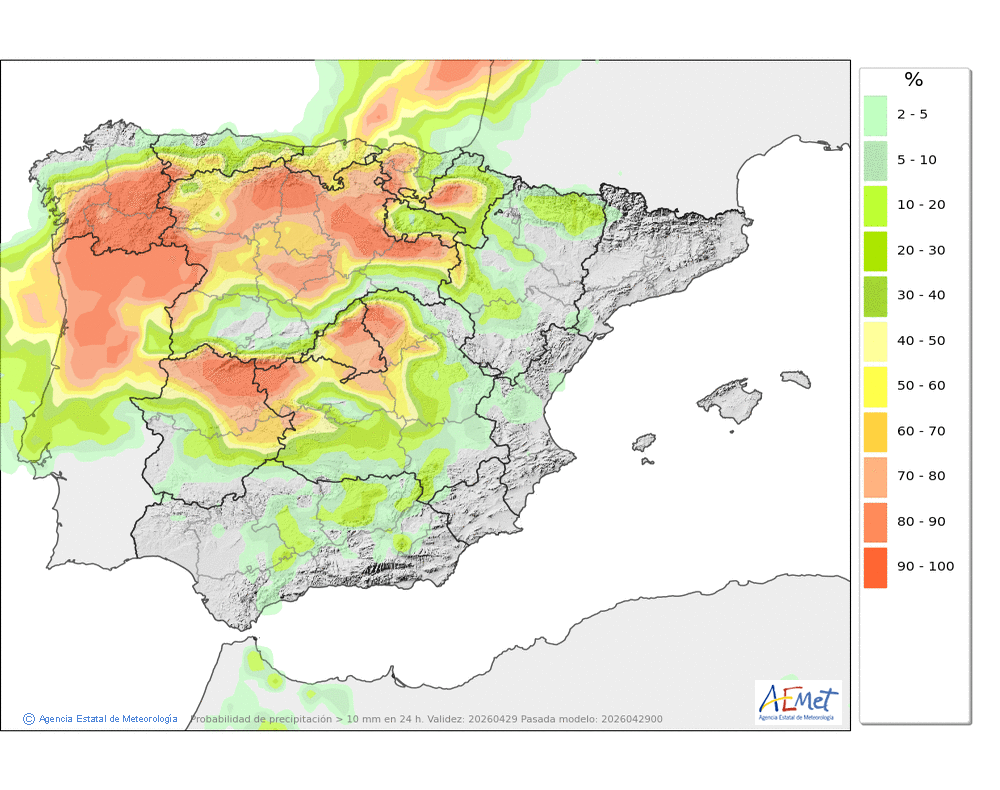 Se esperan chubascos en las horas centrales y por la tarde, que podrían dejar depósitos de barro. Cota de nieve en torno a 2800 metros.
