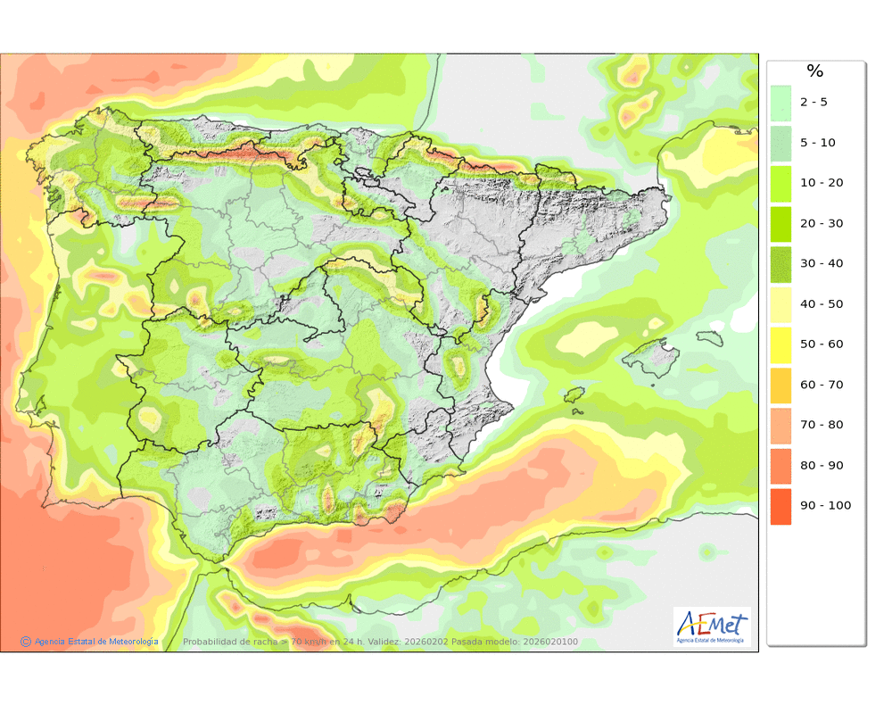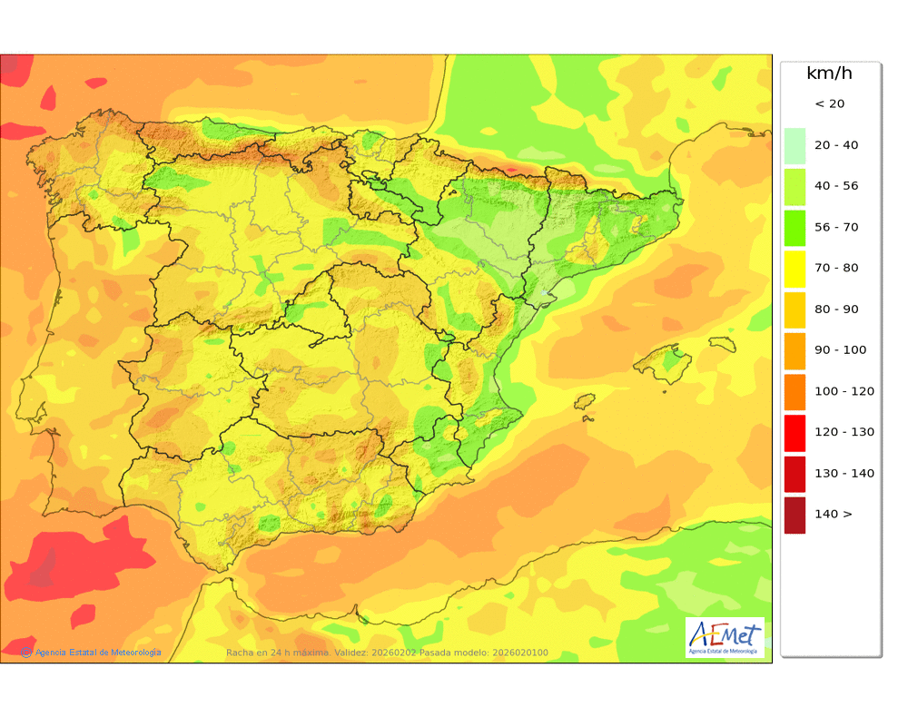 Del sudoeste girando a oeste, moderado o fuerte, con rachas muy fuertes en cotas altas y zonas expuestas.