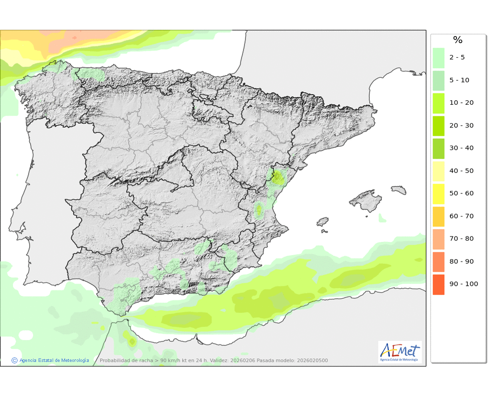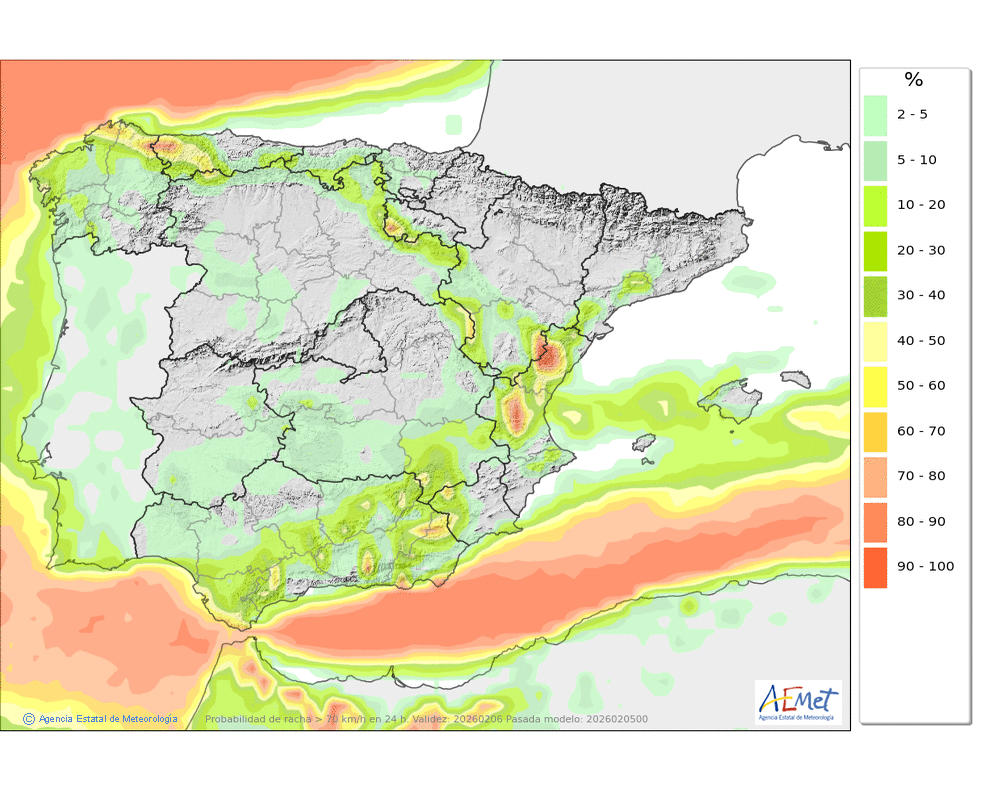 Fuerte de componente oeste, o muy fuerte en cotas altas y zonas expuestas, con rachas que podrán superar los 100 km/h.