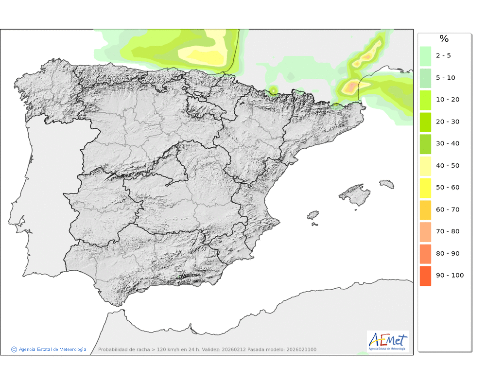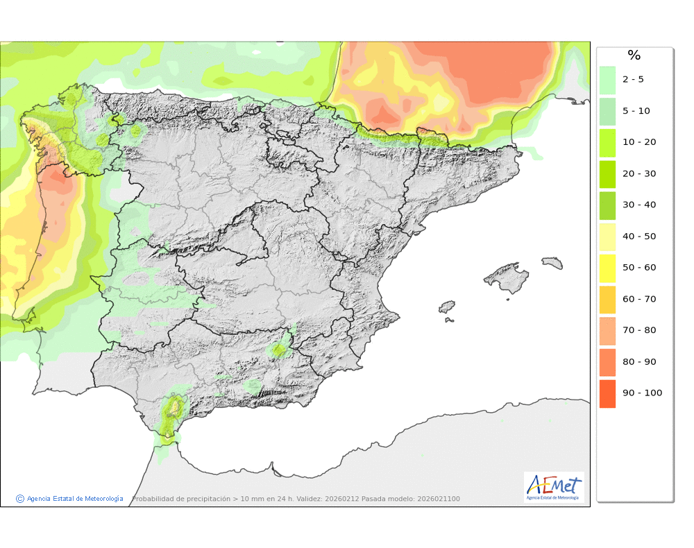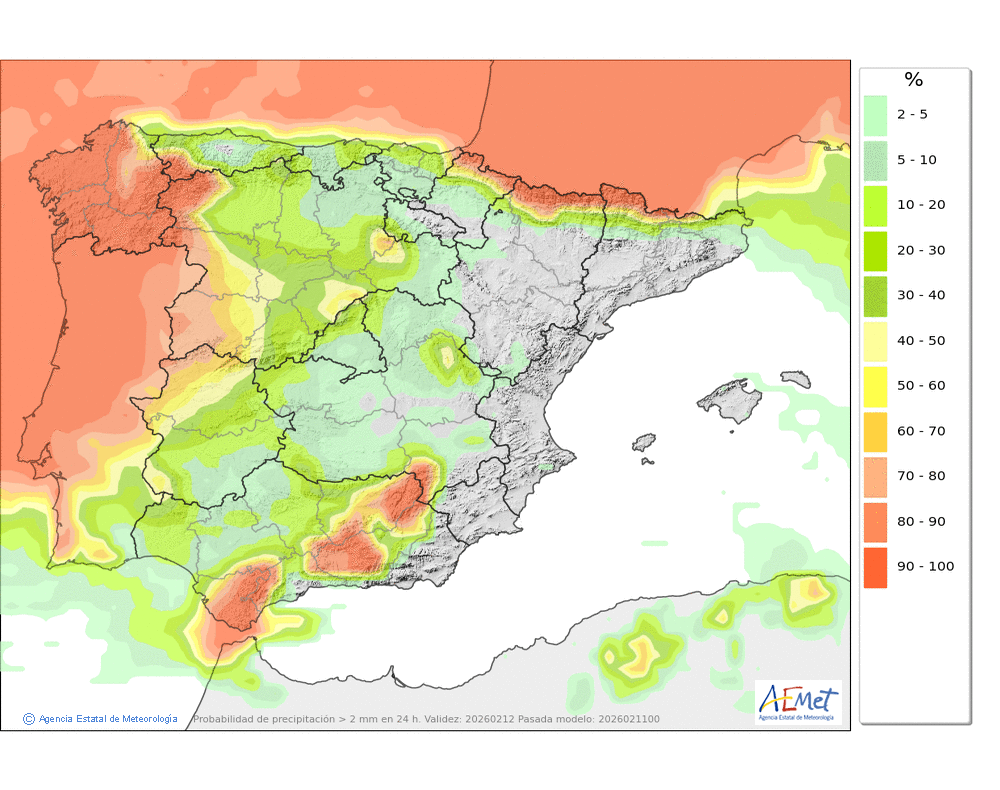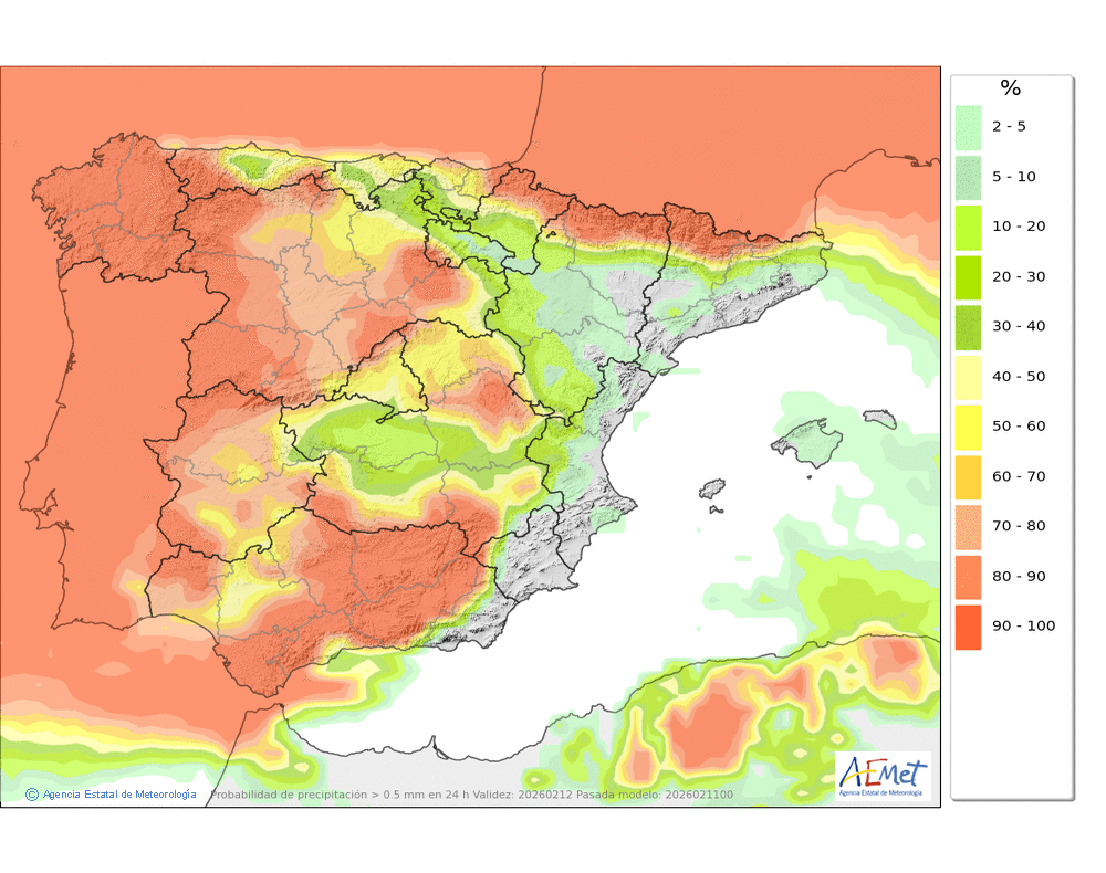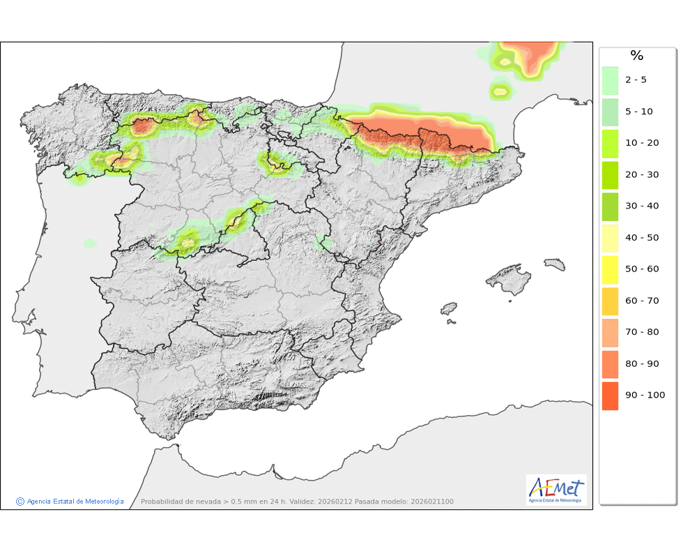 Se esperan precipitaciones moderadas a partir de media mañana, en ocasiones en forma de chubascos. Cota de nieve: bajando de 2.200 a 1.200 ó 1.400 metros.