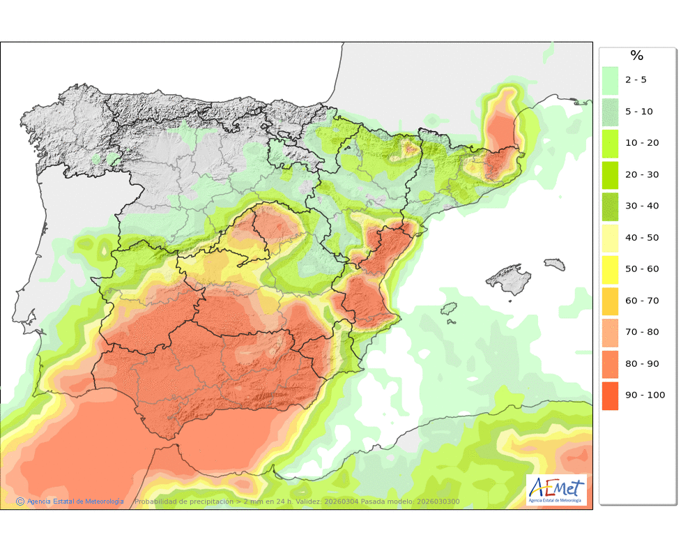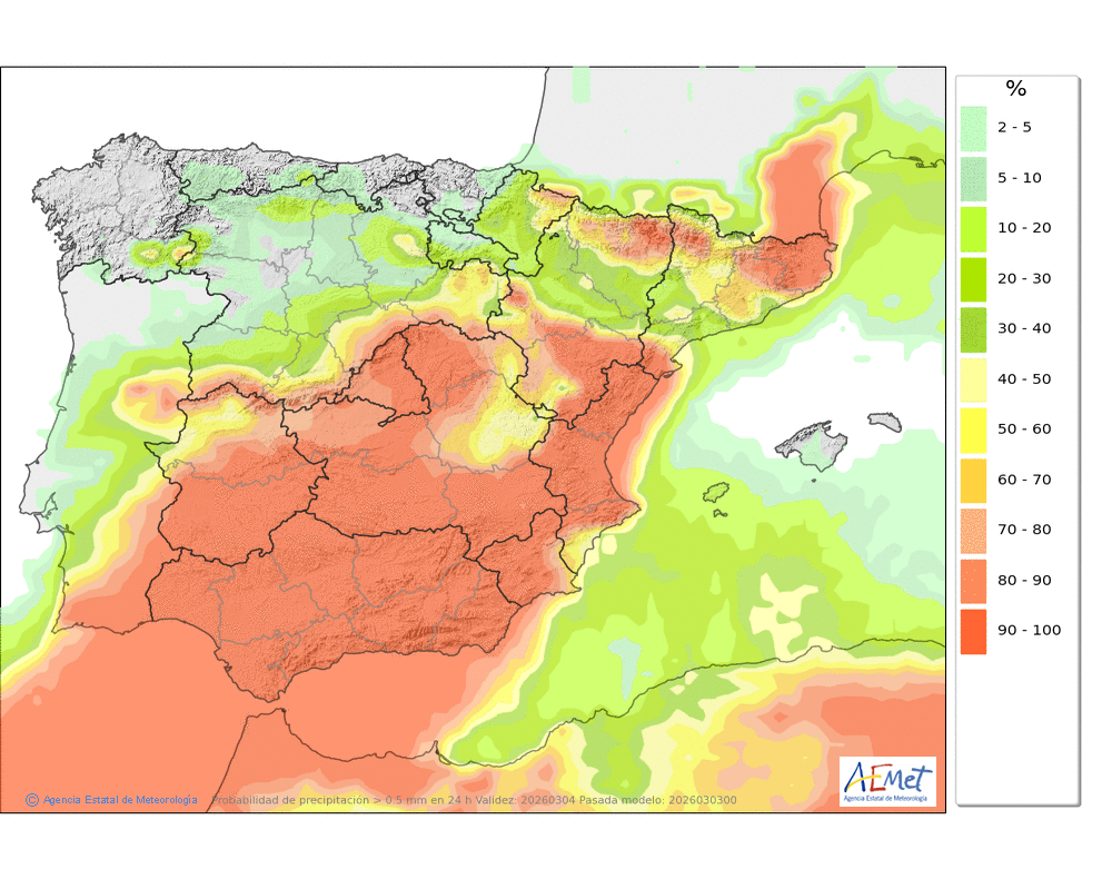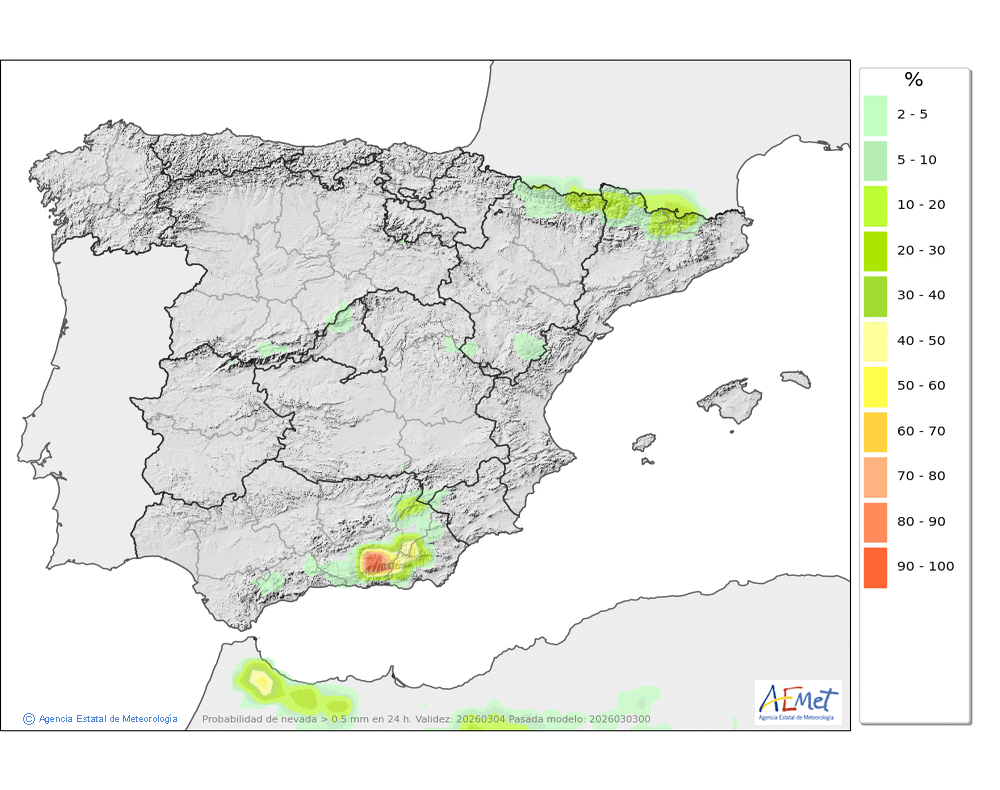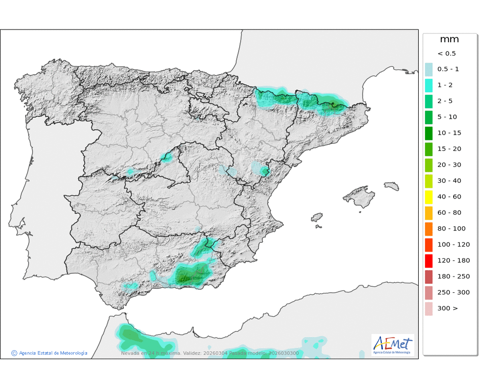Se esperan moderadas, a veces en forma de chubasco, que podrán ser localmente fuertes por la tarde e ir acompañados de granizo. Cota de nieve: bajando de 2000 a 1500-1700 metros. La precipitación podría arrastrar algo de barro.