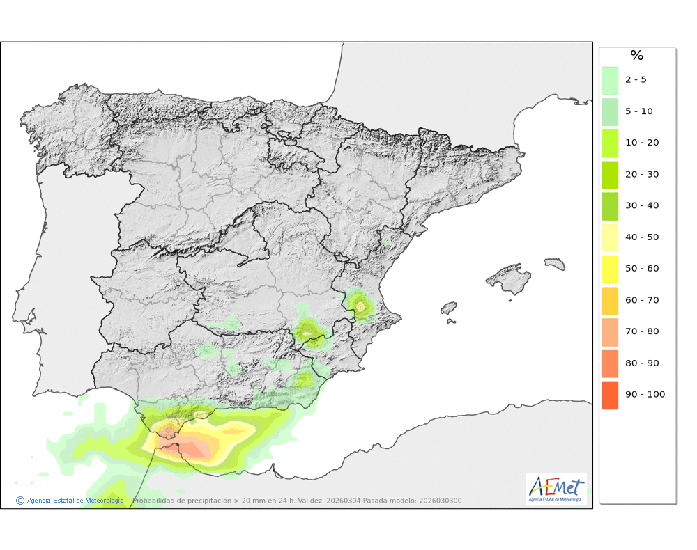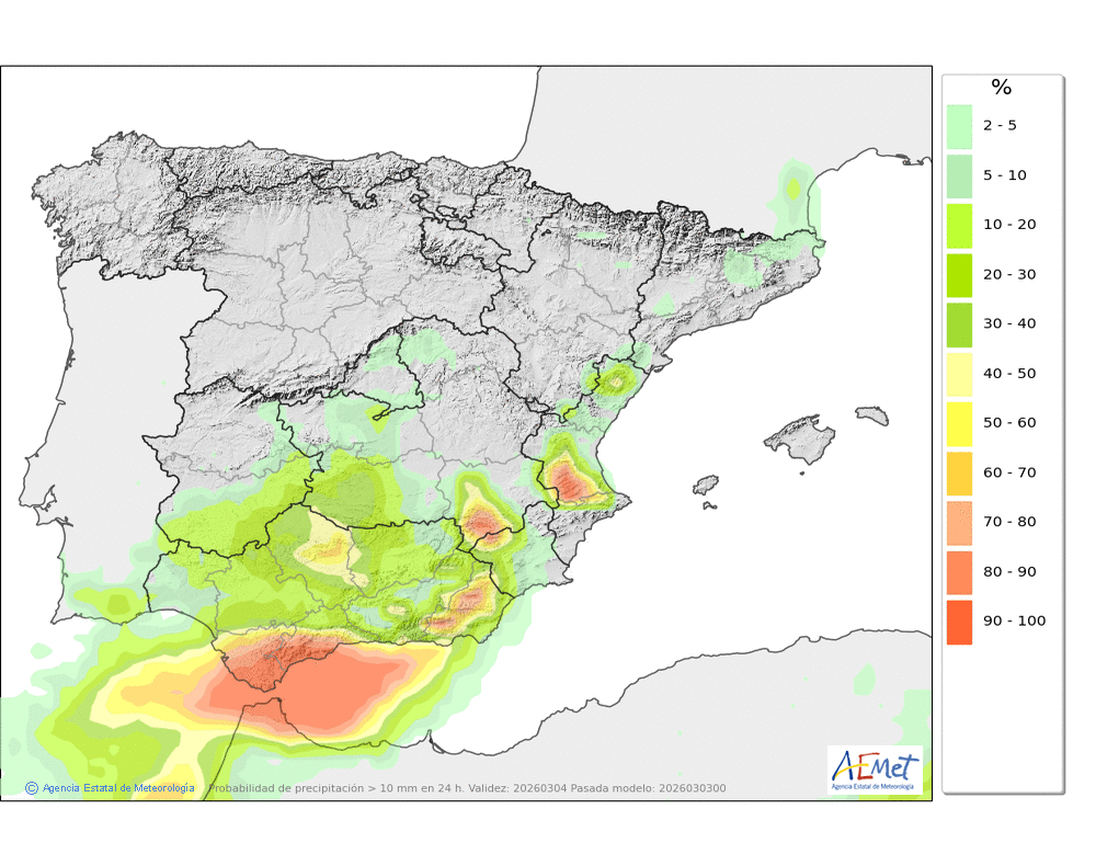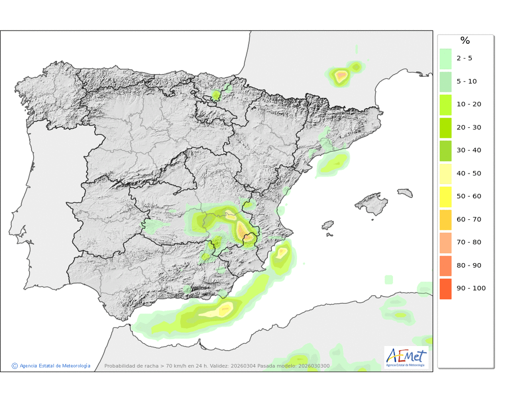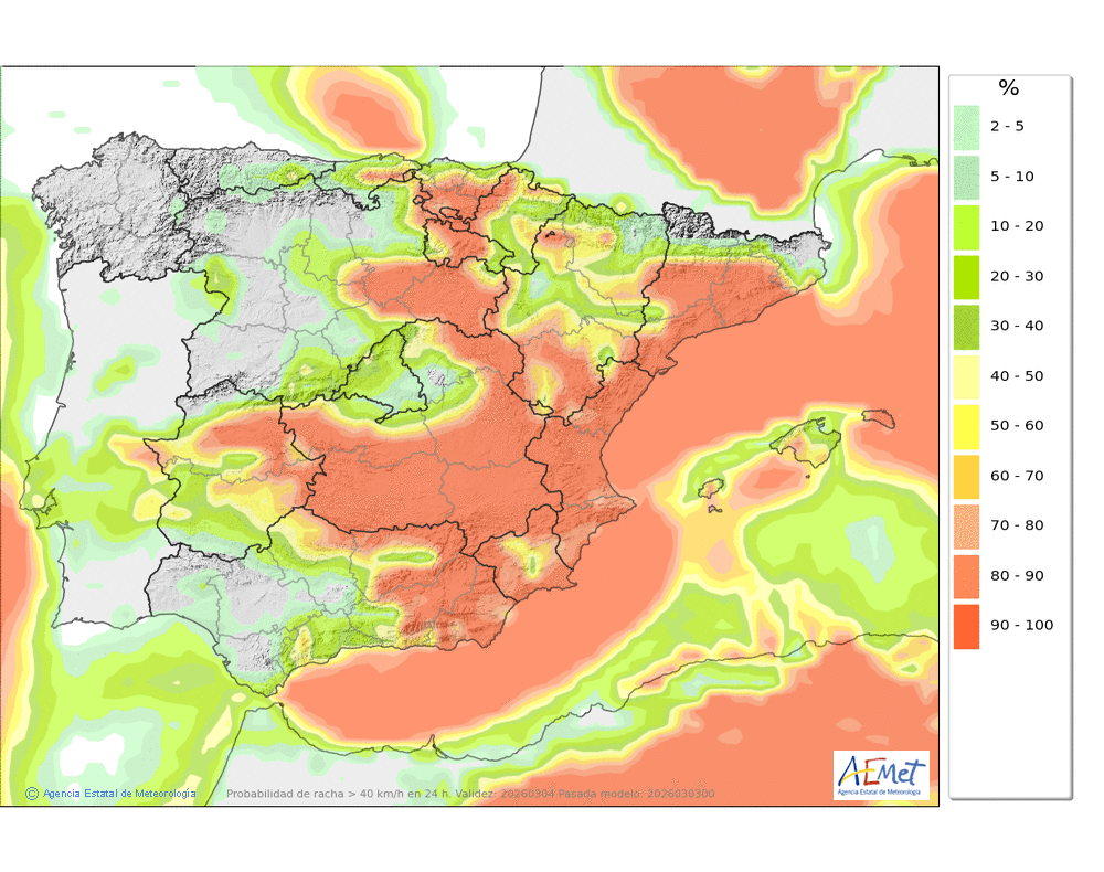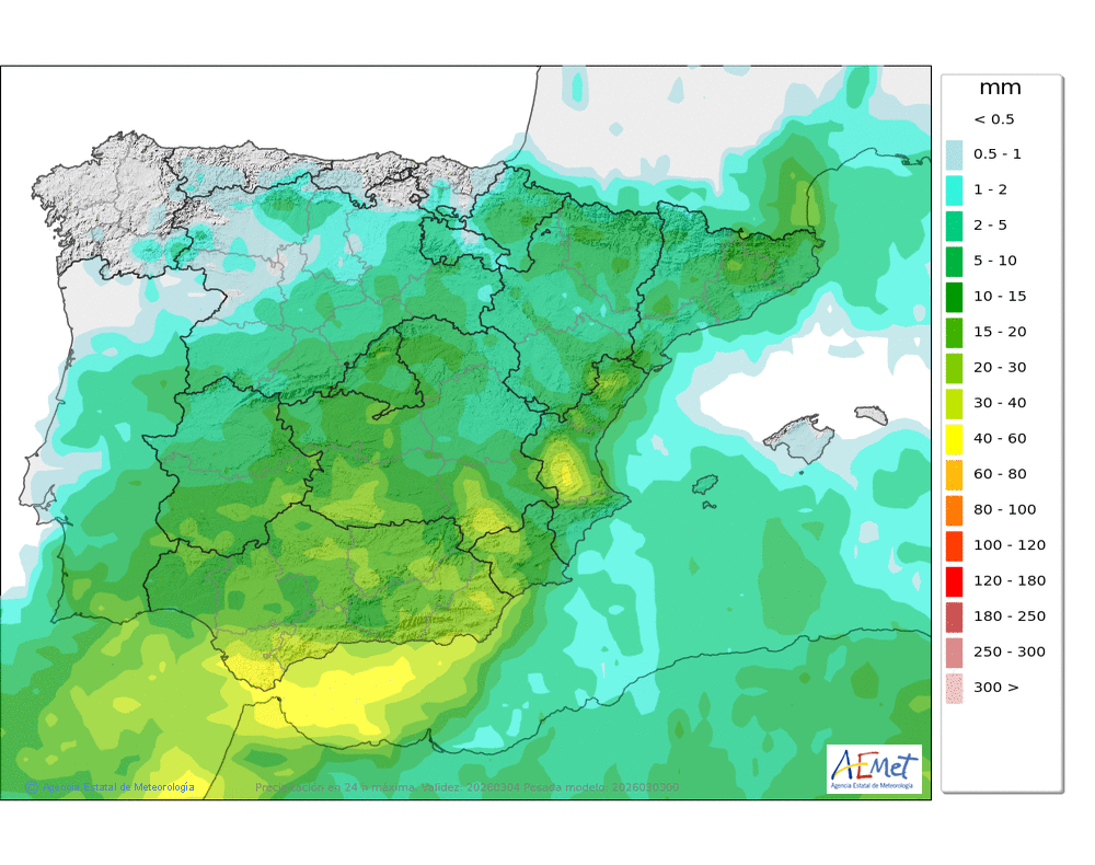 Se esperan moderadas, a veces en forma de chubasco, que podrán ser localmente fuertes por la tarde e ir acompañados de granizo. Cota de nieve: bajando de 2000 a 1500-1700 metros. La precipitación podría arrastrar algo de barro.
